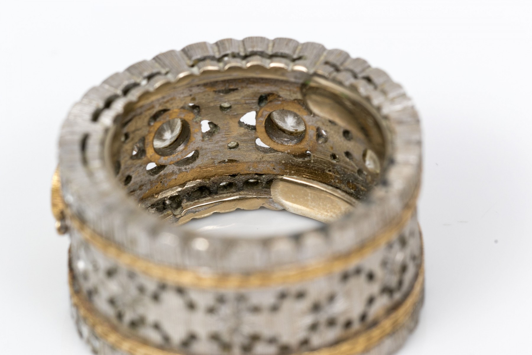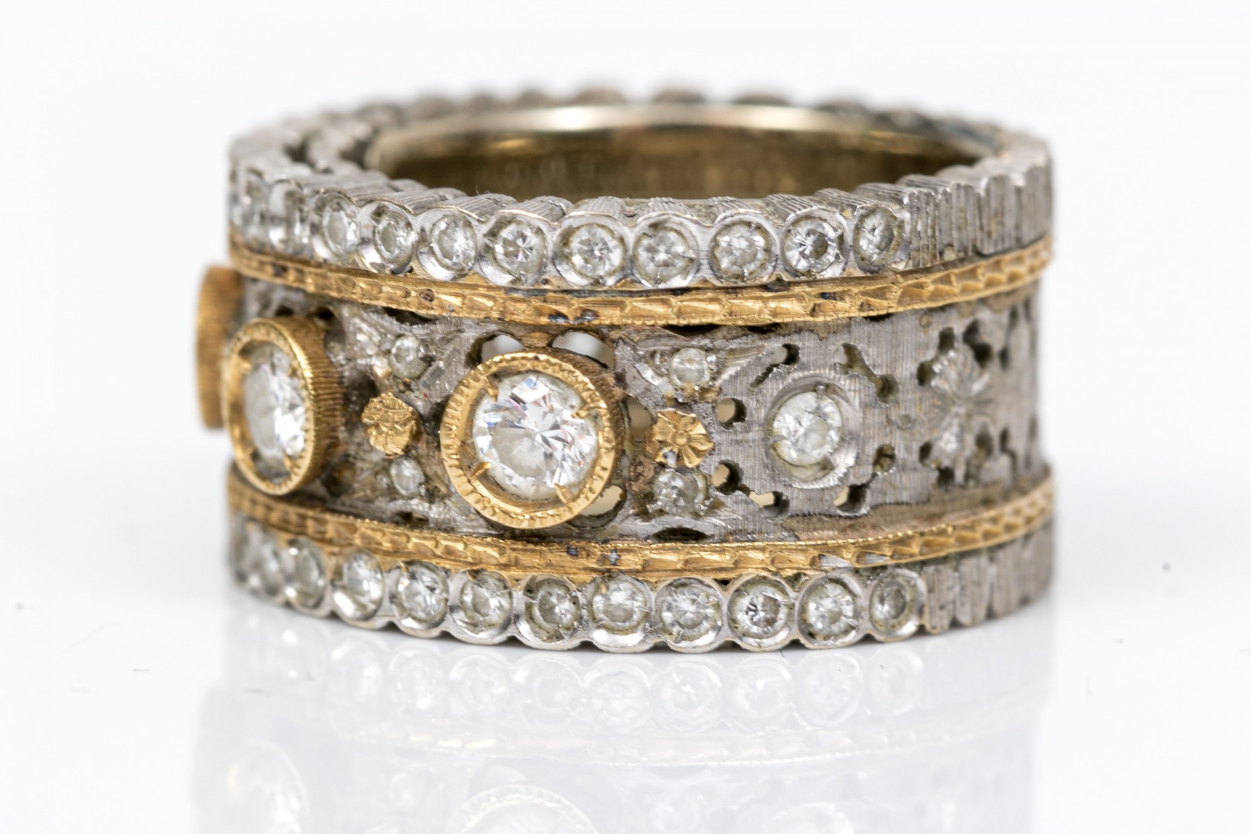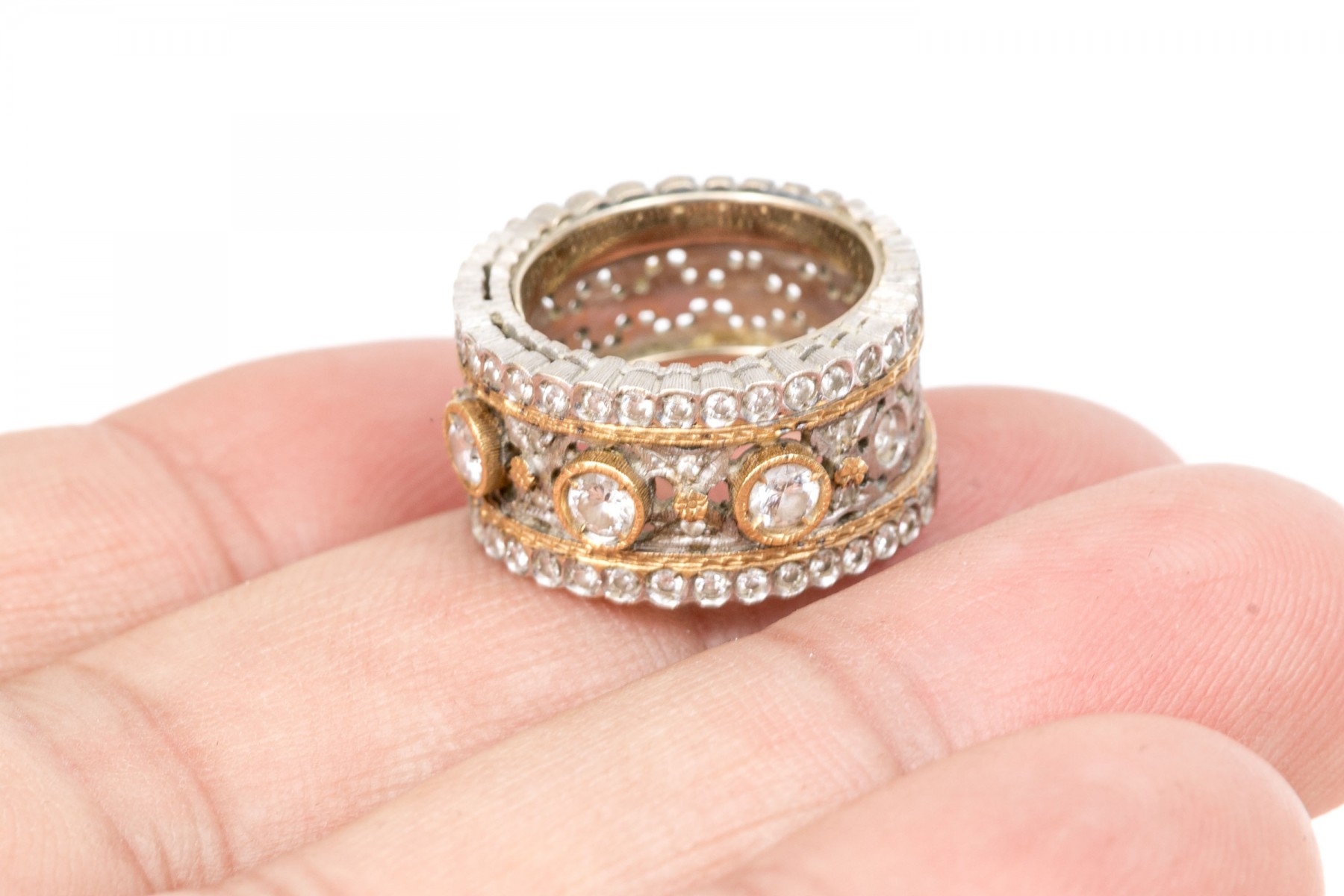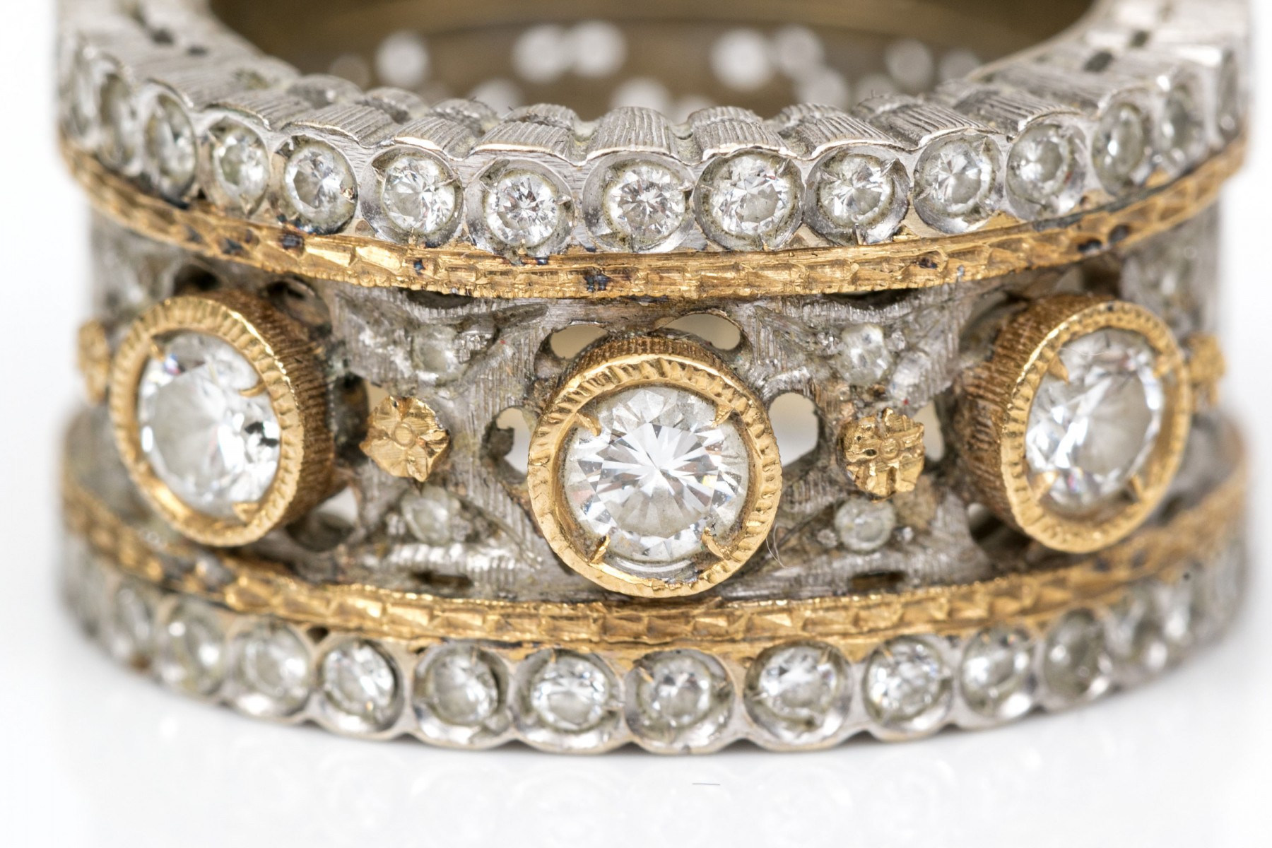 Stunning 18K white and yellow gold wide band ring. Three round brilliant cut diamonds sir over the center white gold band with yellow gold accents. Set into the scalloped edges are macle cut diamonds. Diamonds are approximately 0.42 TCW. Ring size 5.25.