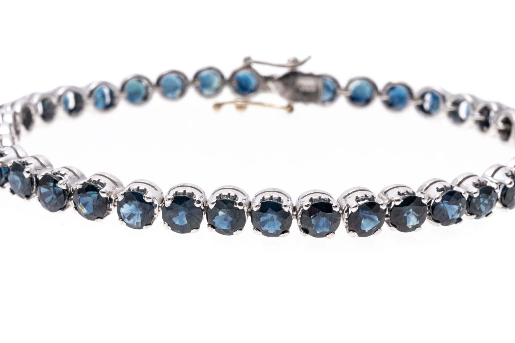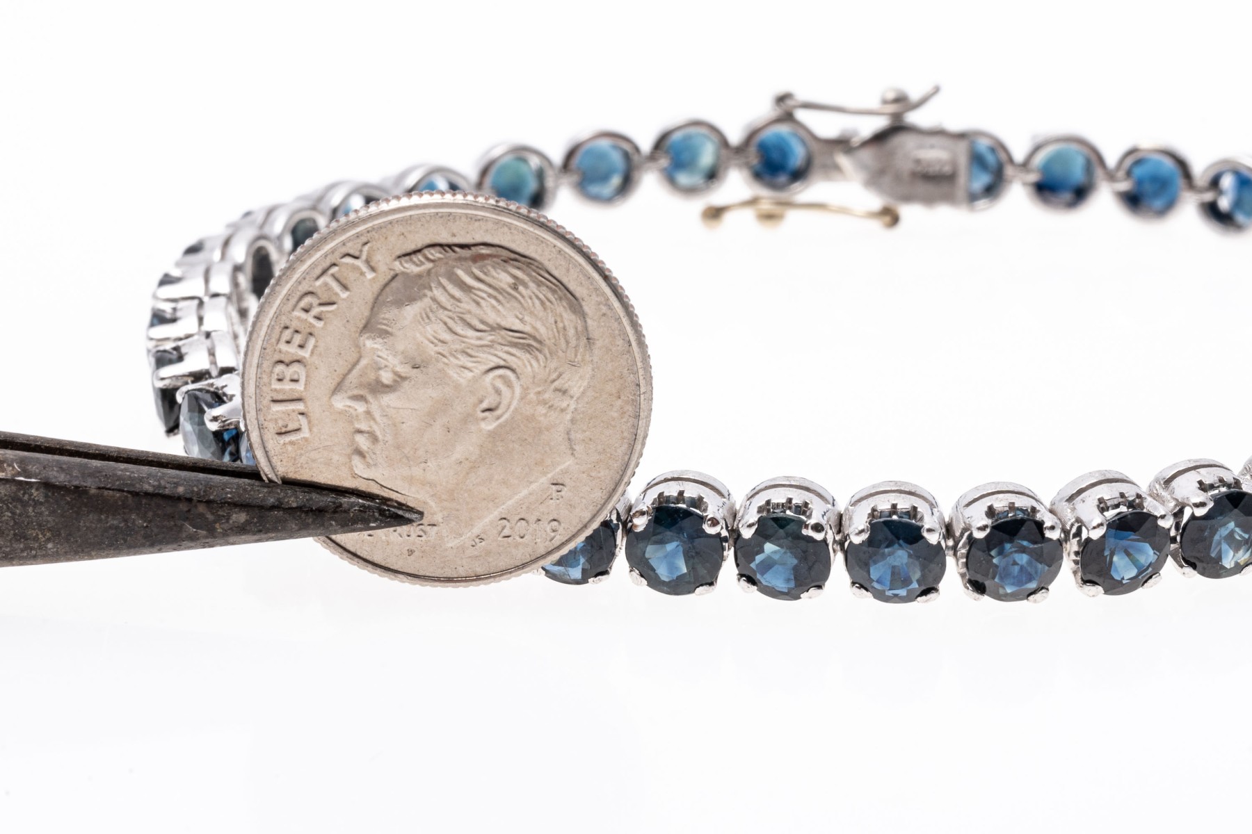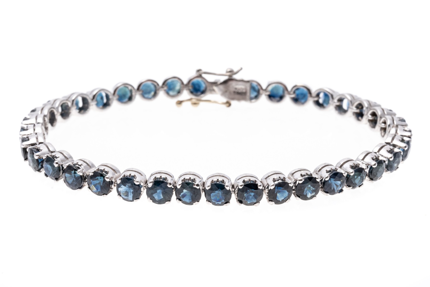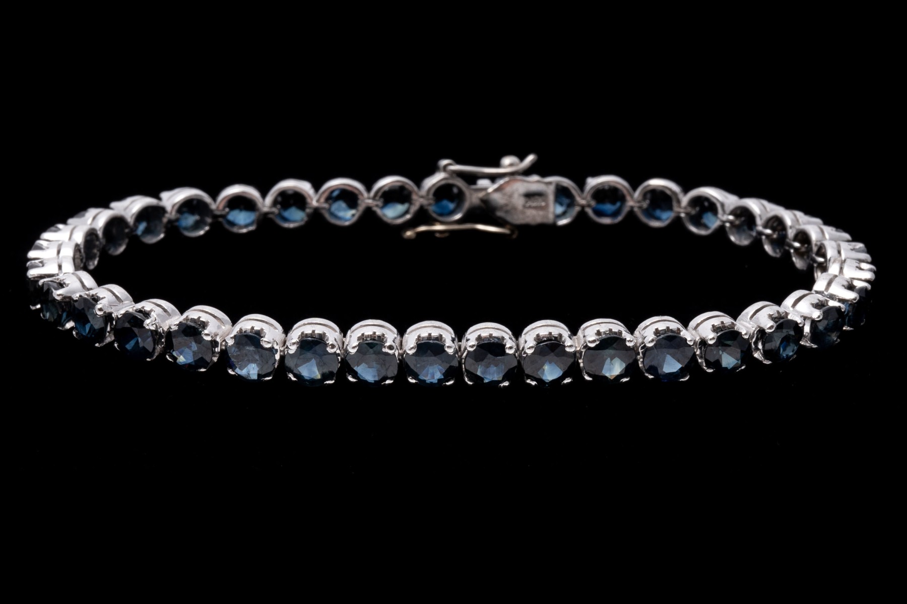 A timeless 18K white gold line bracelet displaying thirty-seven round cut sapphires with deep indigo blue tones. The box style clasp has a has two safety latches for added security. Sapphires approximately 7.5 TCW.