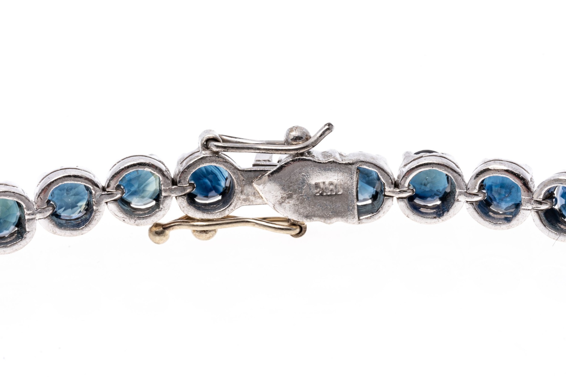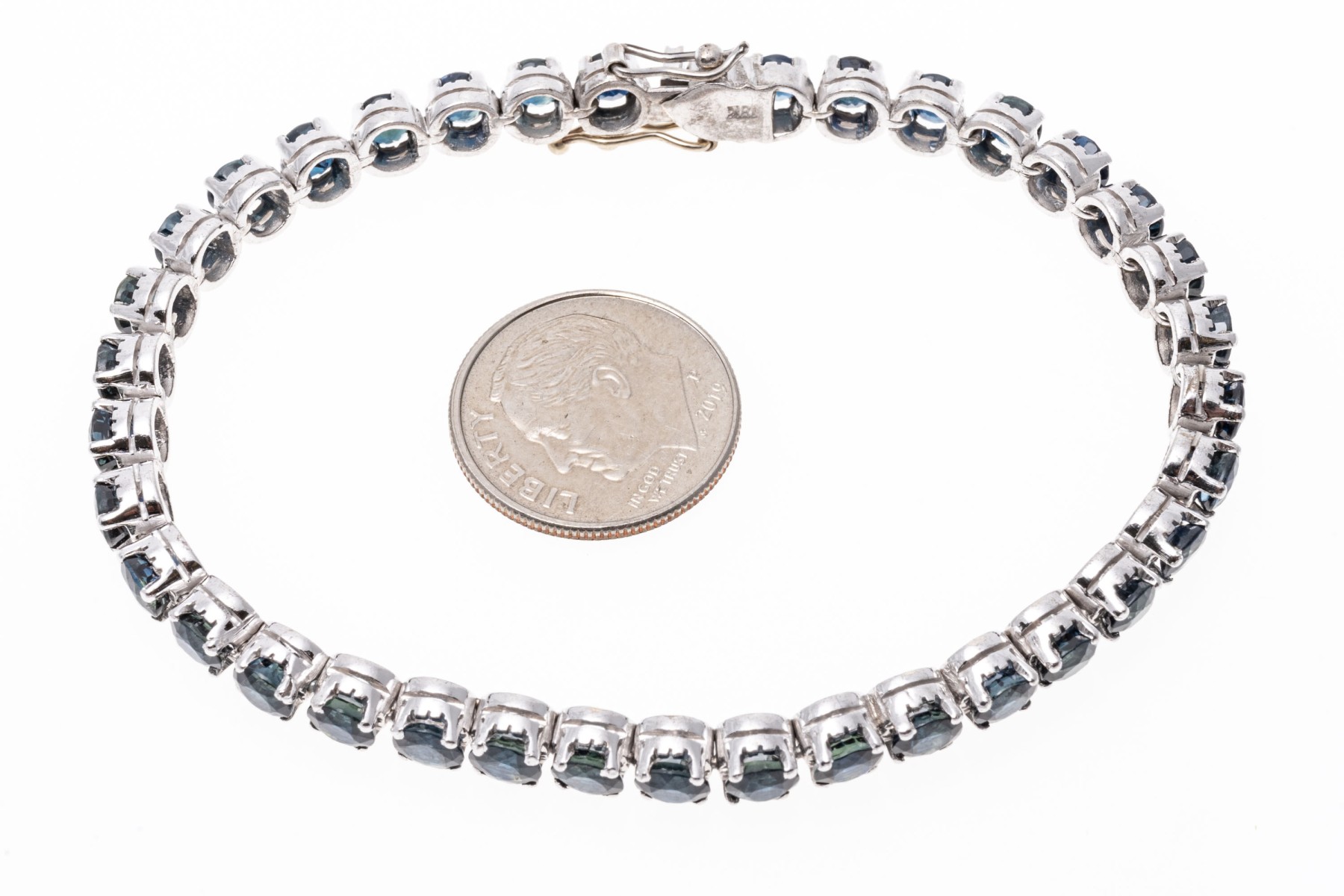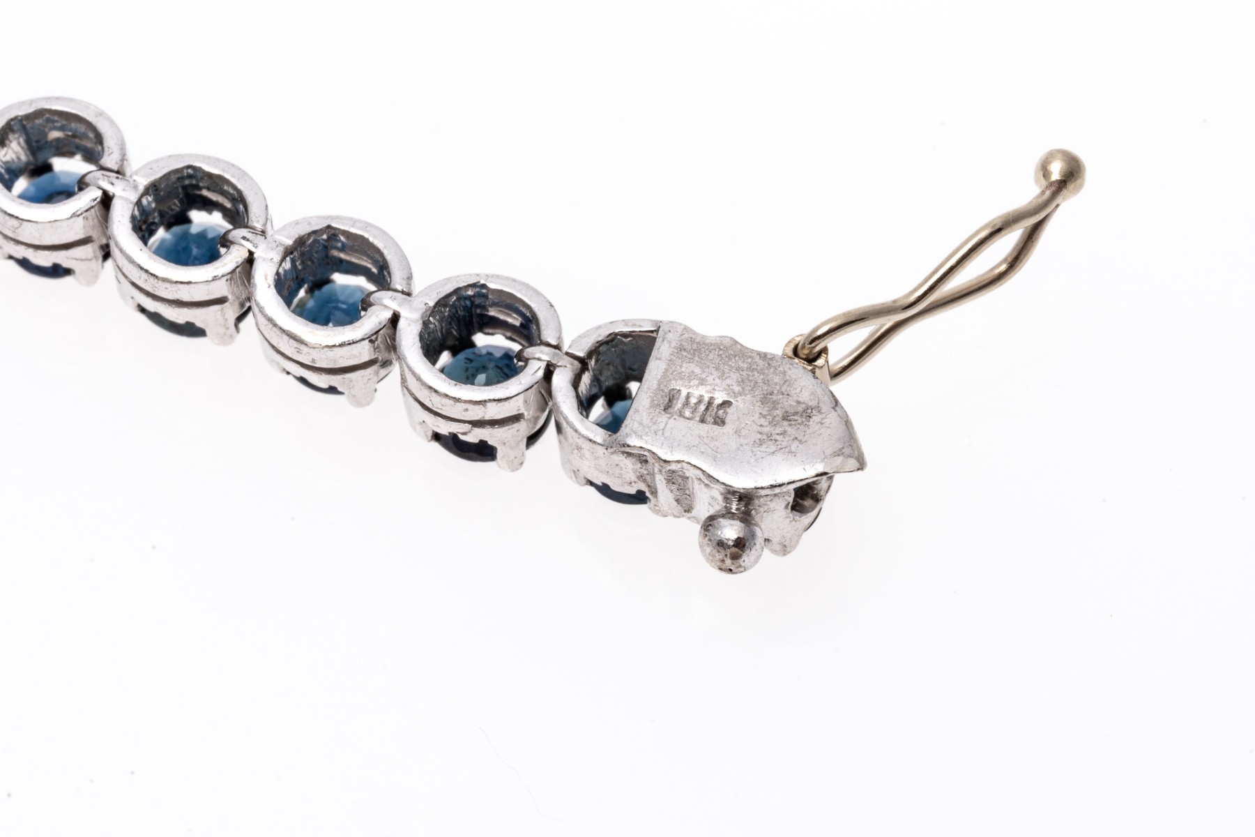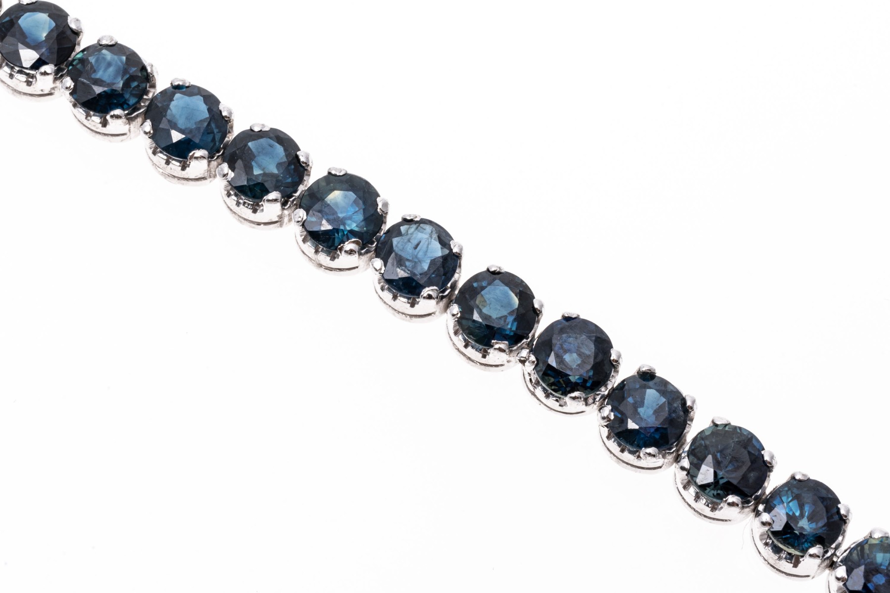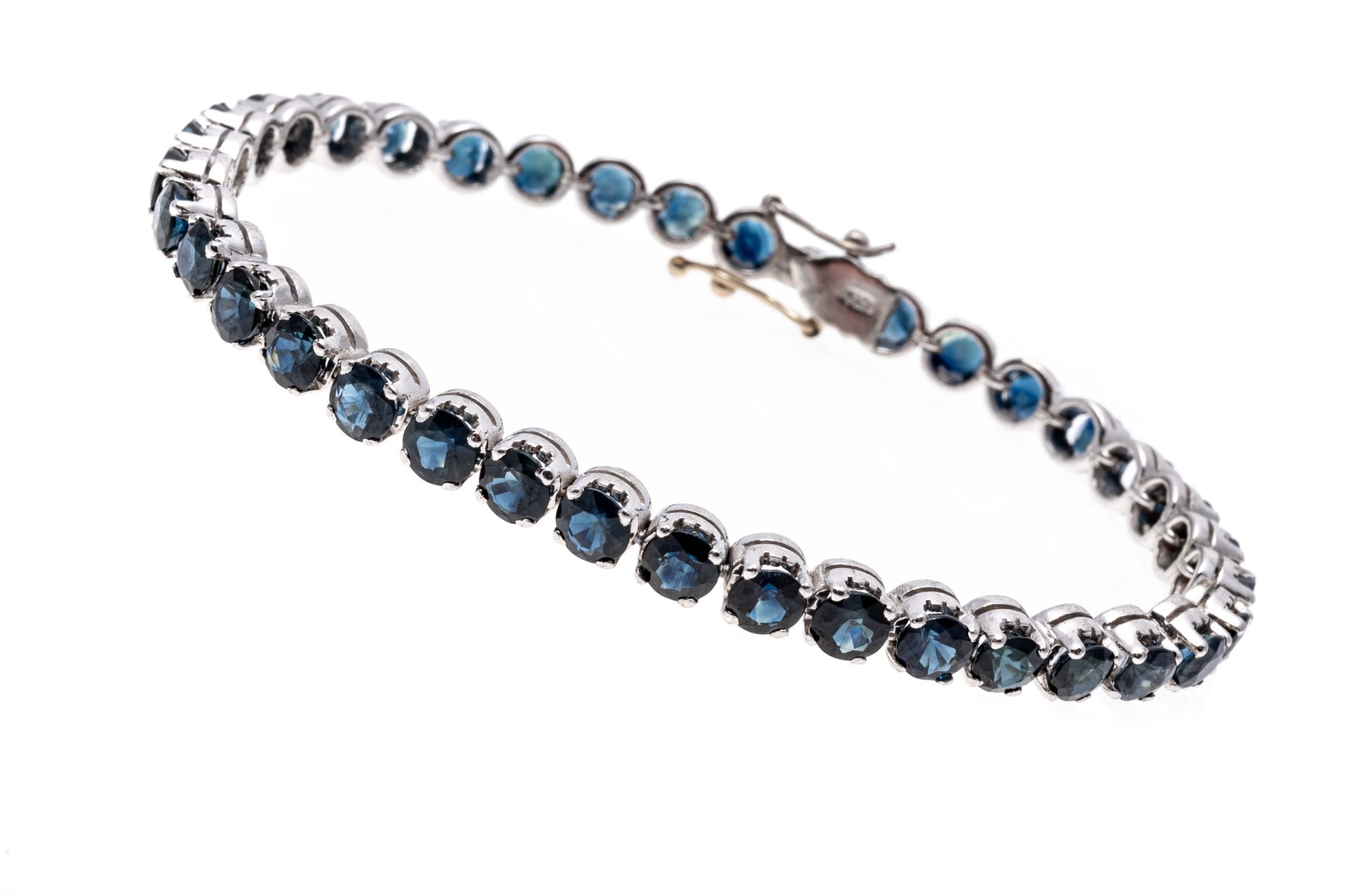 A timeless 18K white gold line bracelet displaying thirty-seven round cut sapphires with deep indigo blue tones. The box style clasp has a has two safety latches for added security. Sapphires approximately 7.5 TCW.