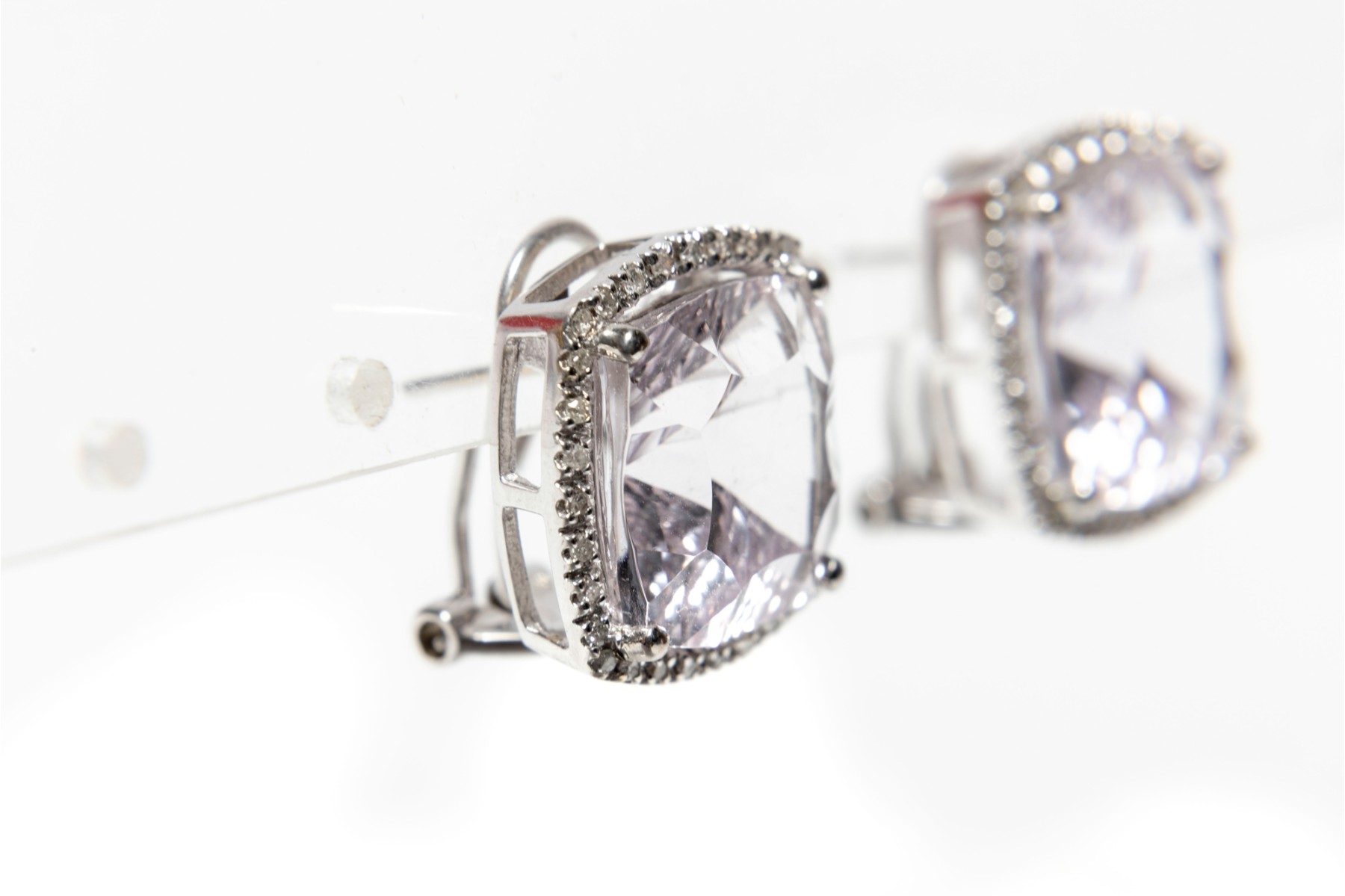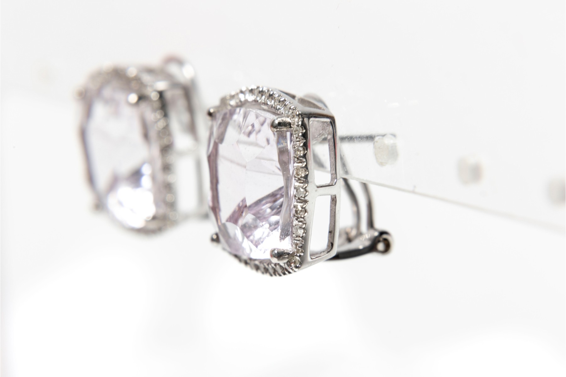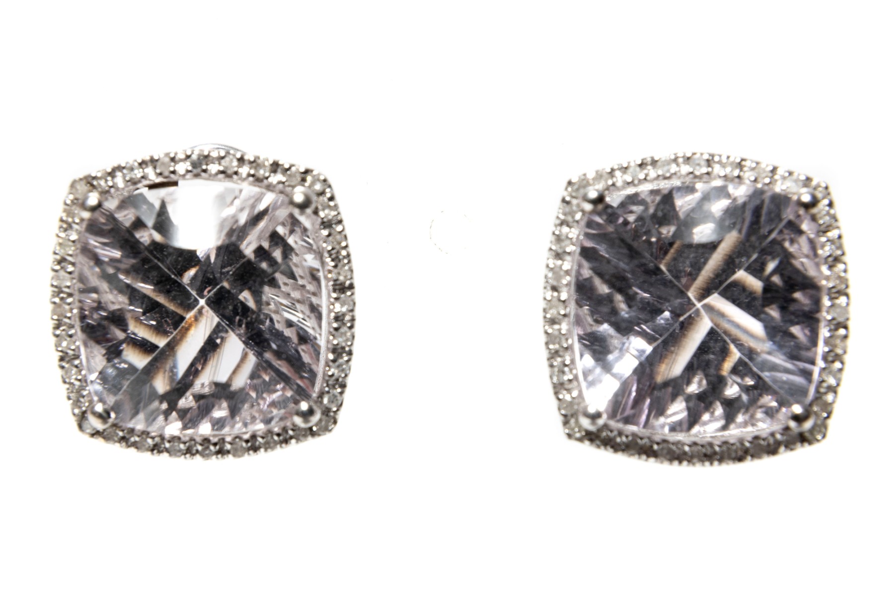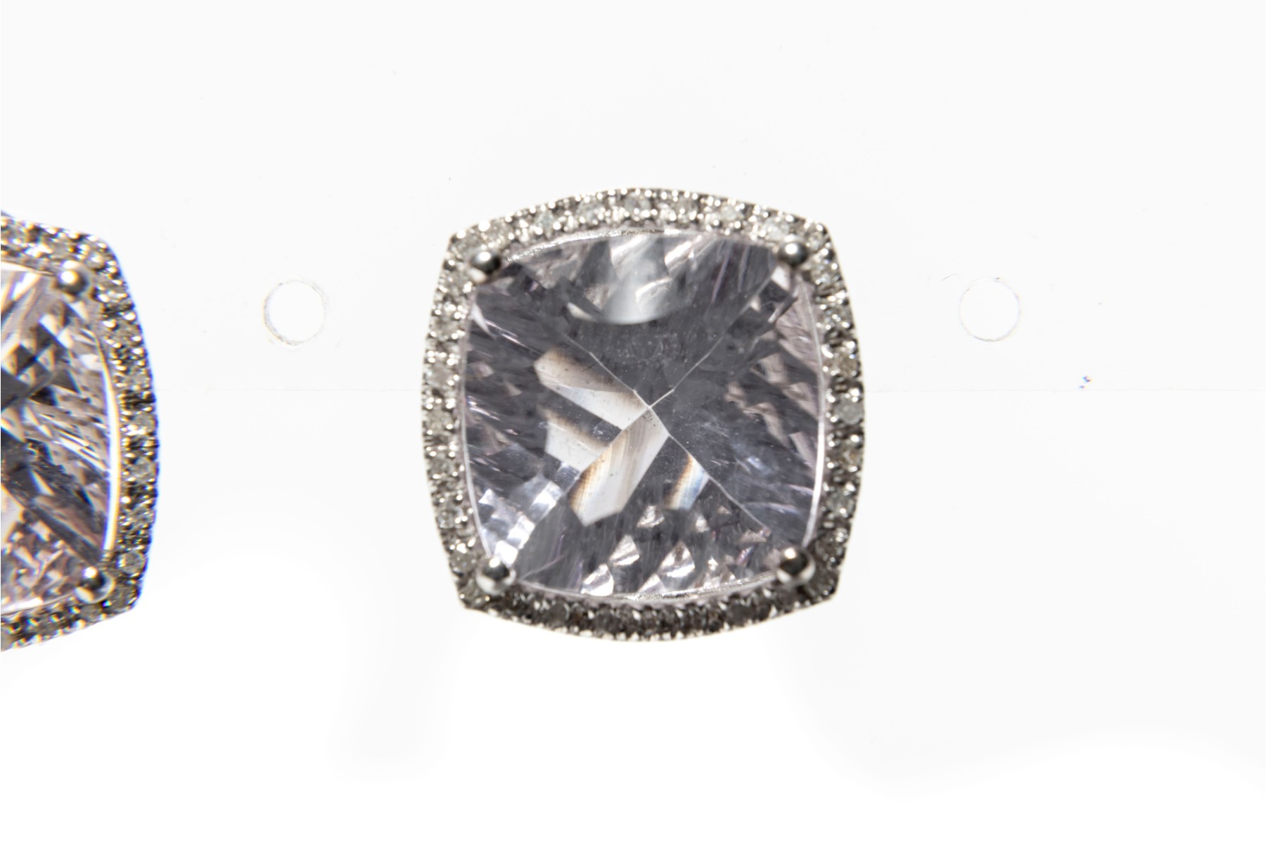 A pair of excellent white gold stud earrings displaying cushion fantasy cut amethysts in delicate, pale purple, surrounded by dainty diamond halos. The amethysts are approximately 11.94 TCW and the diamonds are approximately 11.94 TCW.