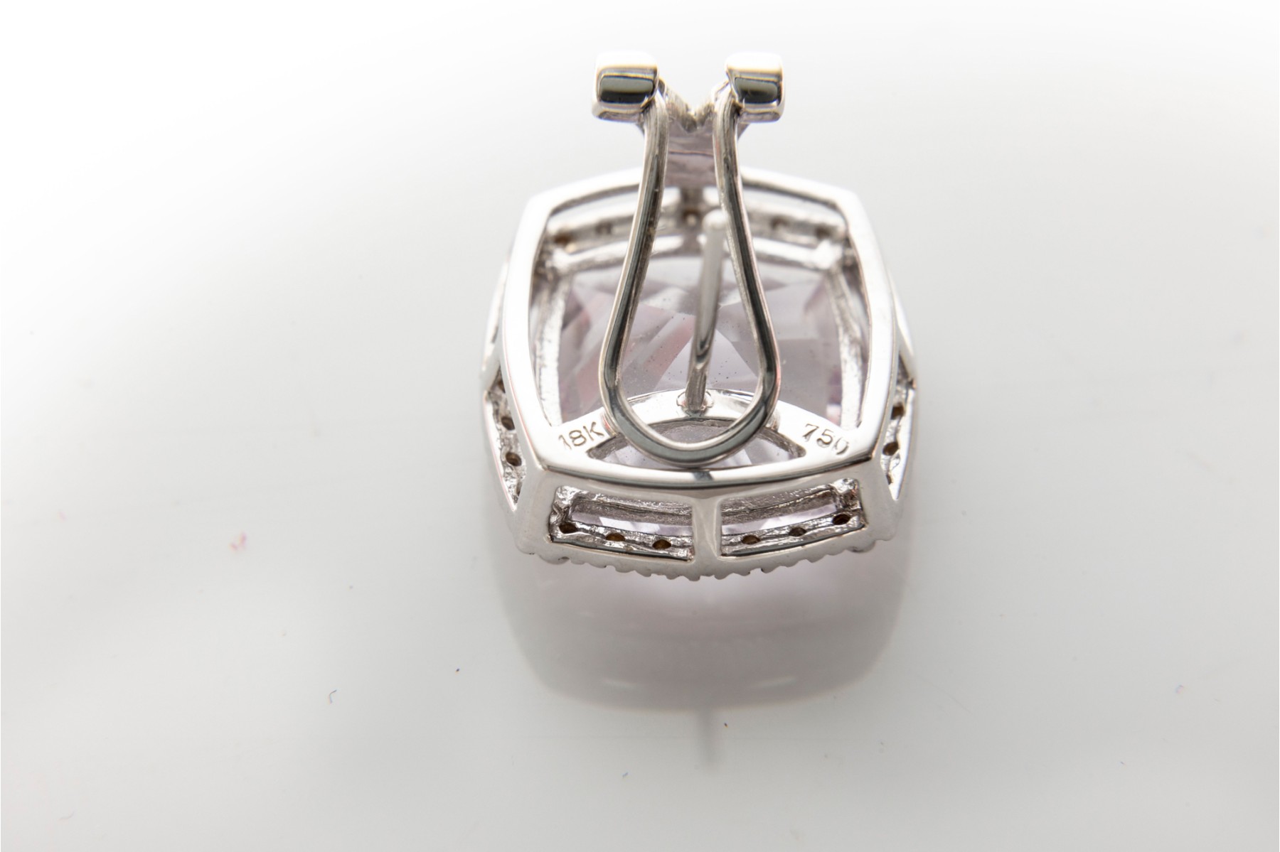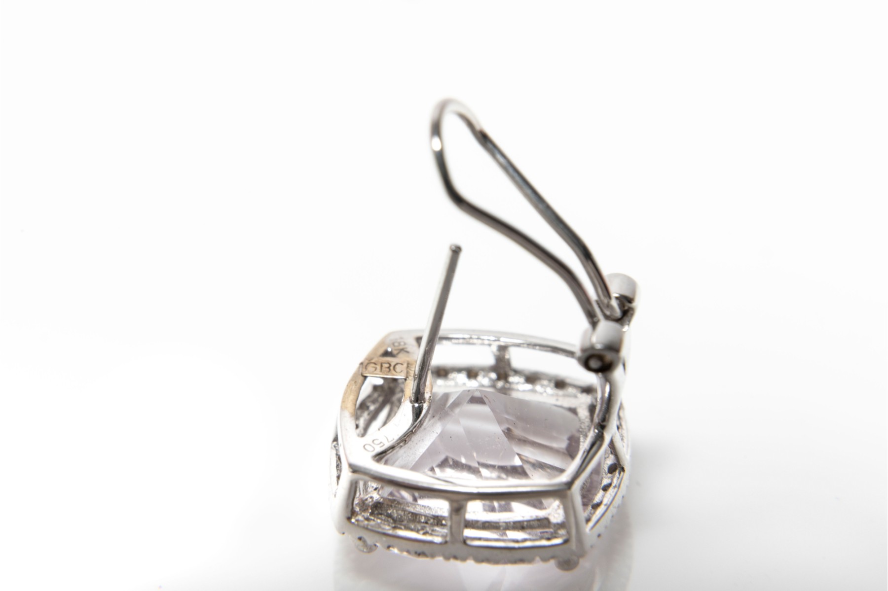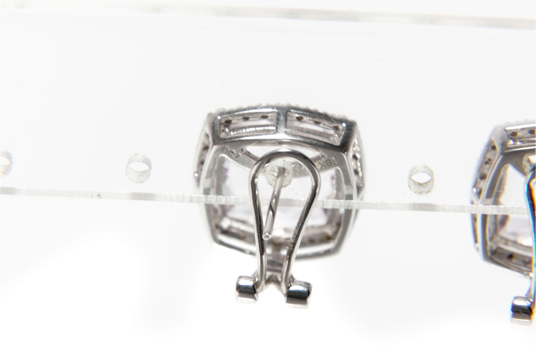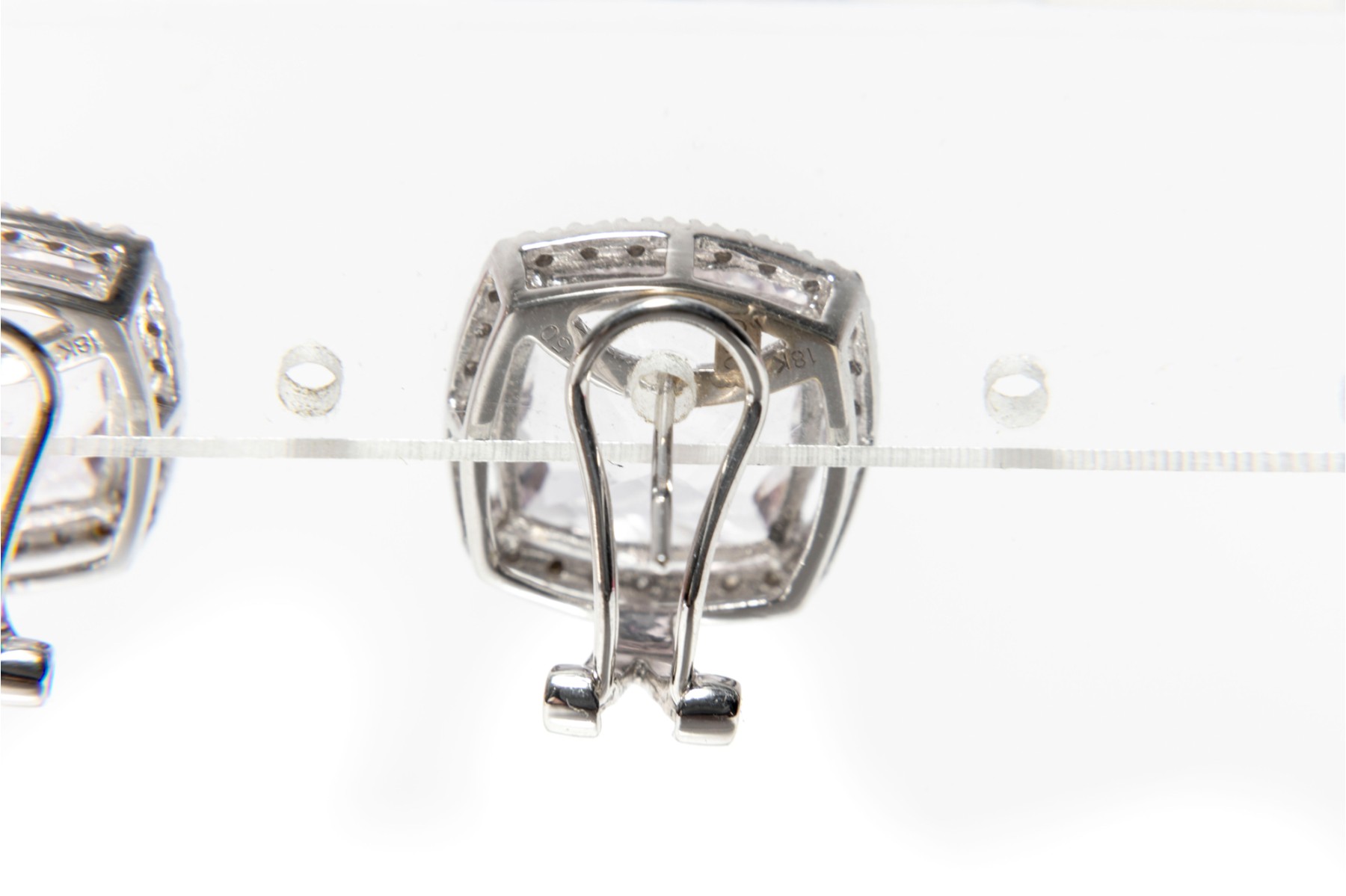 A pair of excellent white gold stud earrings displaying cushion fantasy cut amethysts in delicate, pale purple, surrounded by dainty diamond halos. The amethysts are approximately 11.94 TCW and the diamonds are approximately 11.94 TCW.