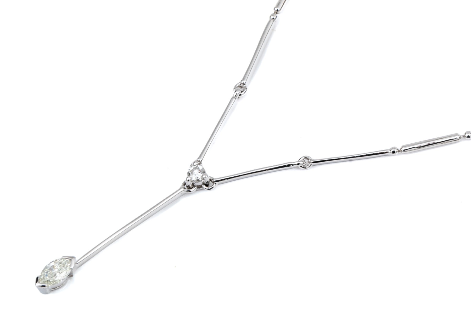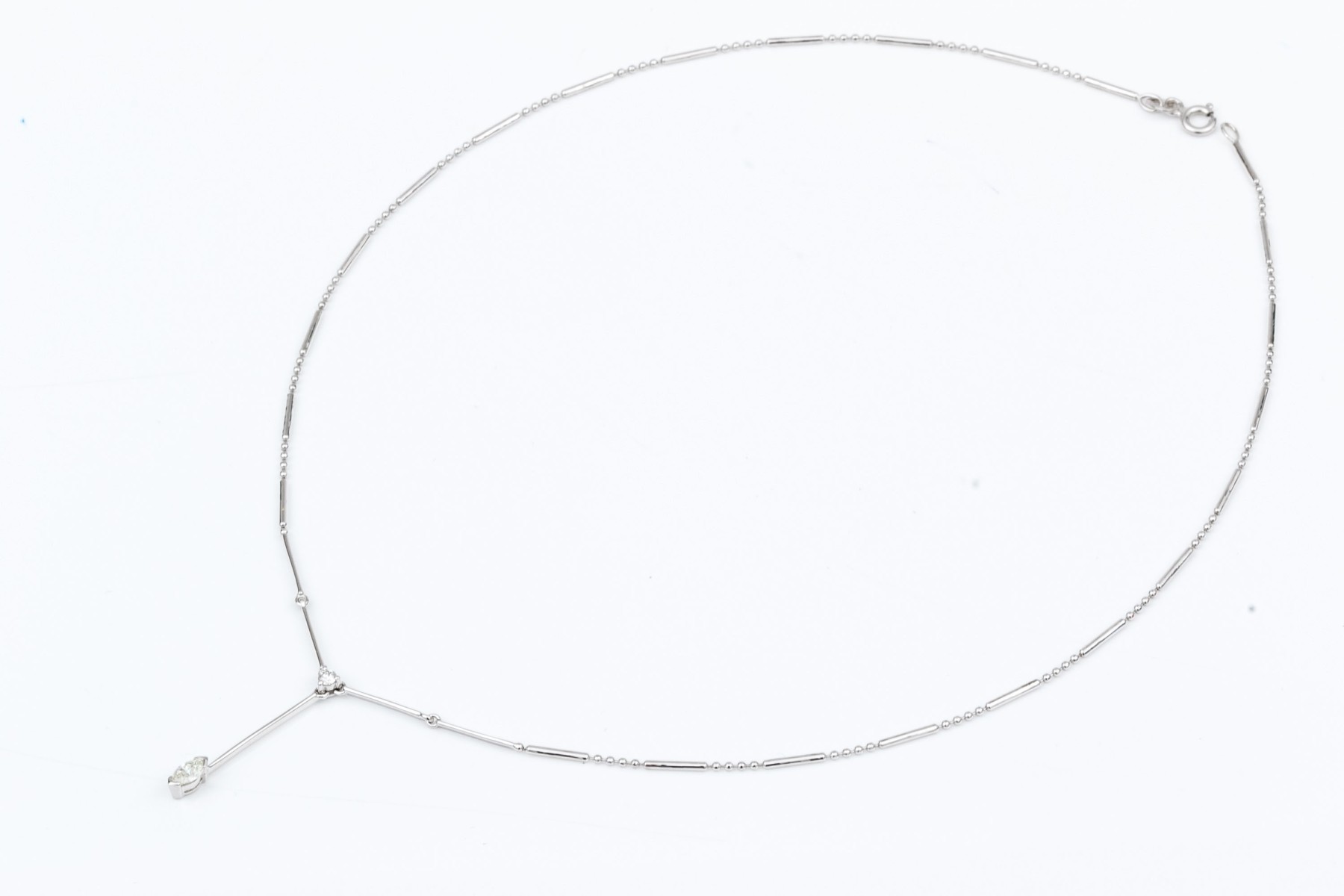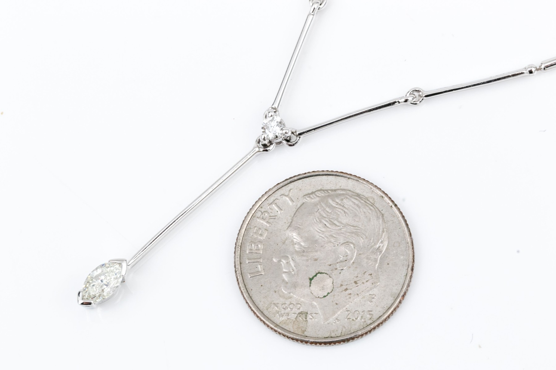 18k white gold diamond set ball and bar chain "y" necklace, app. 0.20 TCW, SI2 to I1, J color. The necklace is set with a round faceted diamonds, app. 0.04 CTS and a 0.16 TCW marquise diamond drop. The necklace is finished with a spring ring style clasp