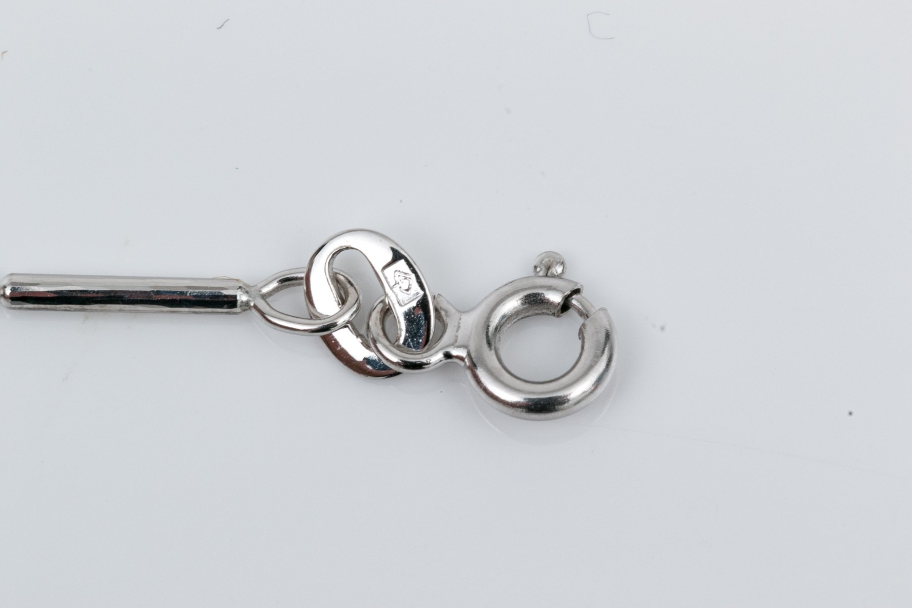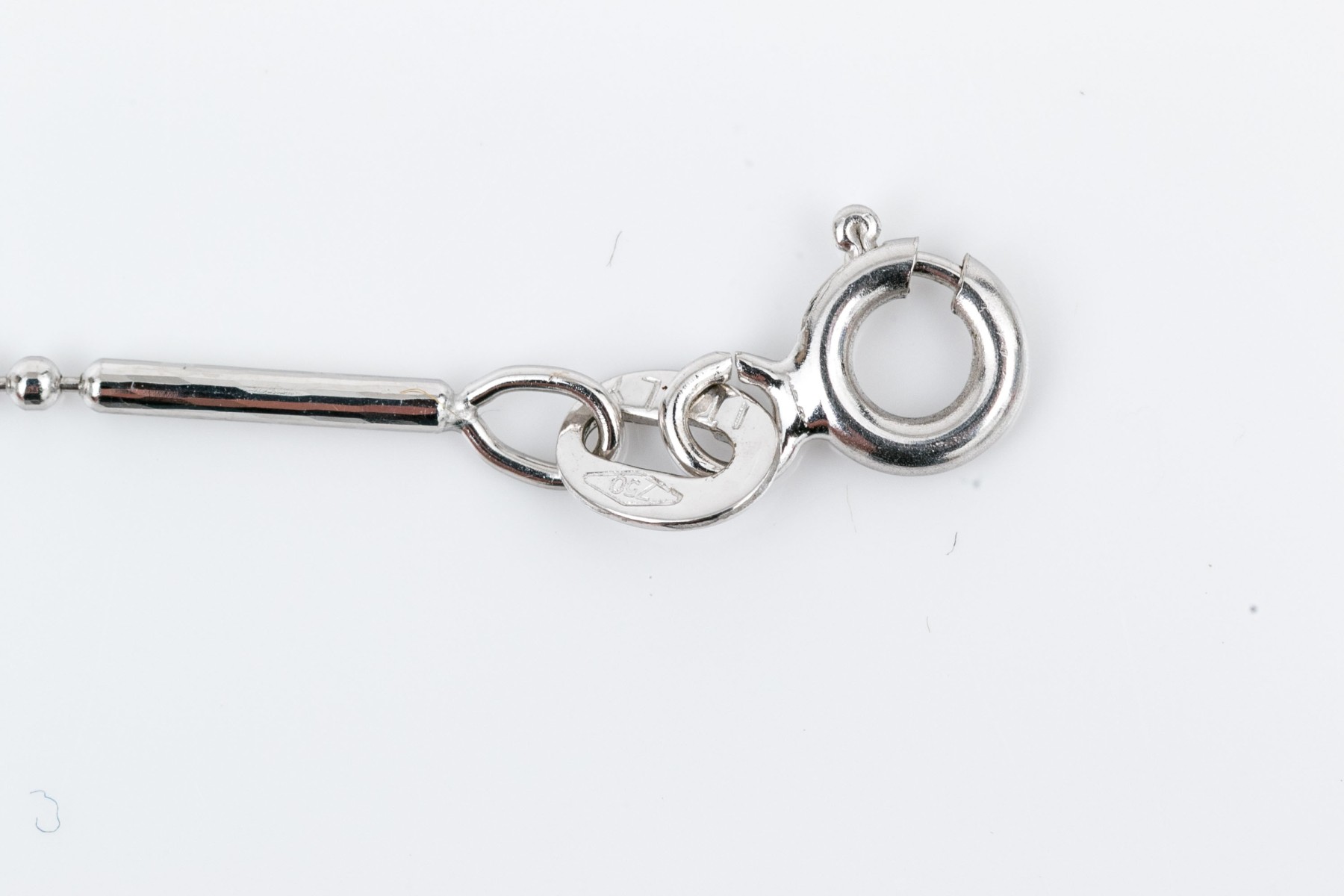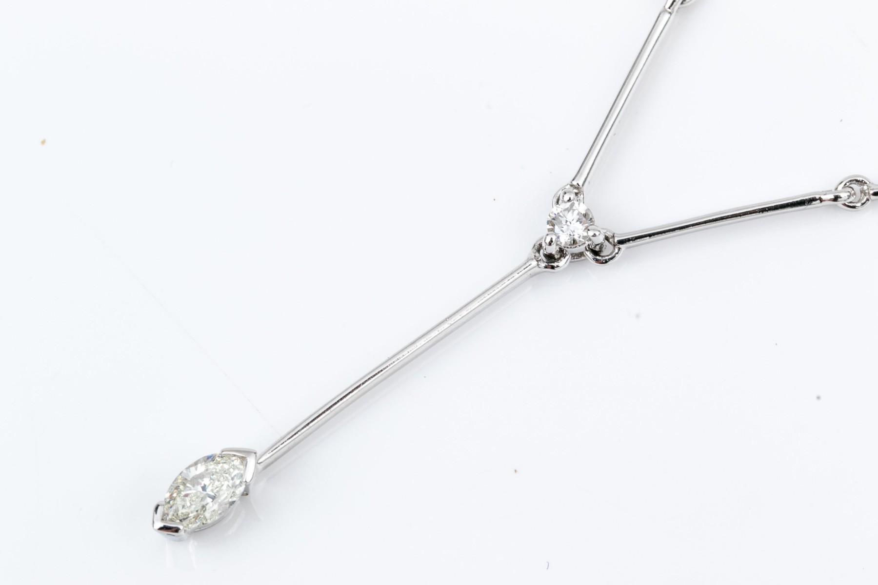 18k white gold diamond set ball and bar chain "y" necklace, app. 0.20 TCW, SI2 to I1, J color. The necklace is set with a round faceted diamonds, app. 0.04 CTS and a 0.16 TCW marquise diamond drop. The necklace is finished with a spring ring style clasp