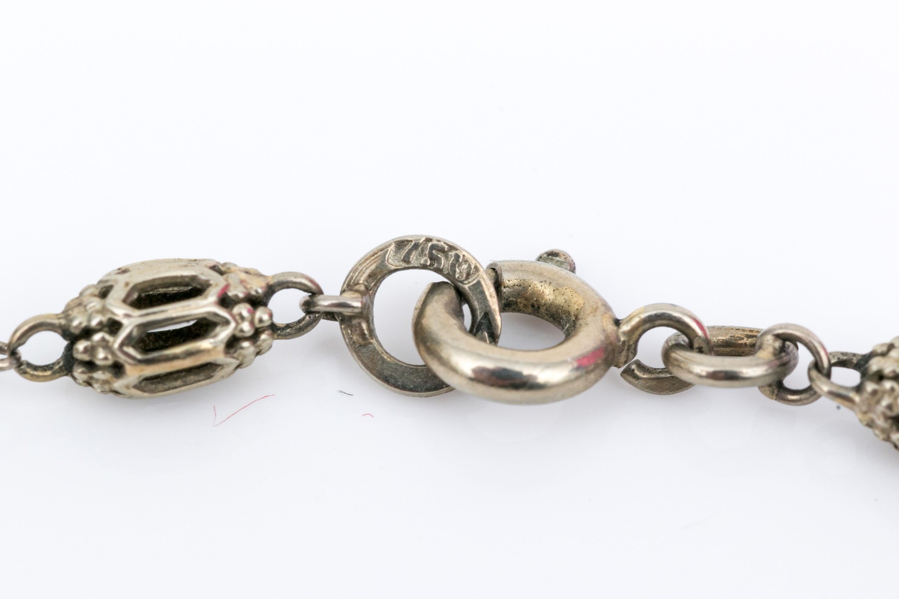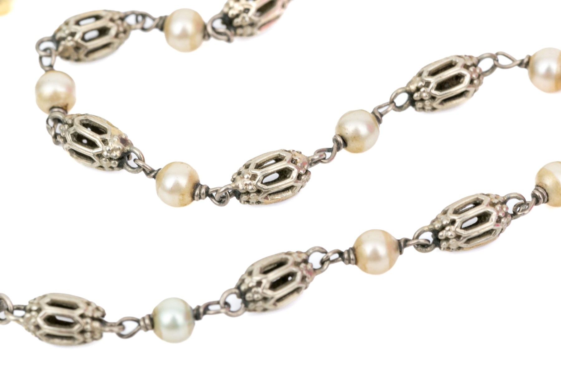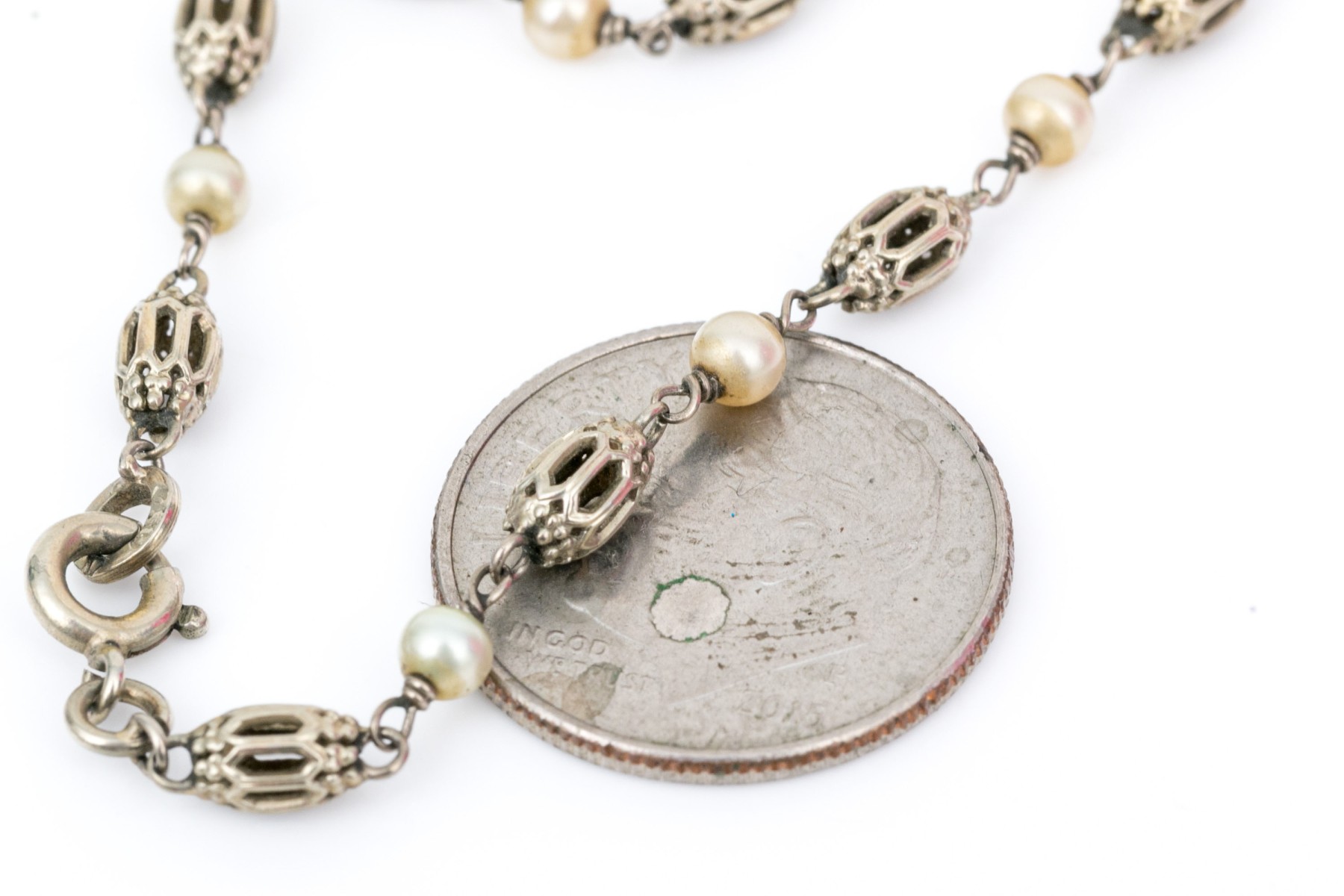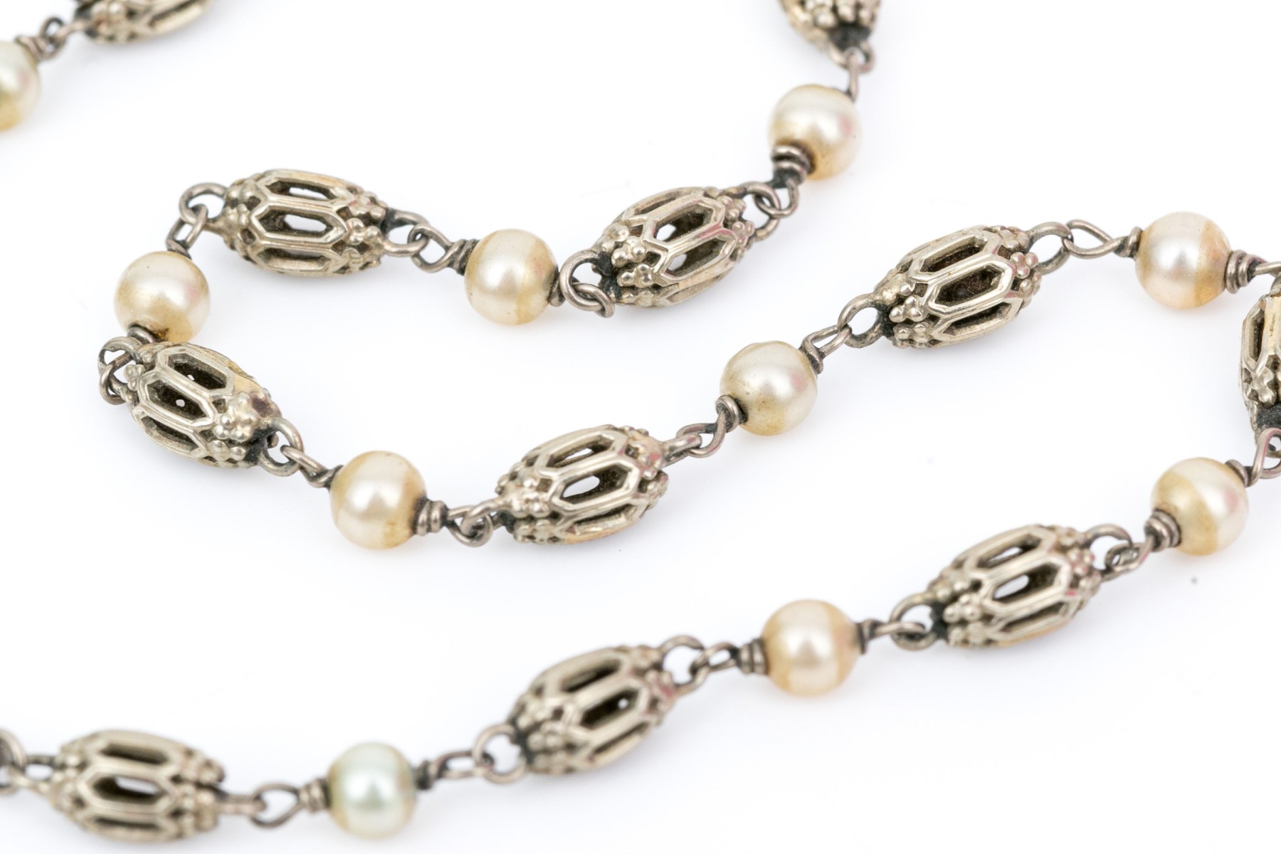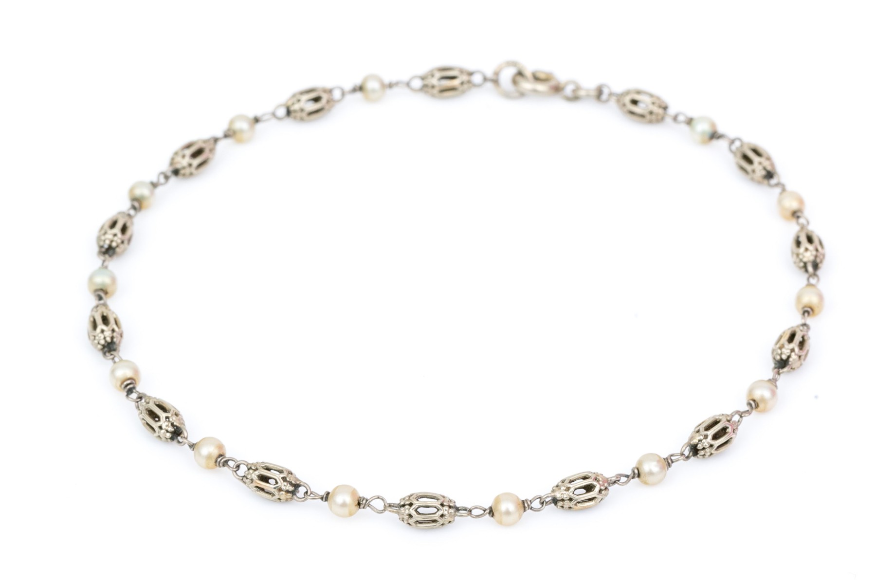 18k white gold handsome alternating filigree bead and seed pearl link bracelet ,finished with a spring ring style clasp