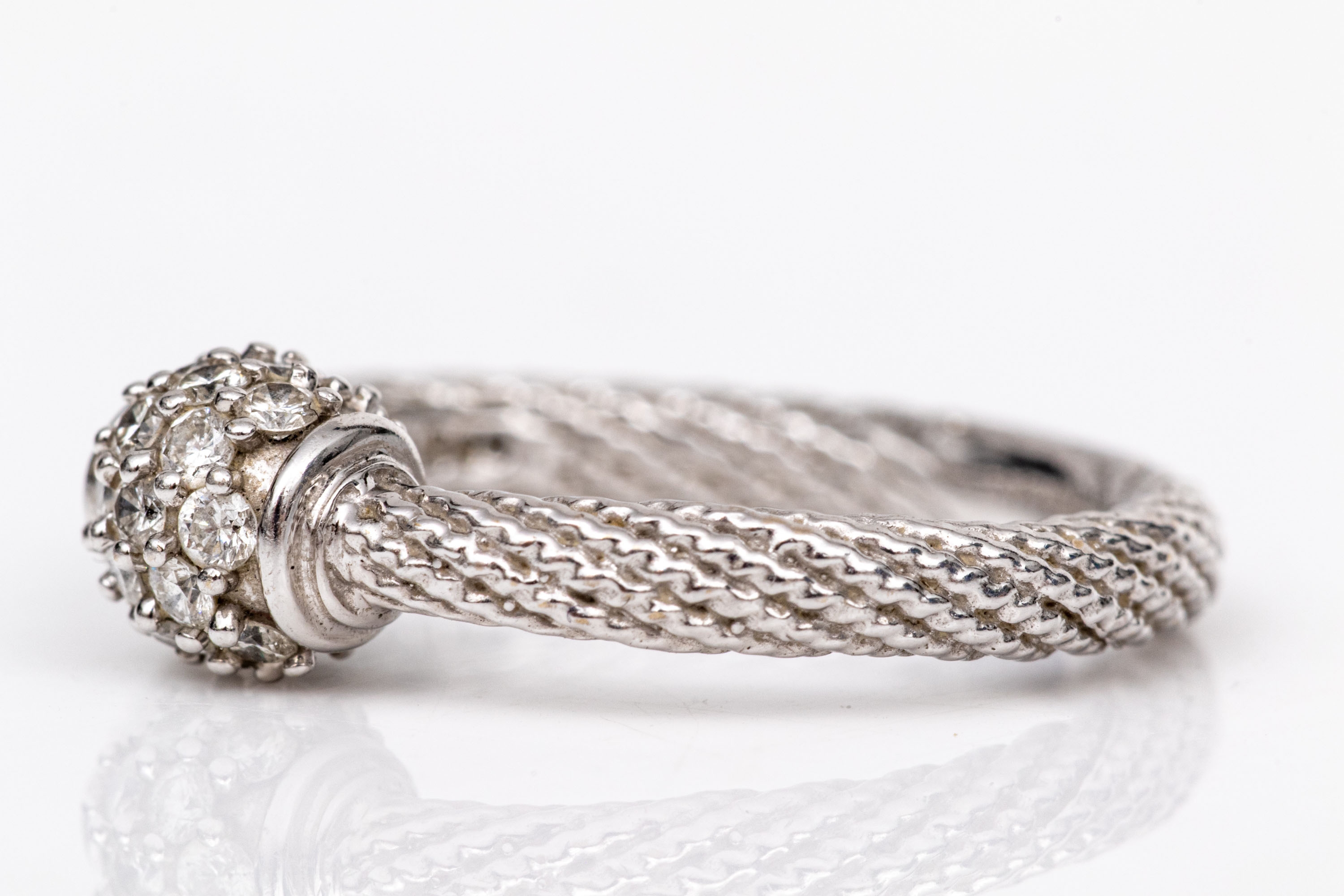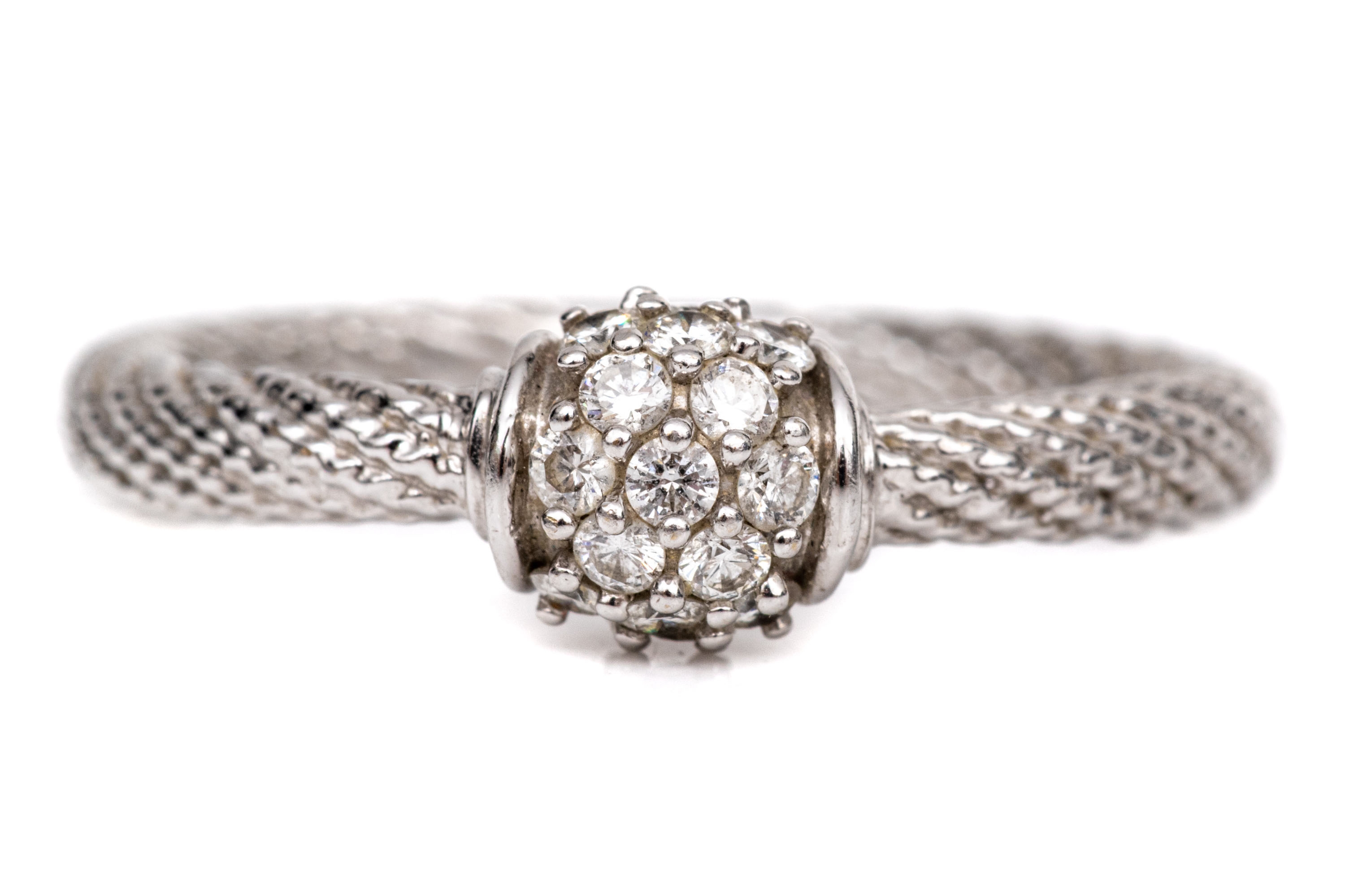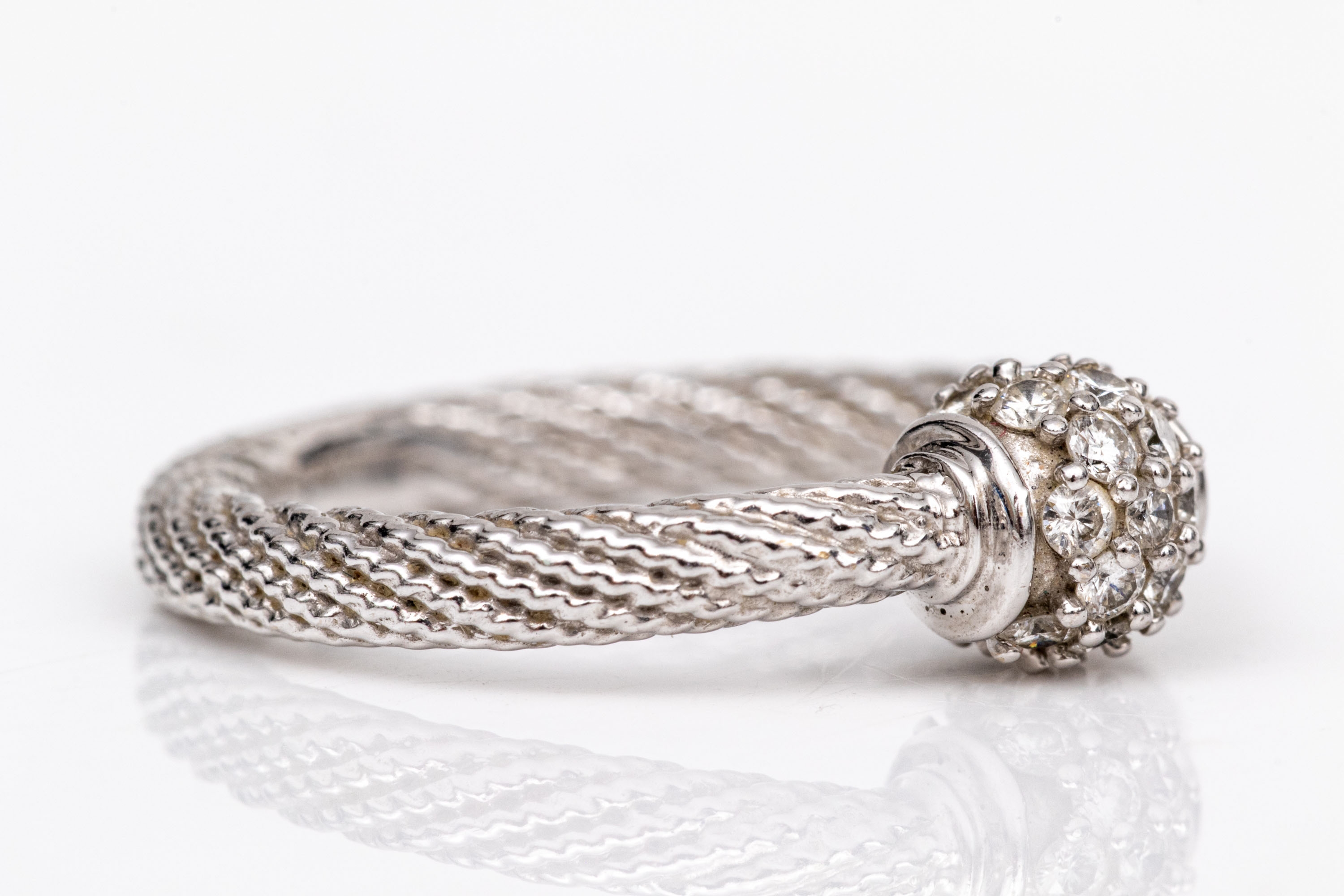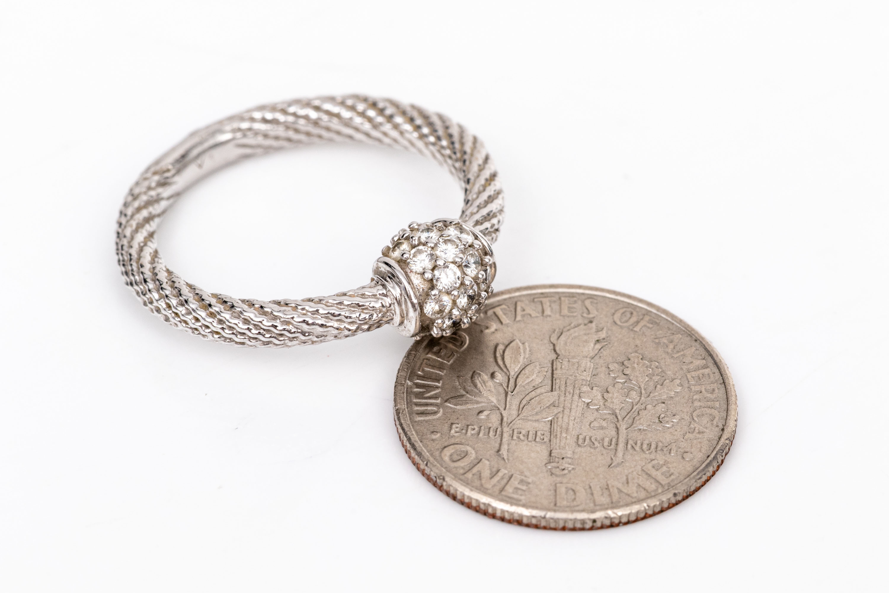 18k white gold lovely cable and pave diamond ball ring, app. 0.18 TCW, size 6