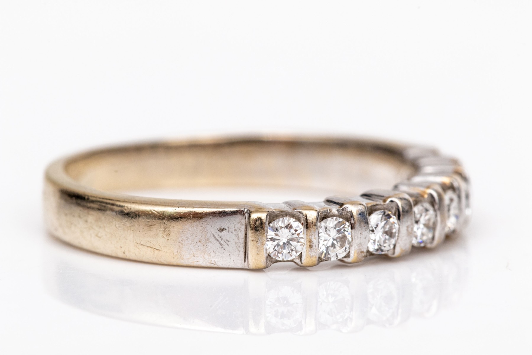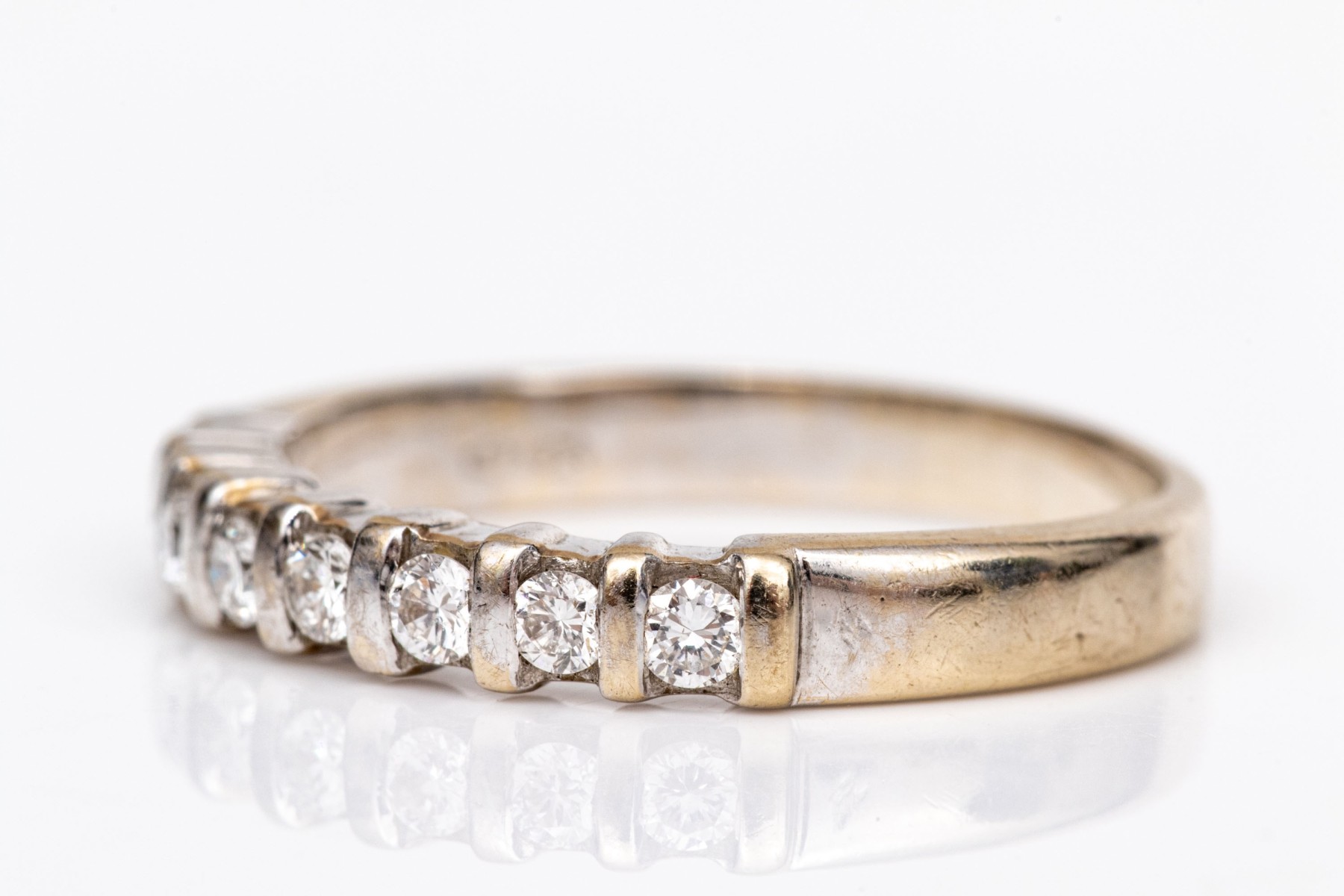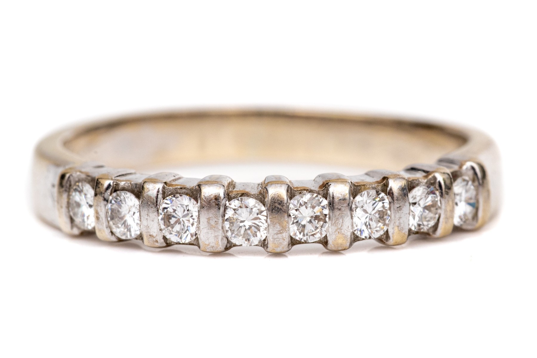 18k white gold pretty bar set diamond band ring, app. 0.12 TCW, size 5.5