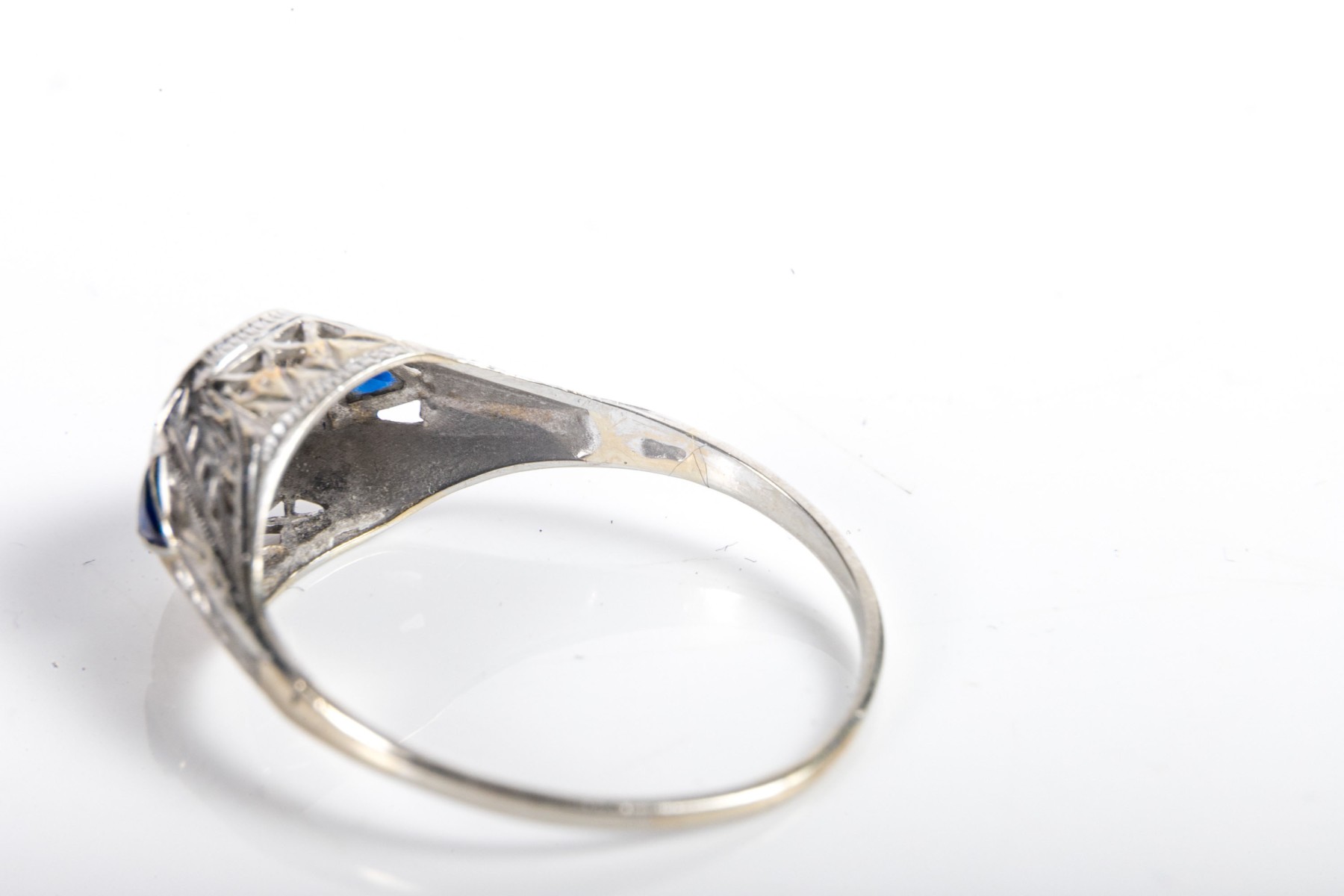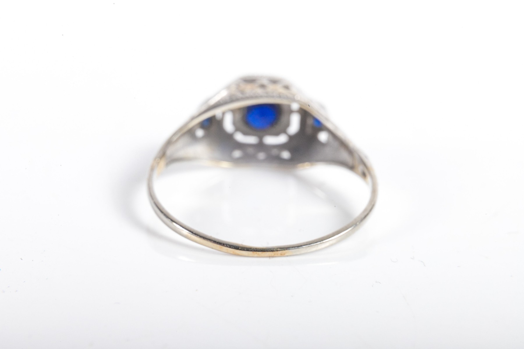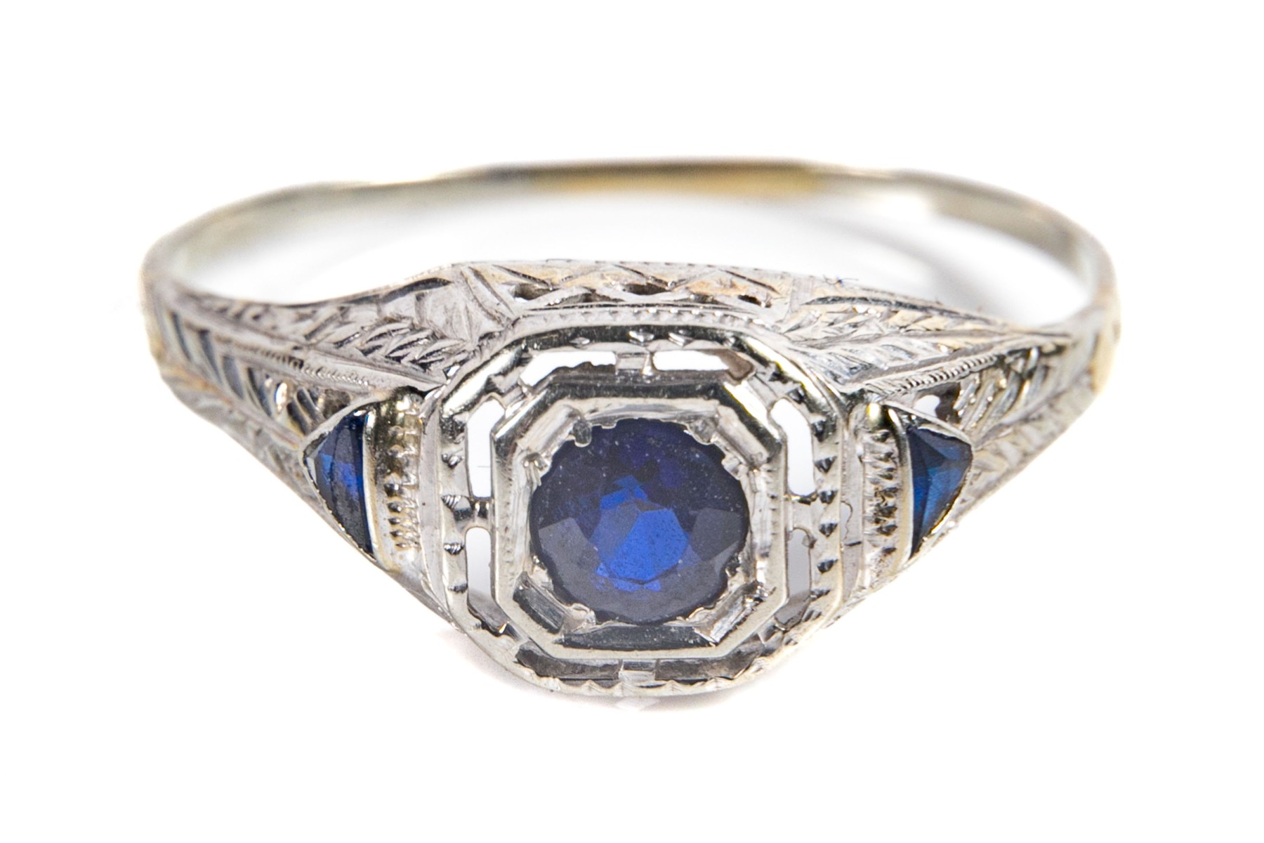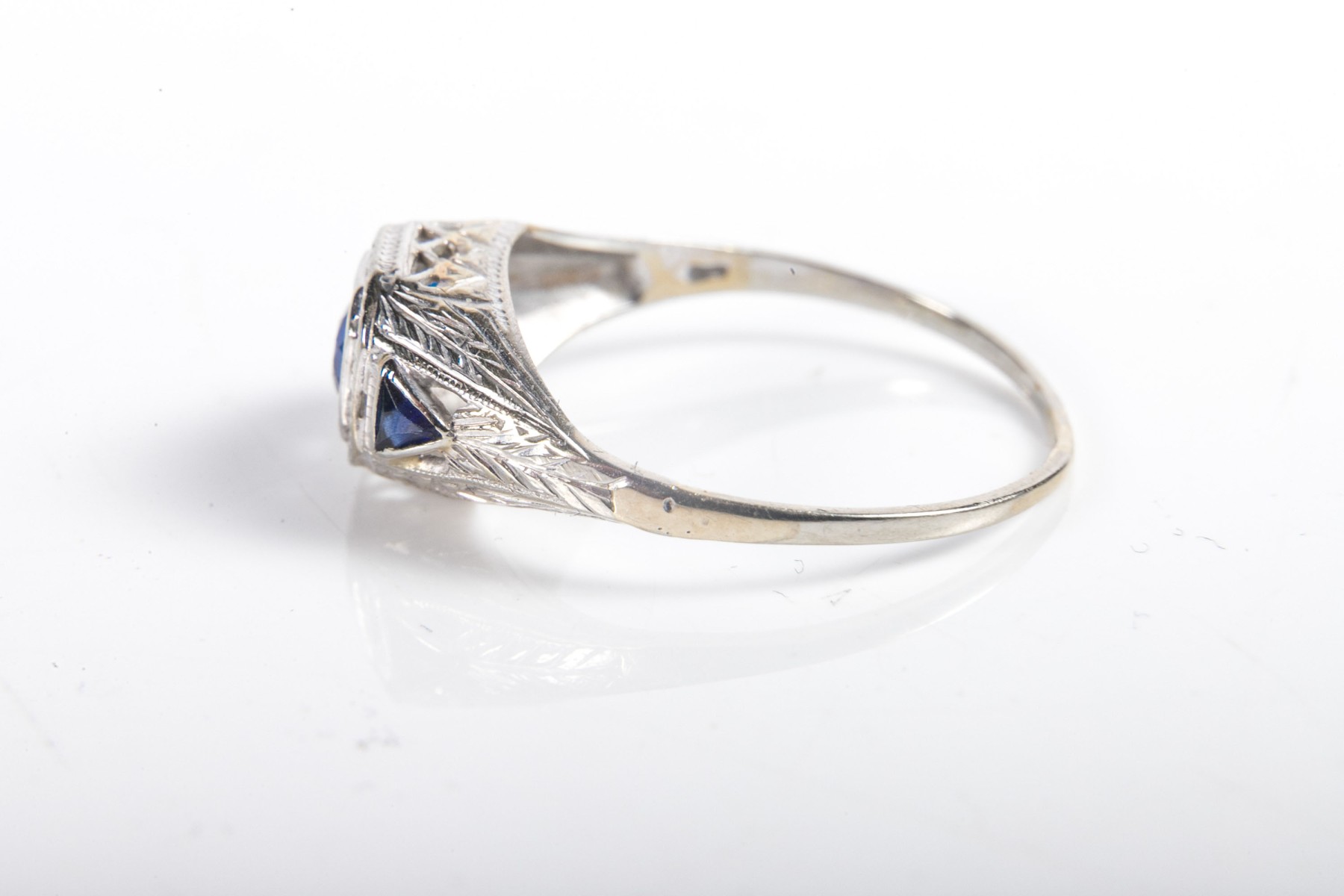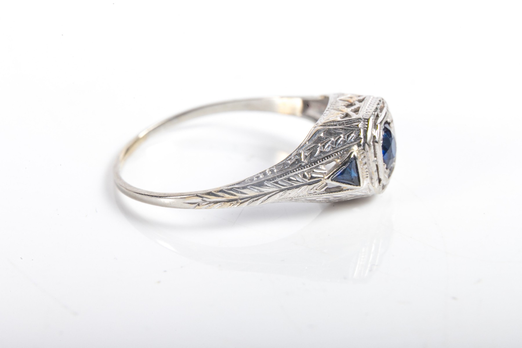 A beautiful white gold ring displaying a vibrant cobalt blue round sapphire flanked by triangular bezel set sapphires on pierced and etched high shoulders that taper dramatically to a thin shank.