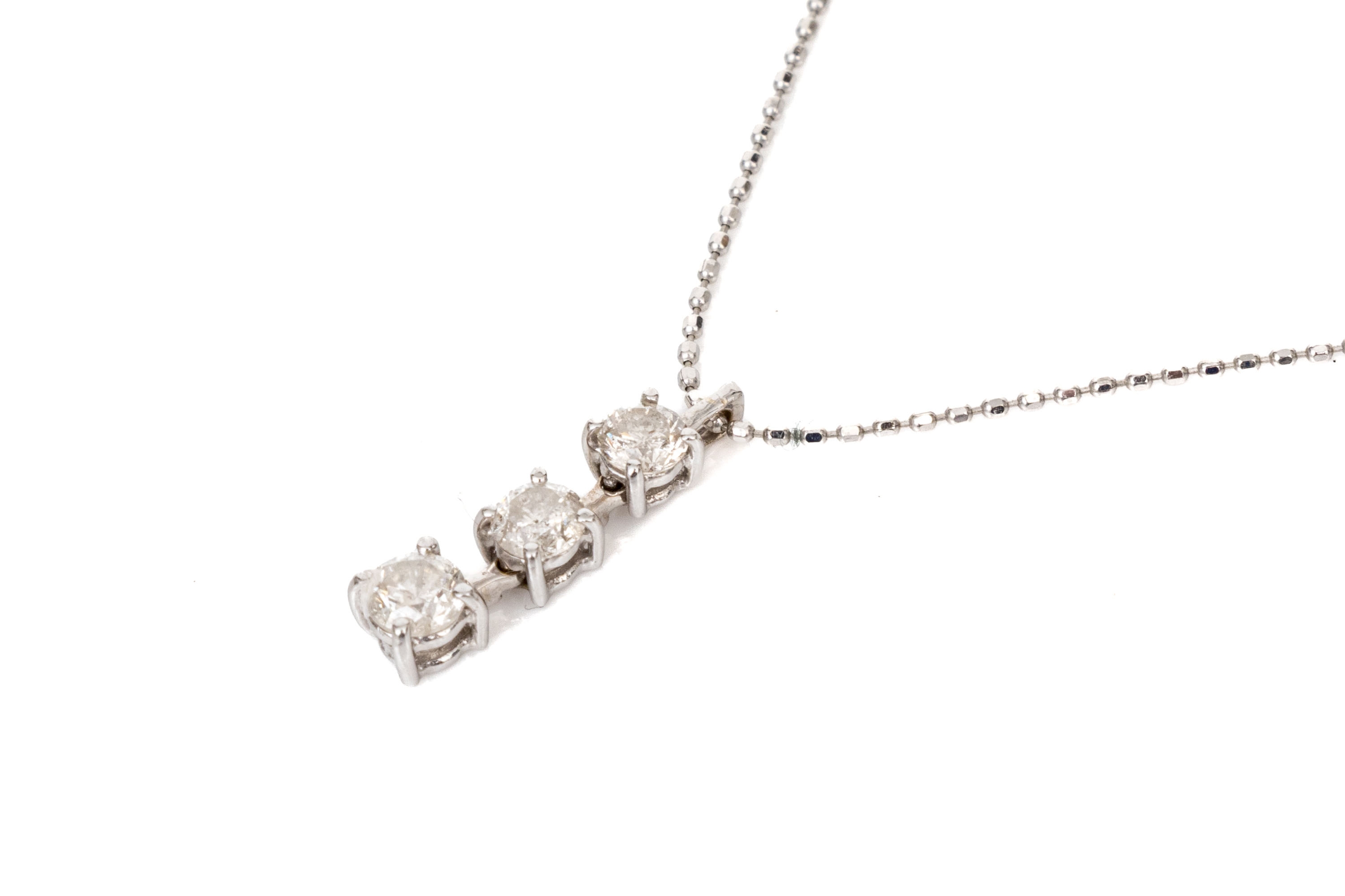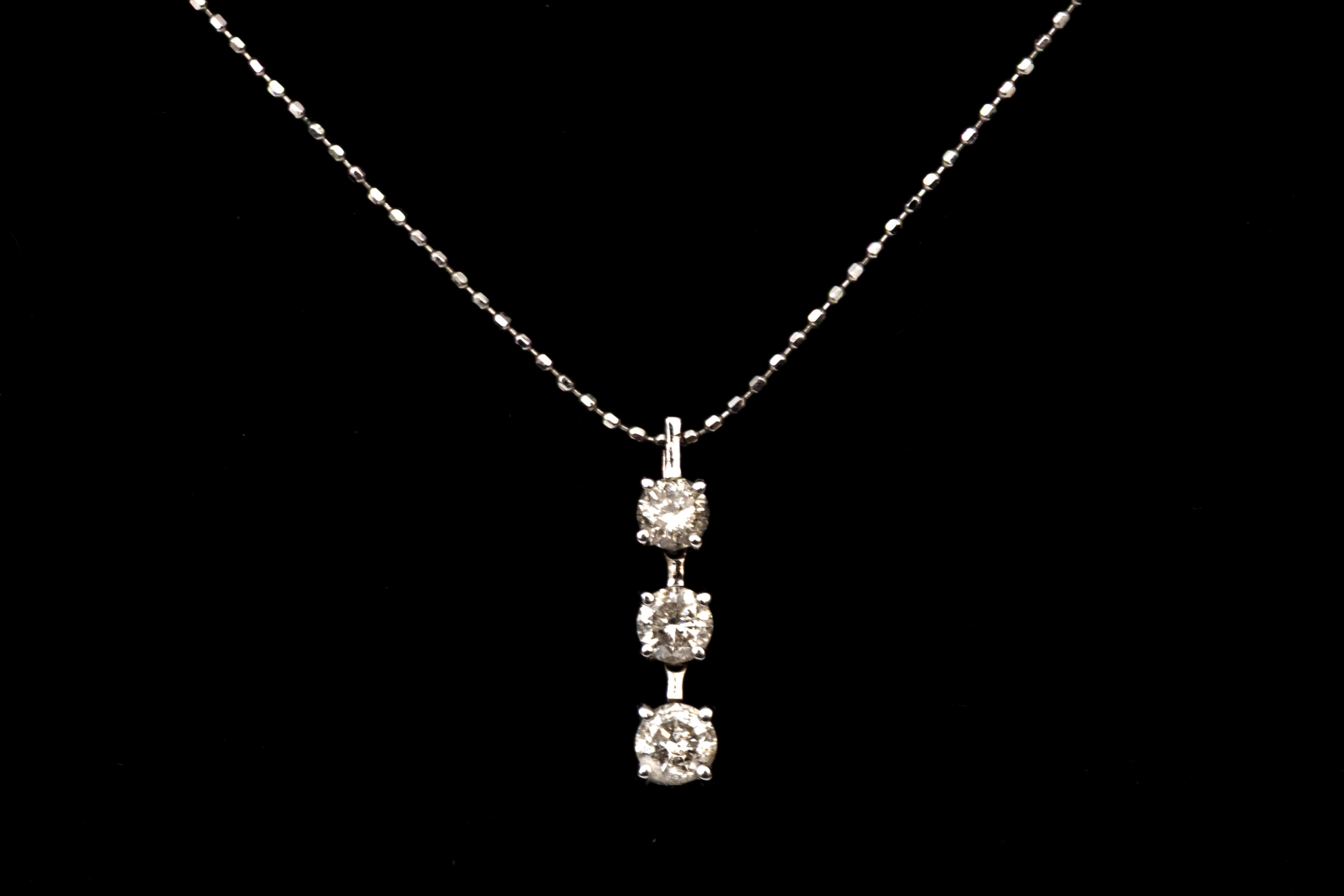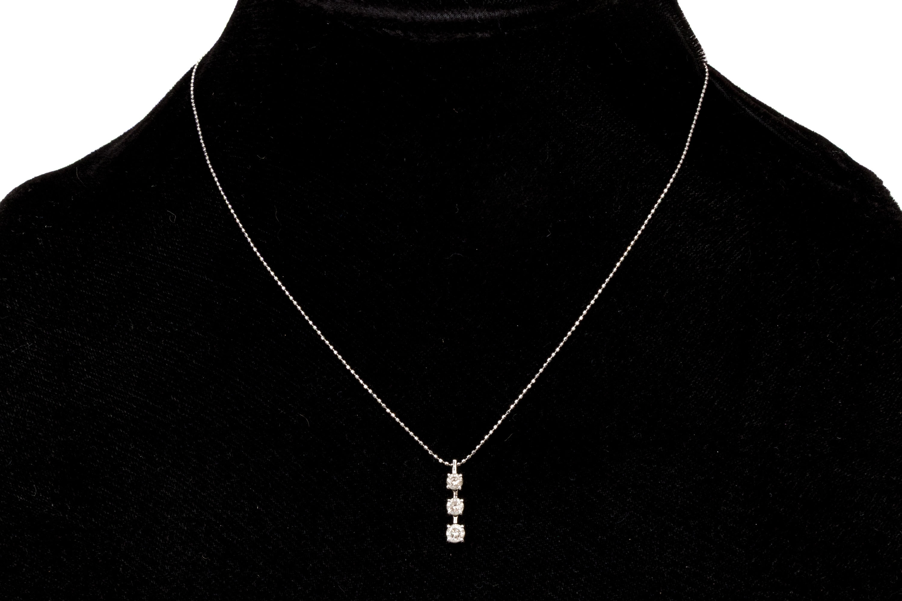 18k white gold striking graduated diamond stack pendant, app. 0.45 TCW, with chain, finished with a spring ring style clasp. Diamonds are I1 to I2 clarity.