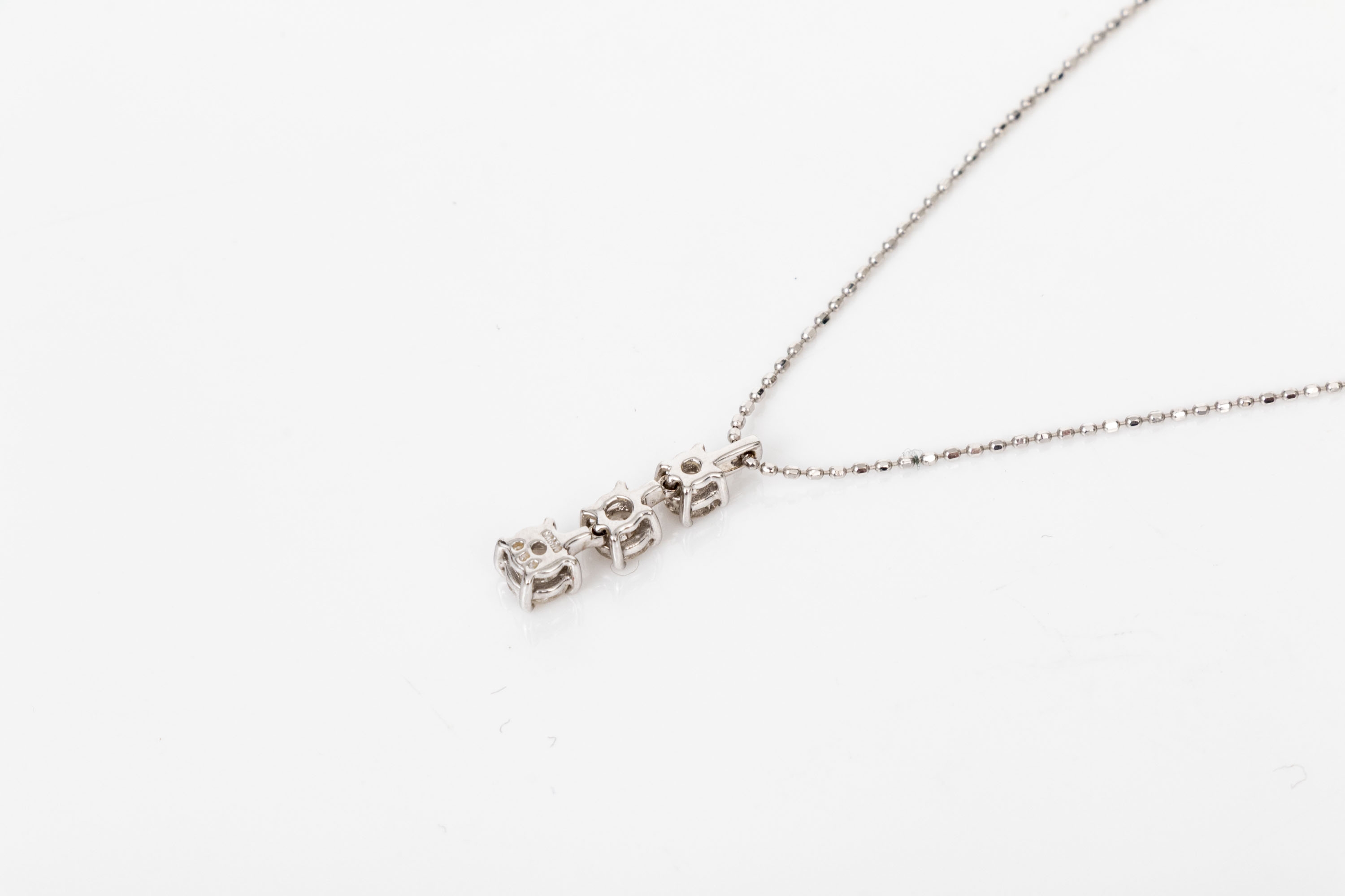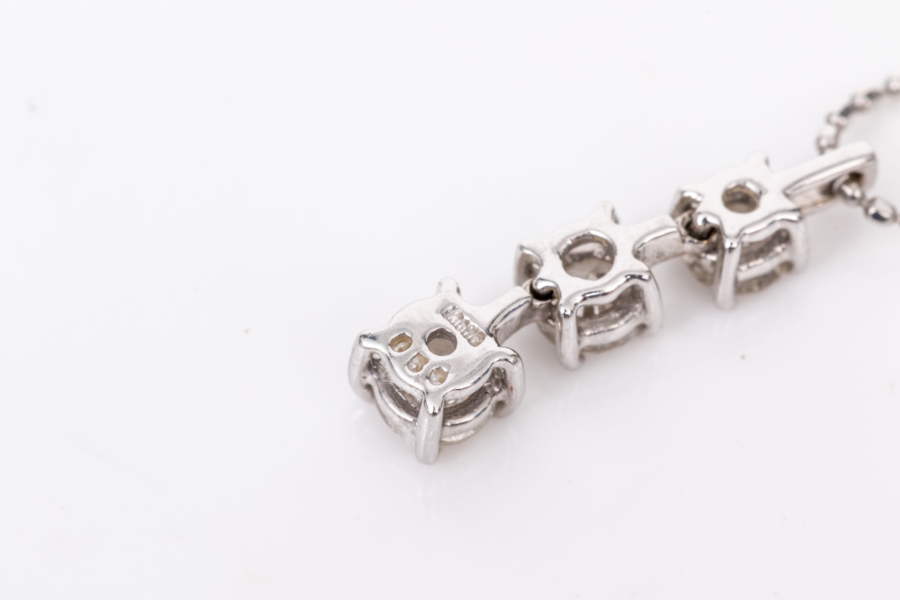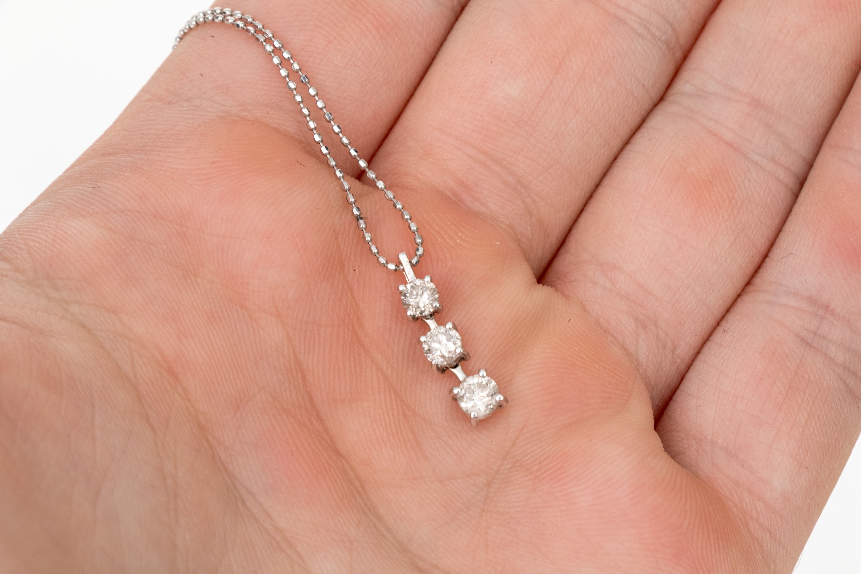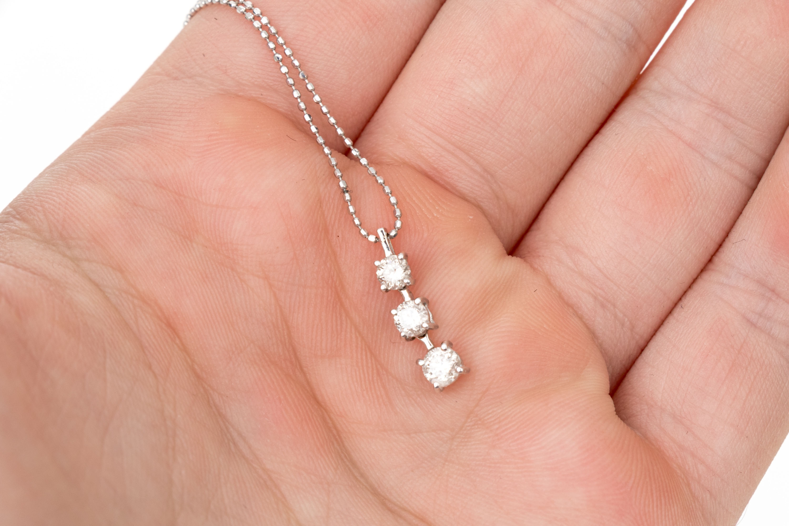 18k white gold striking graduated diamond stack pendant, app. 0.45 TCW, with chain, finished with a spring ring style clasp. Diamonds are I1 to I2 clarity.