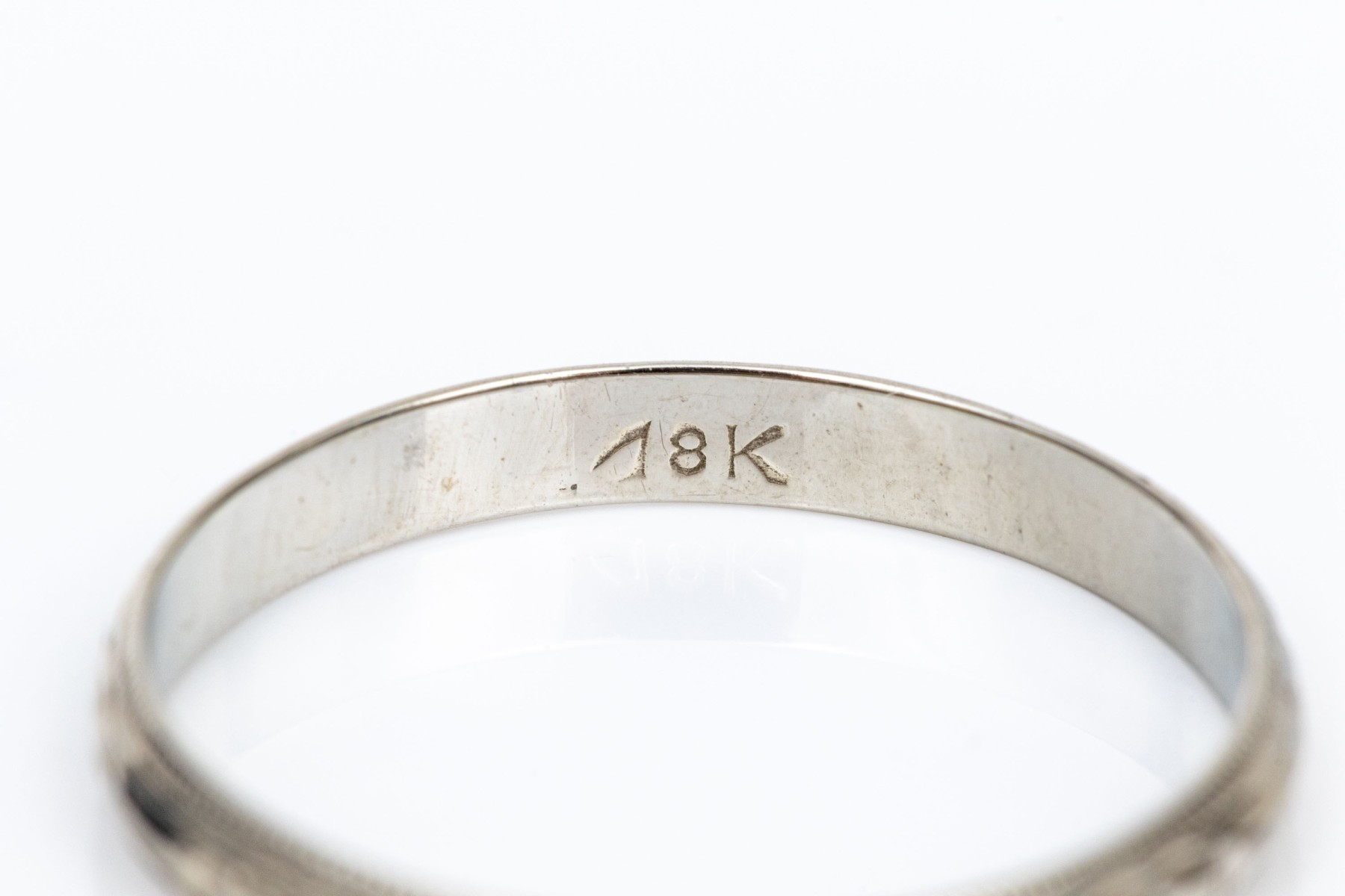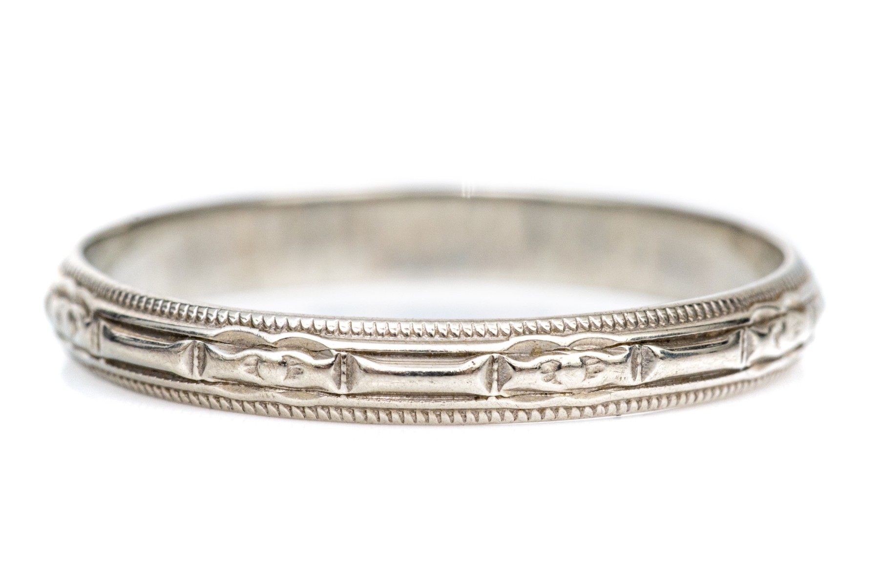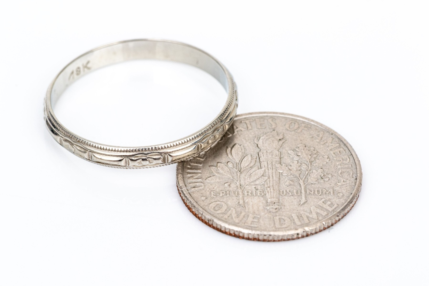 18k white gold vintage 2.5mm patterned band ring, size 7-