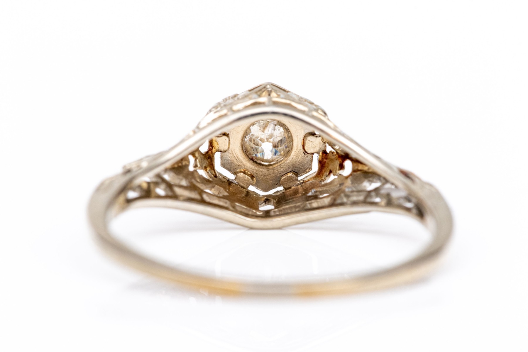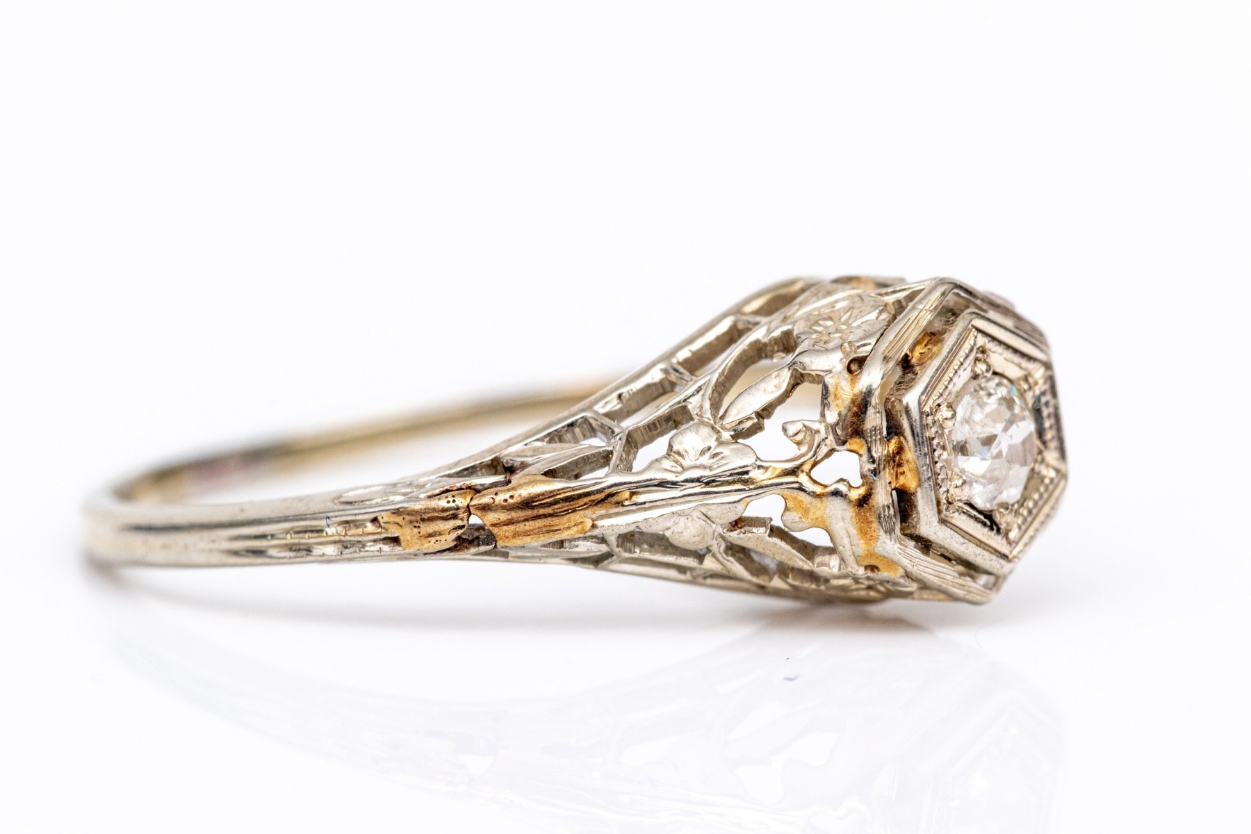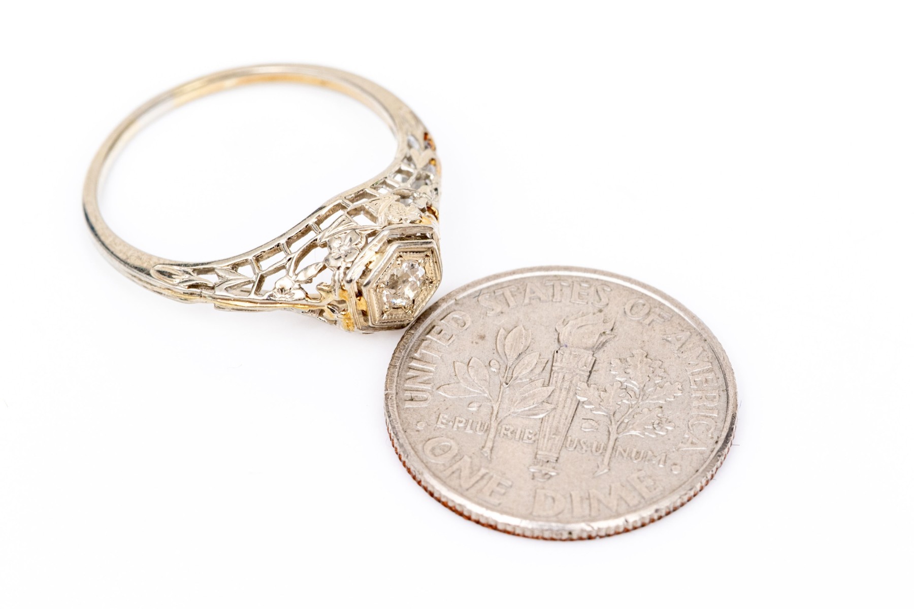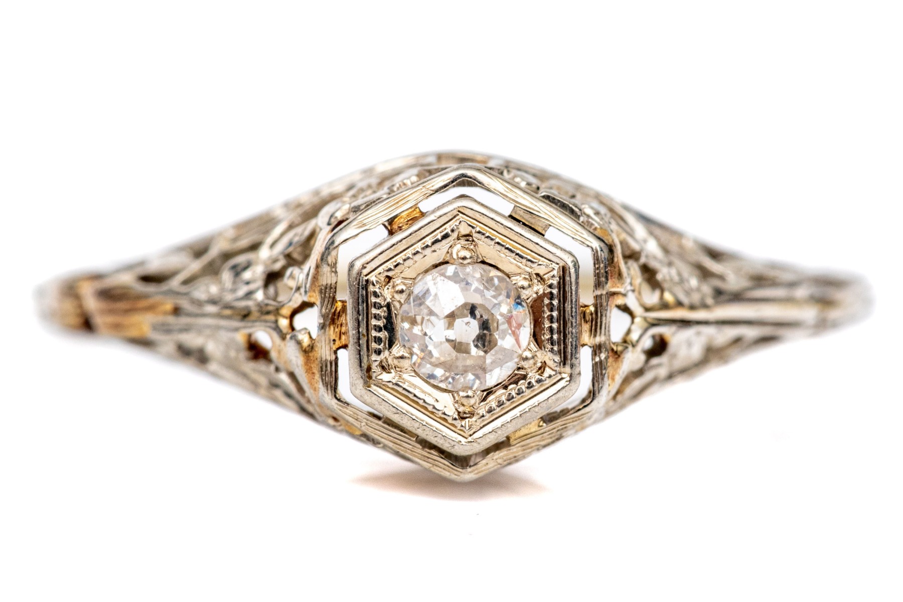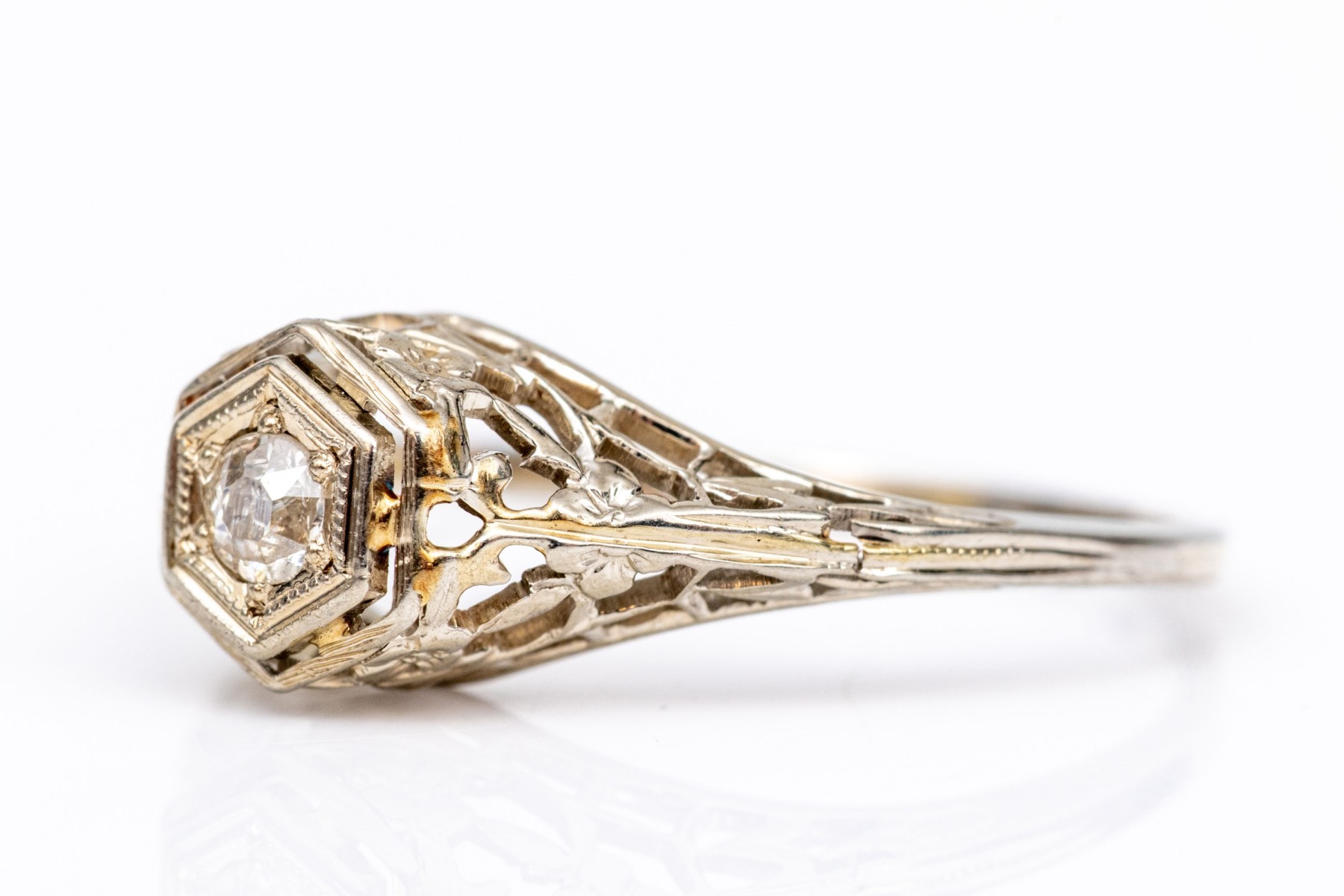18k white gold vintage filigree and diamond ring, app. 0.06 CTS, size 4.75