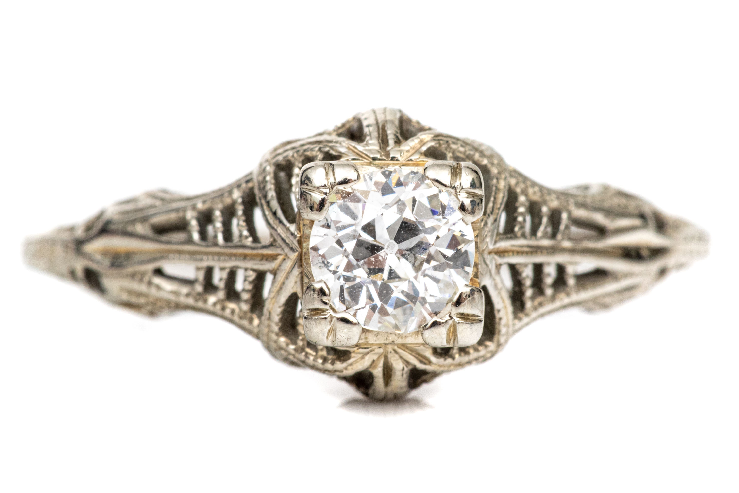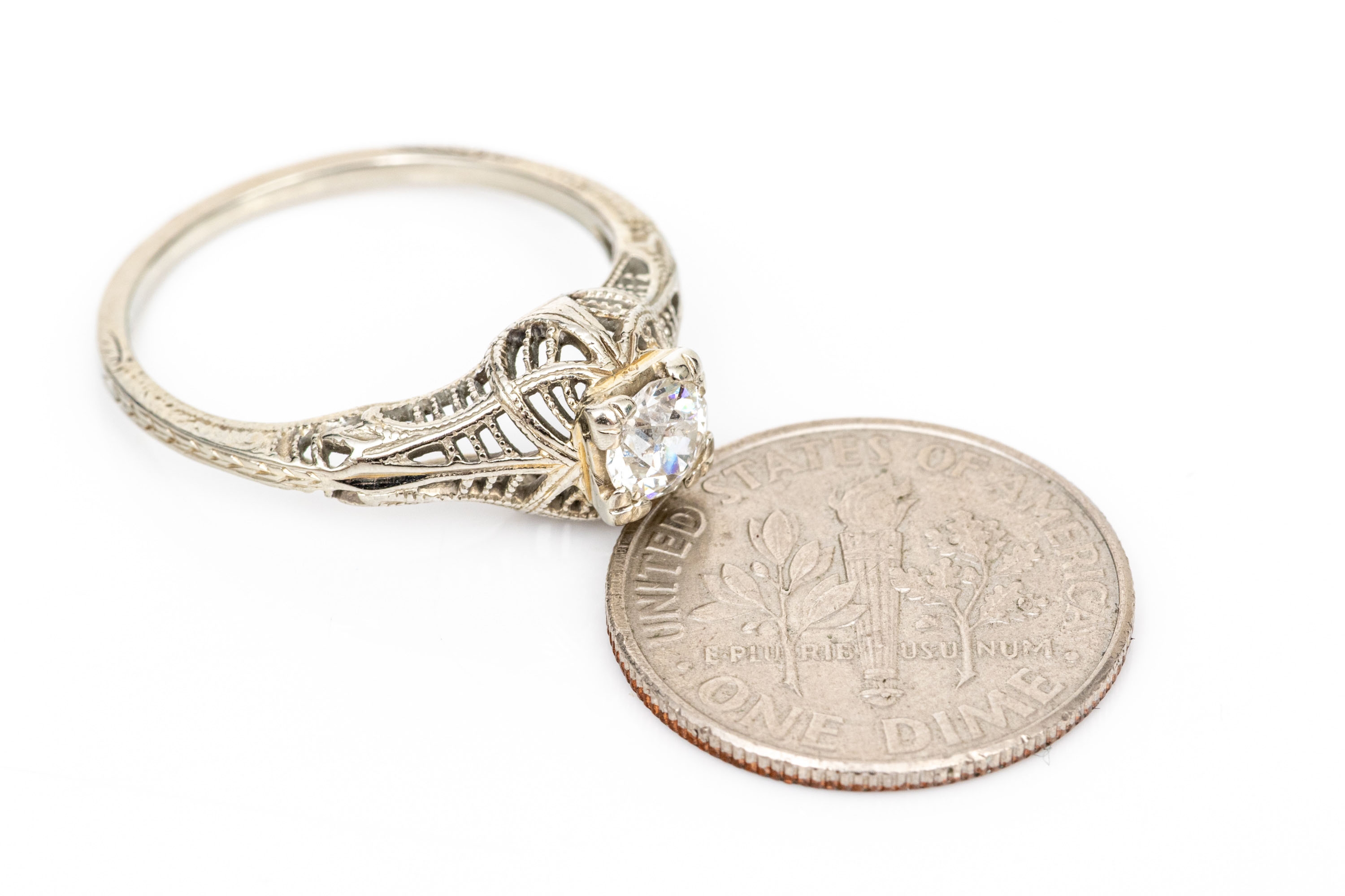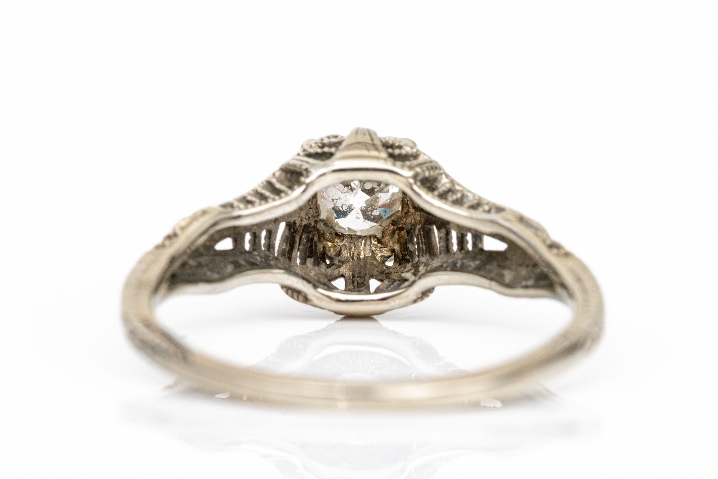 18k white gold vintage filigree and diamond ring, app. 0.28 CTS, size 6.5