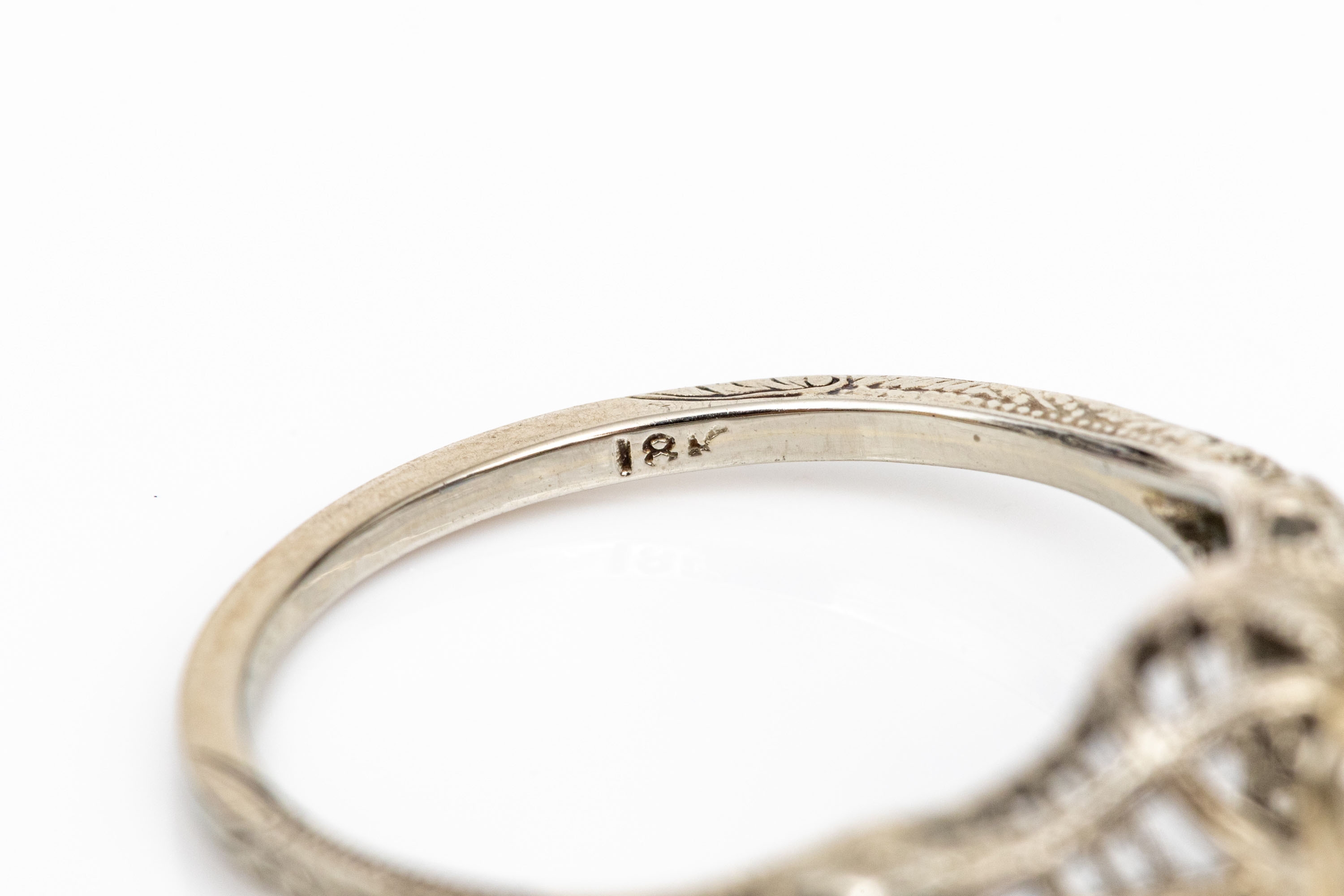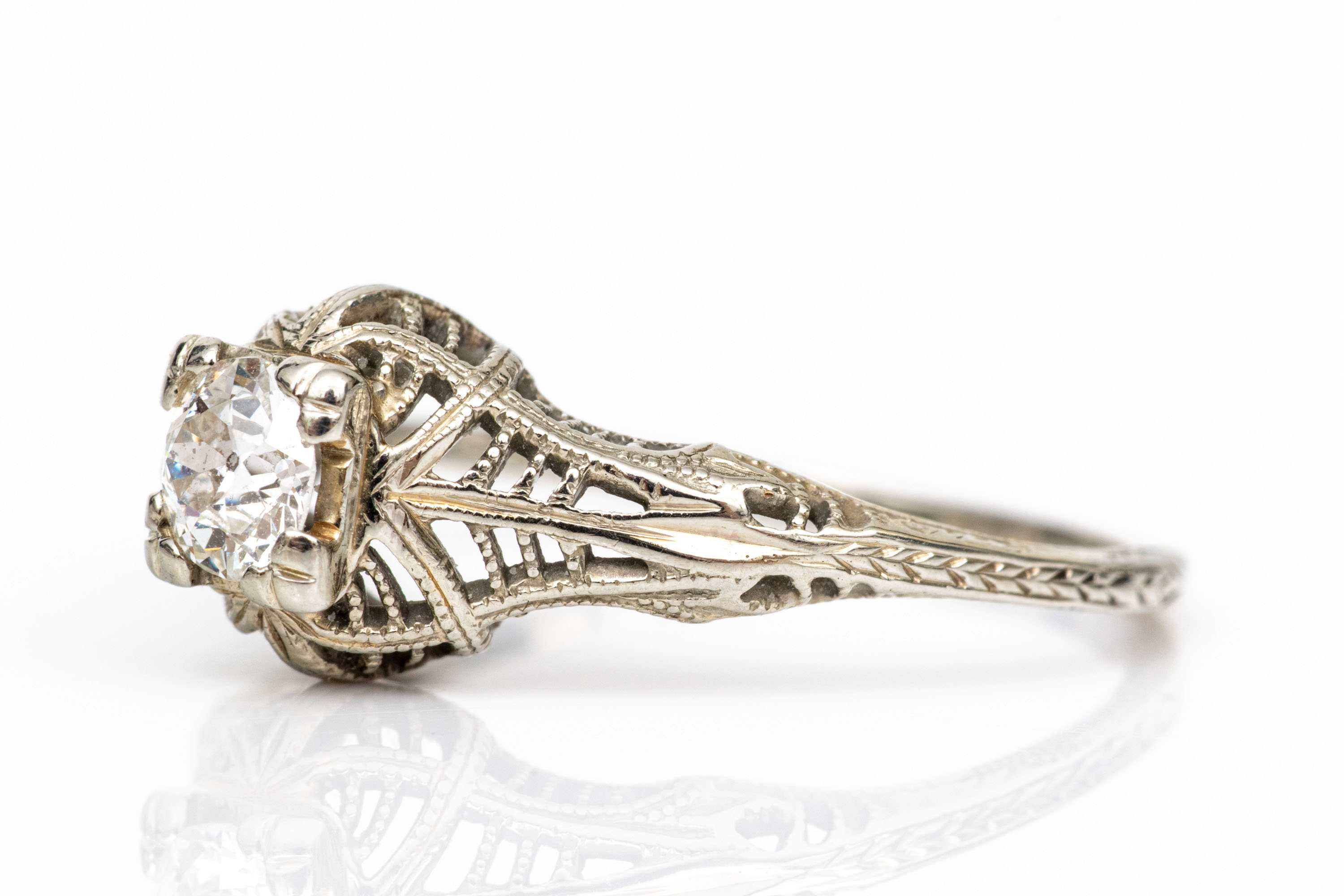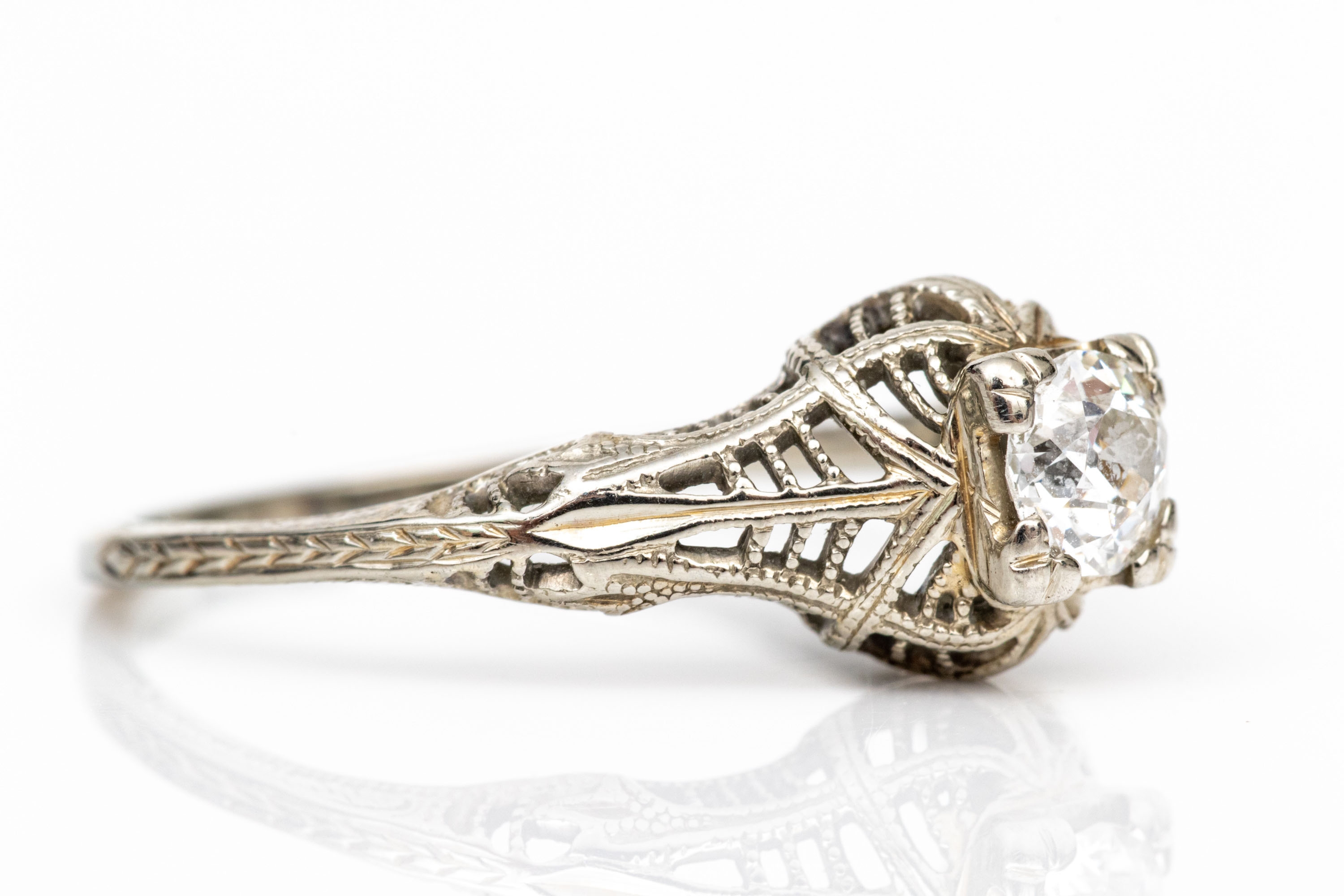 18k white gold vintage filigree and diamond ring, app. 0.28 CTS, size 6.5