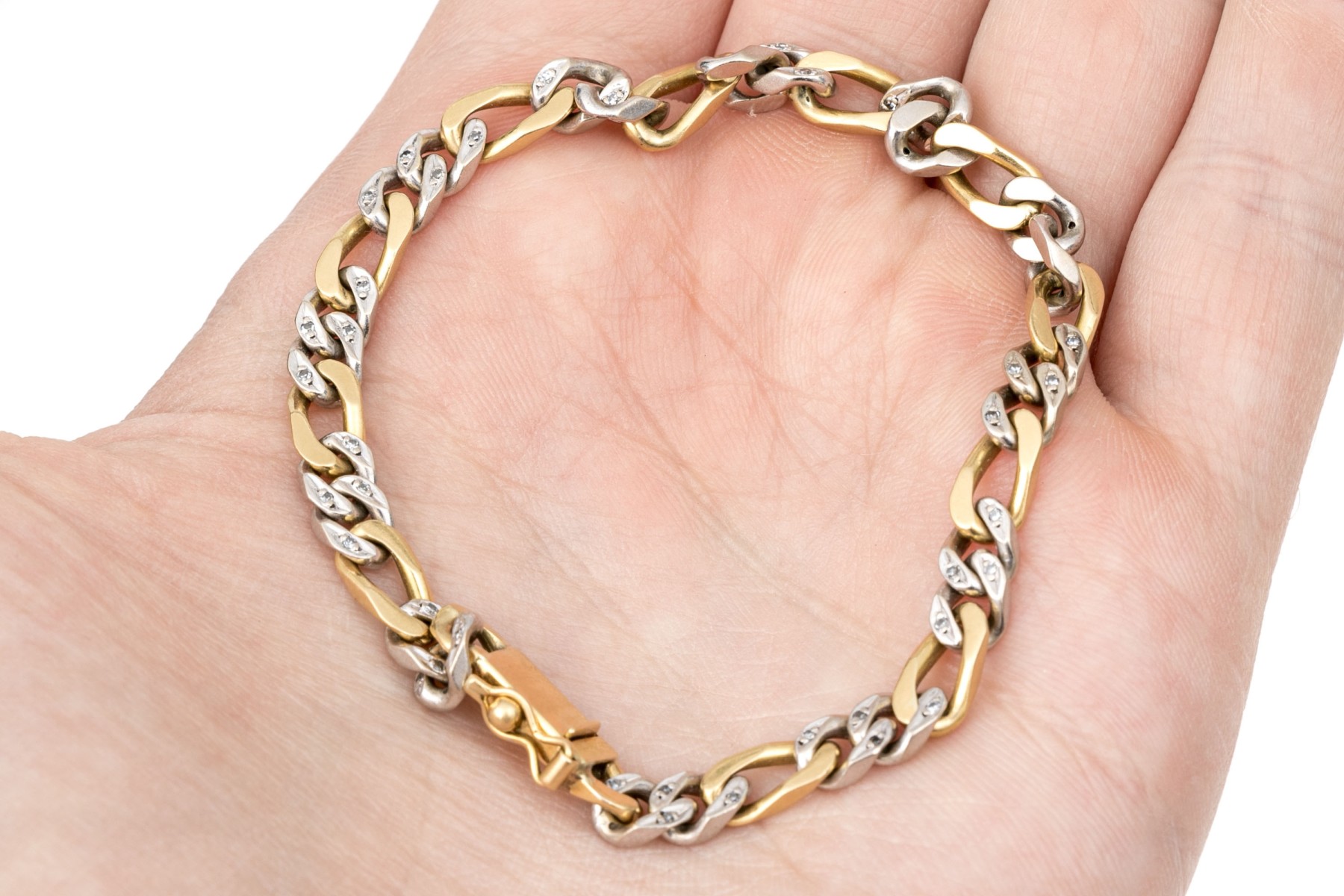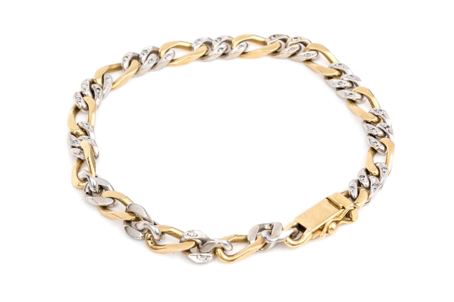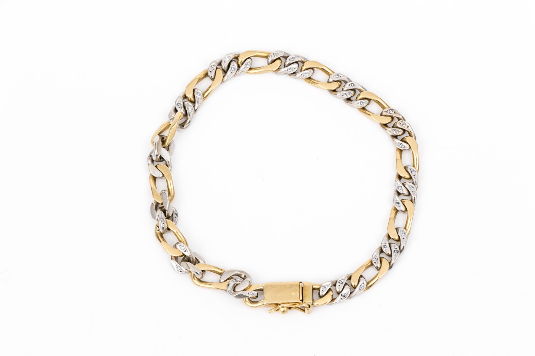 18k yellow and white gold diamond set figaro link bracelet, app. 0.12 TCW, finished with a box clasp and a figure eight safety