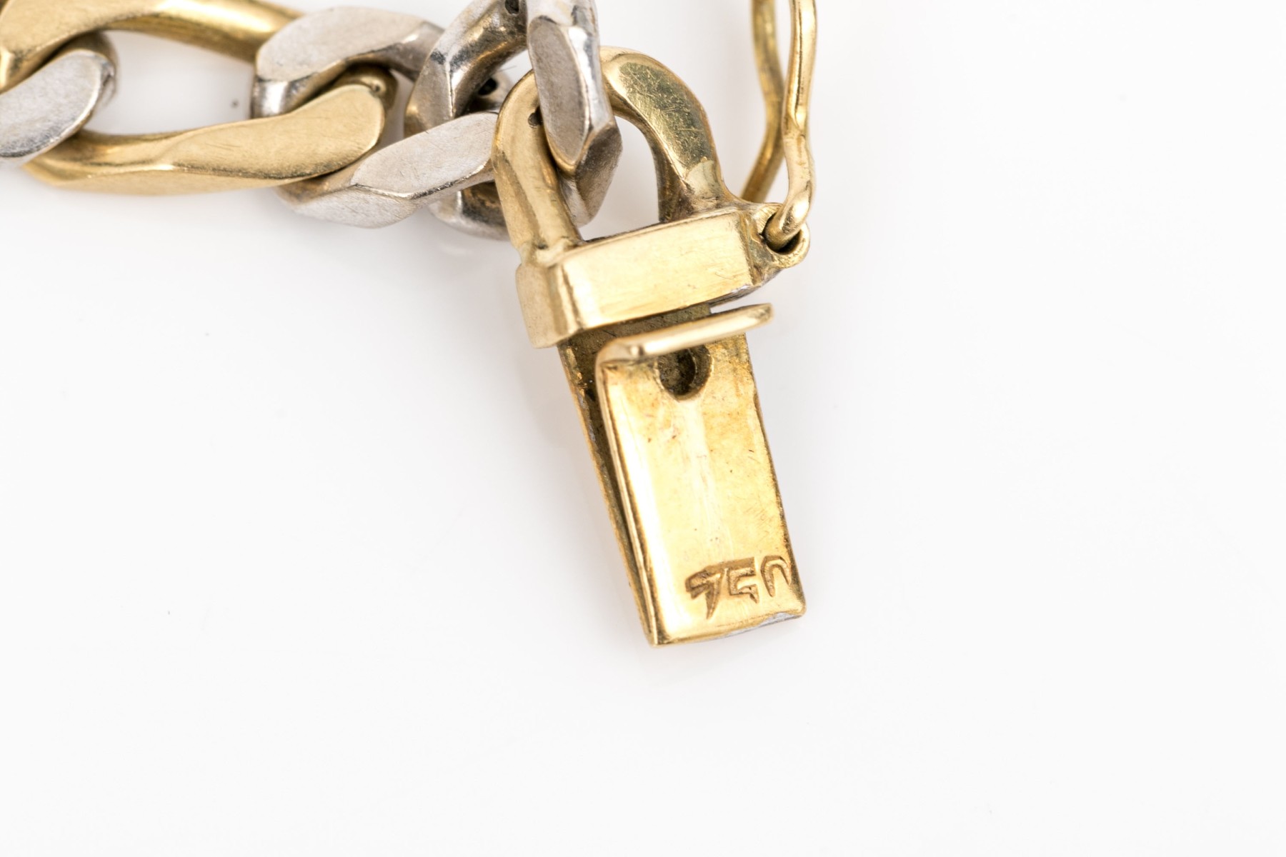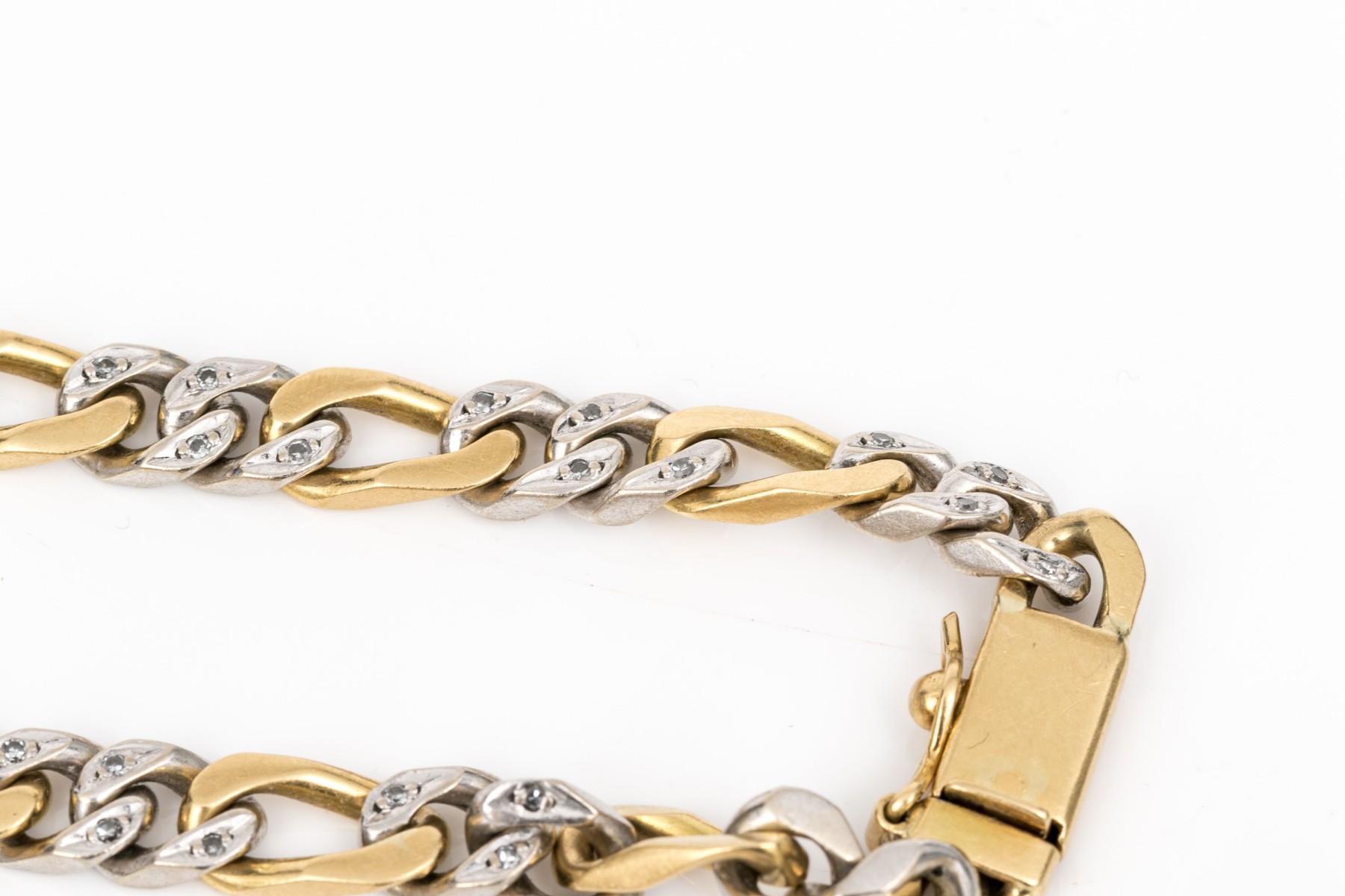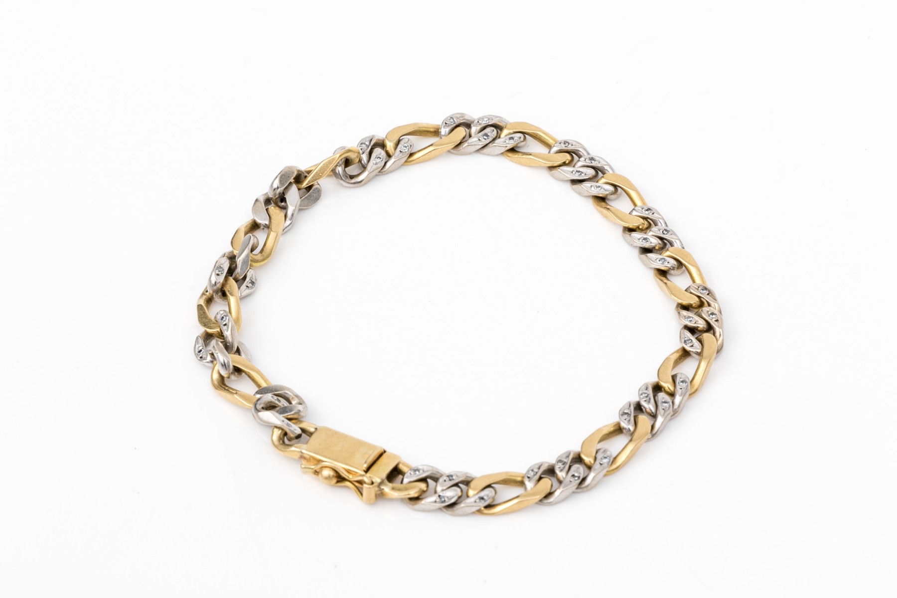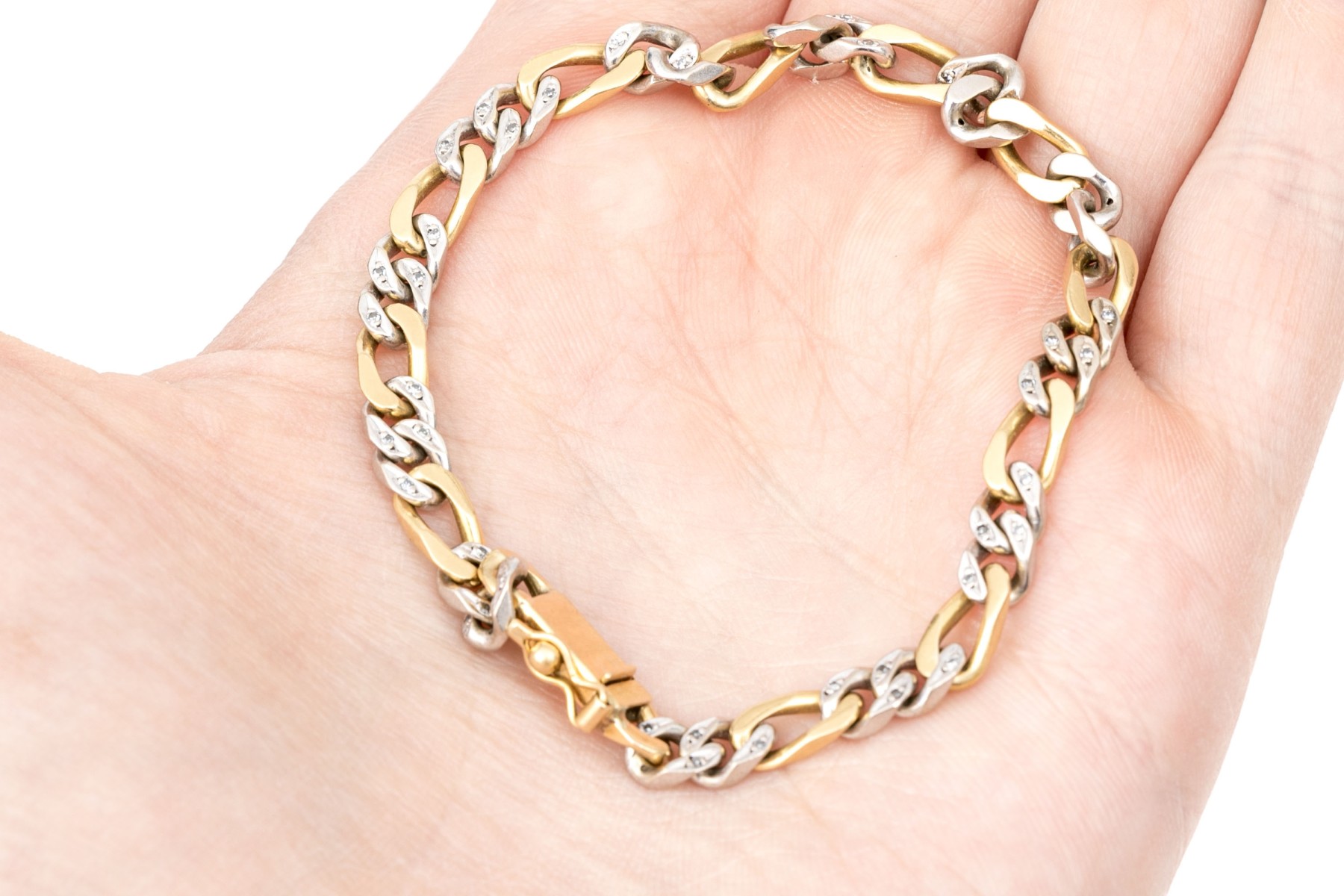 18k yellow and white gold diamond set figaro link bracelet, app. 0.12 TCW, finished with a box clasp and a figure eight safety