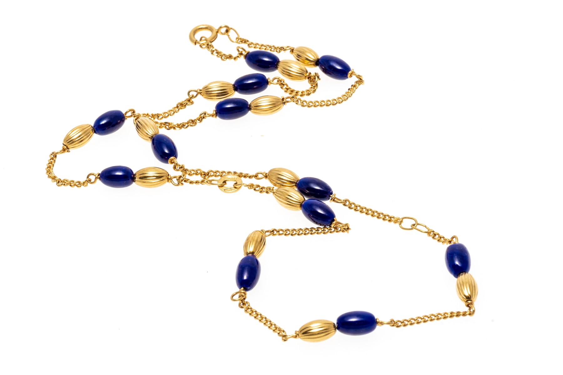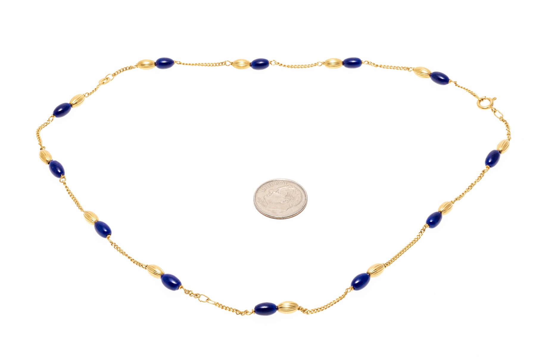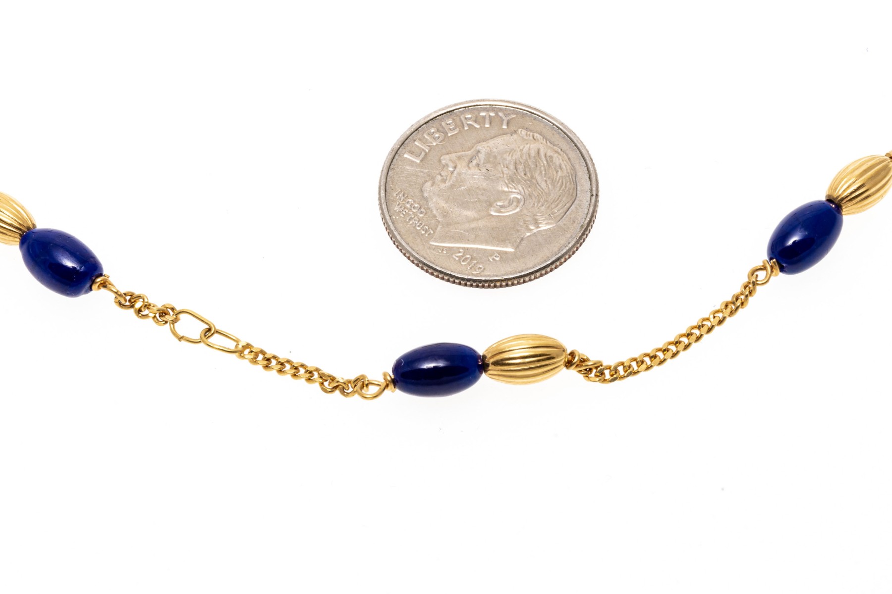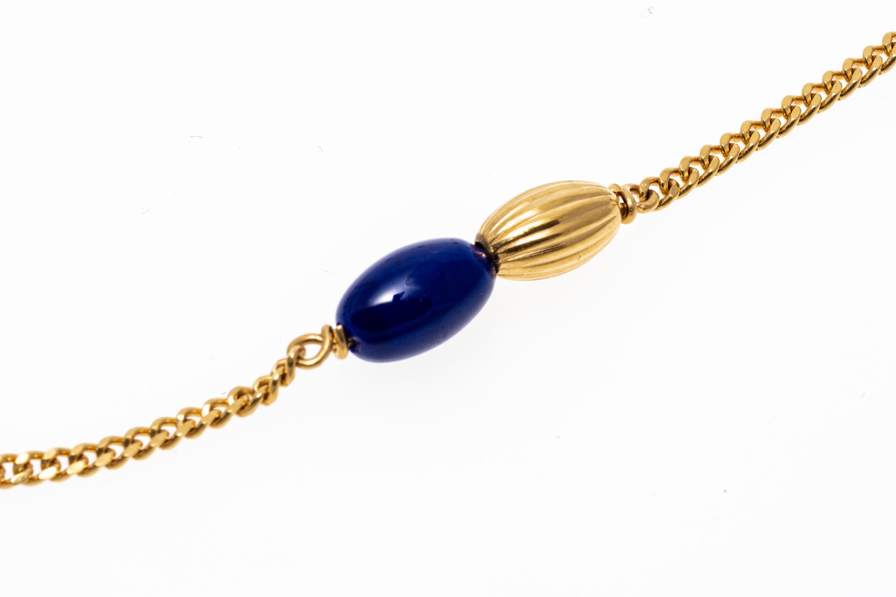 An 18K yellow gold curb style chain necklace. Set at stations along the chain are elongated ribbed gold beads with matching deep blue colored beads. The necklace secures with a spring ring clasp.