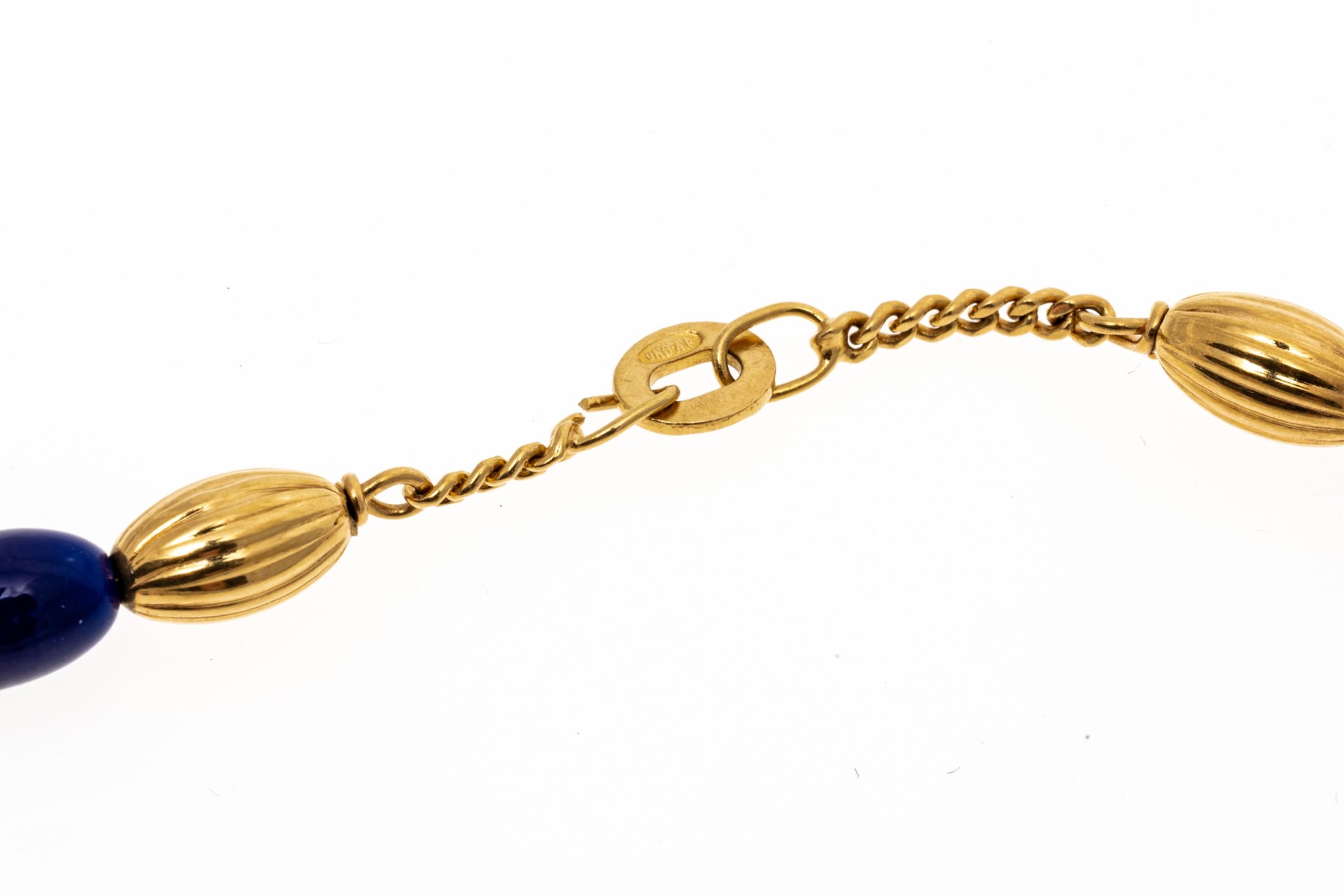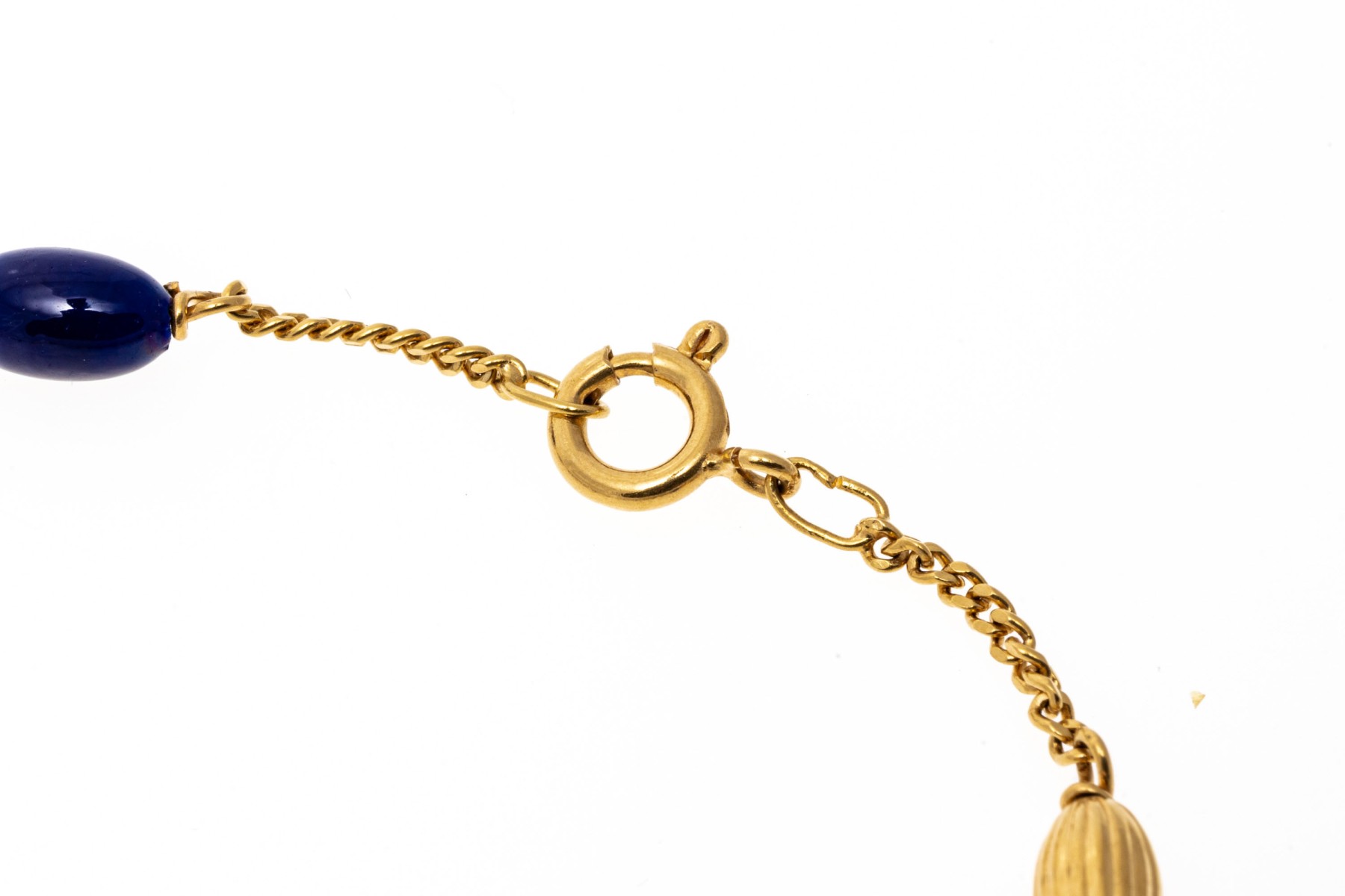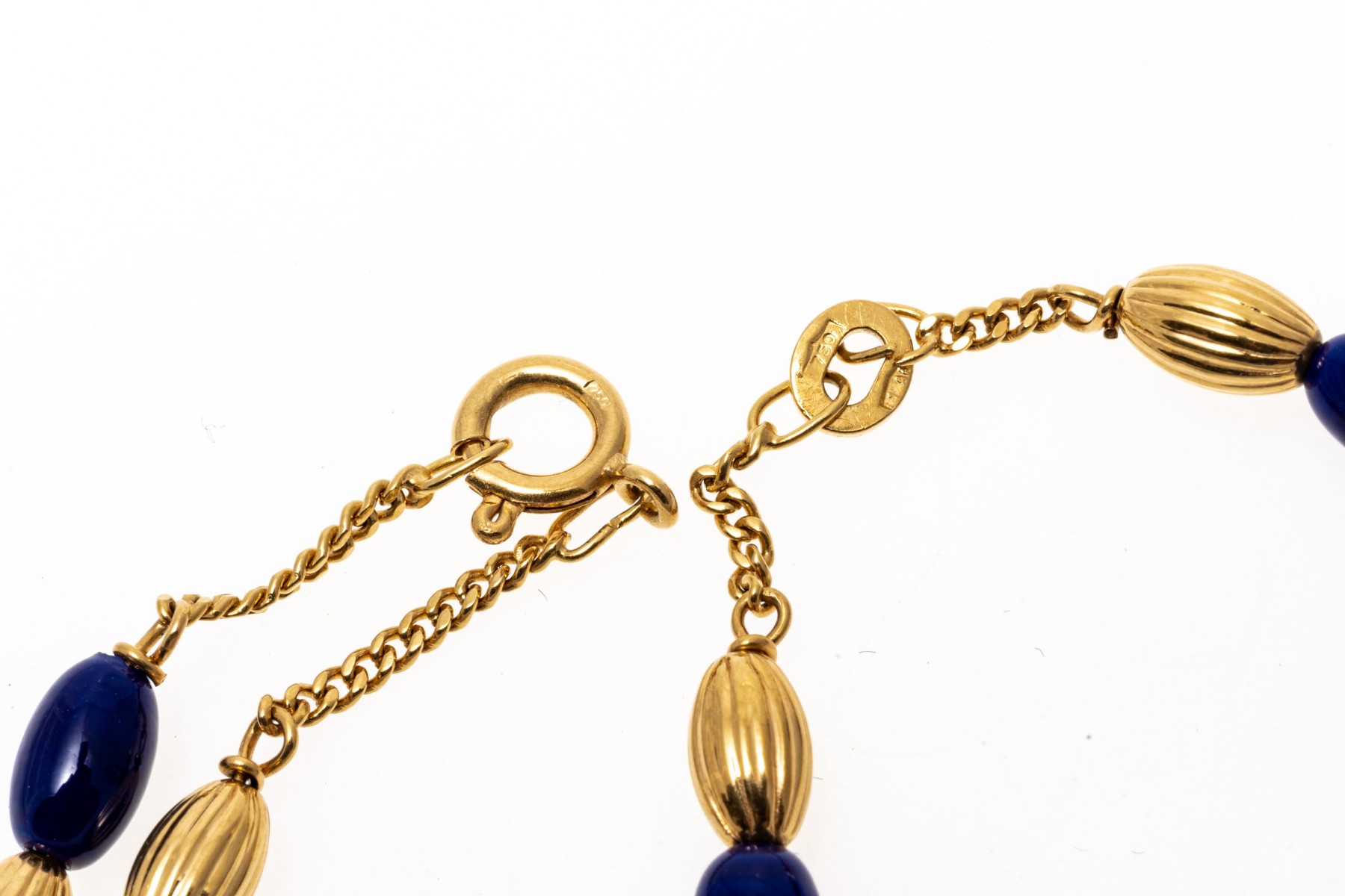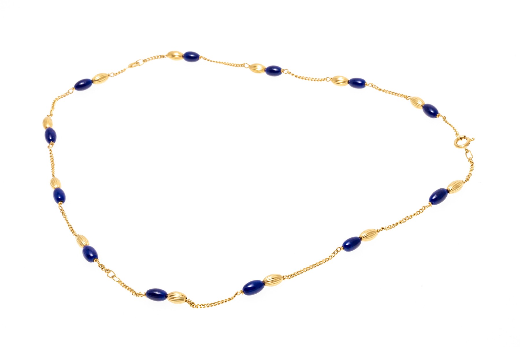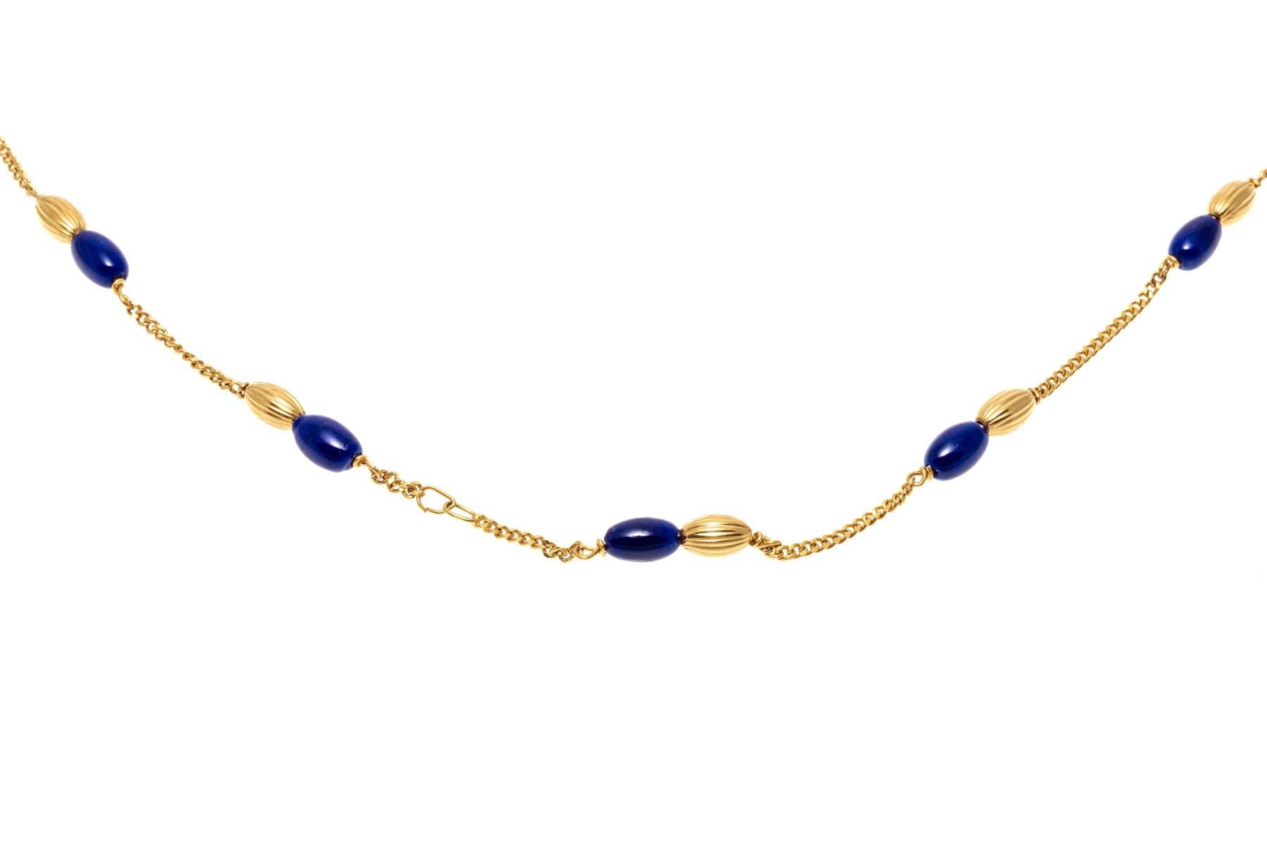 An 18K yellow gold curb style chain necklace. Set at stations along the chain are elongated ribbed gold beads with matching deep blue colored beads. The necklace secures with a spring ring clasp.