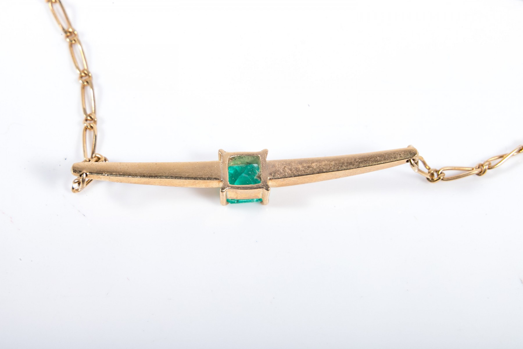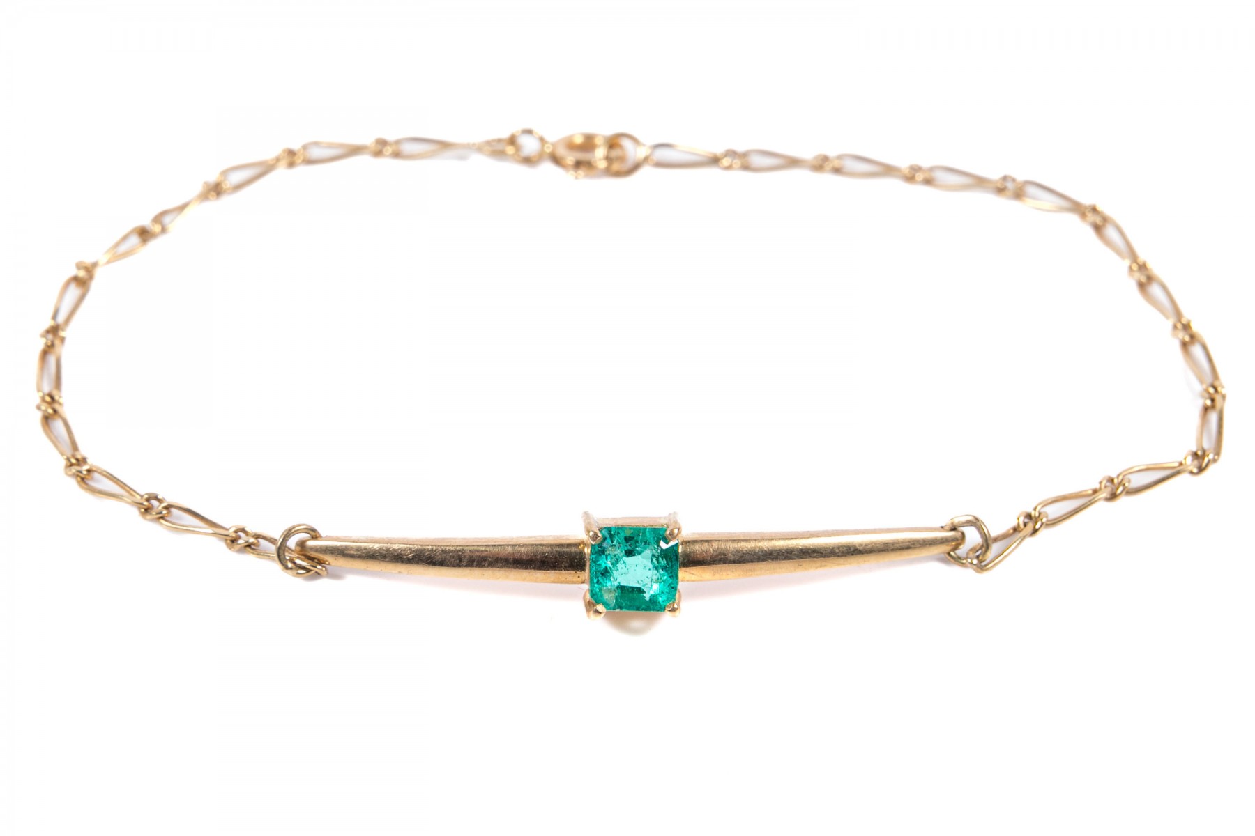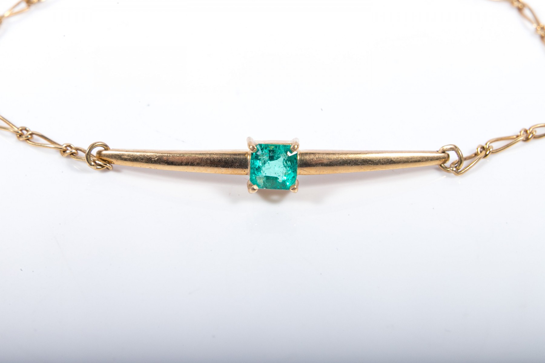 A beautiful yellow gold bracelet displaying a vibrant green emerald on a crescent focal piece, flanked by a curb chain alternating with elongated links for an elegant and visually striking appearance.