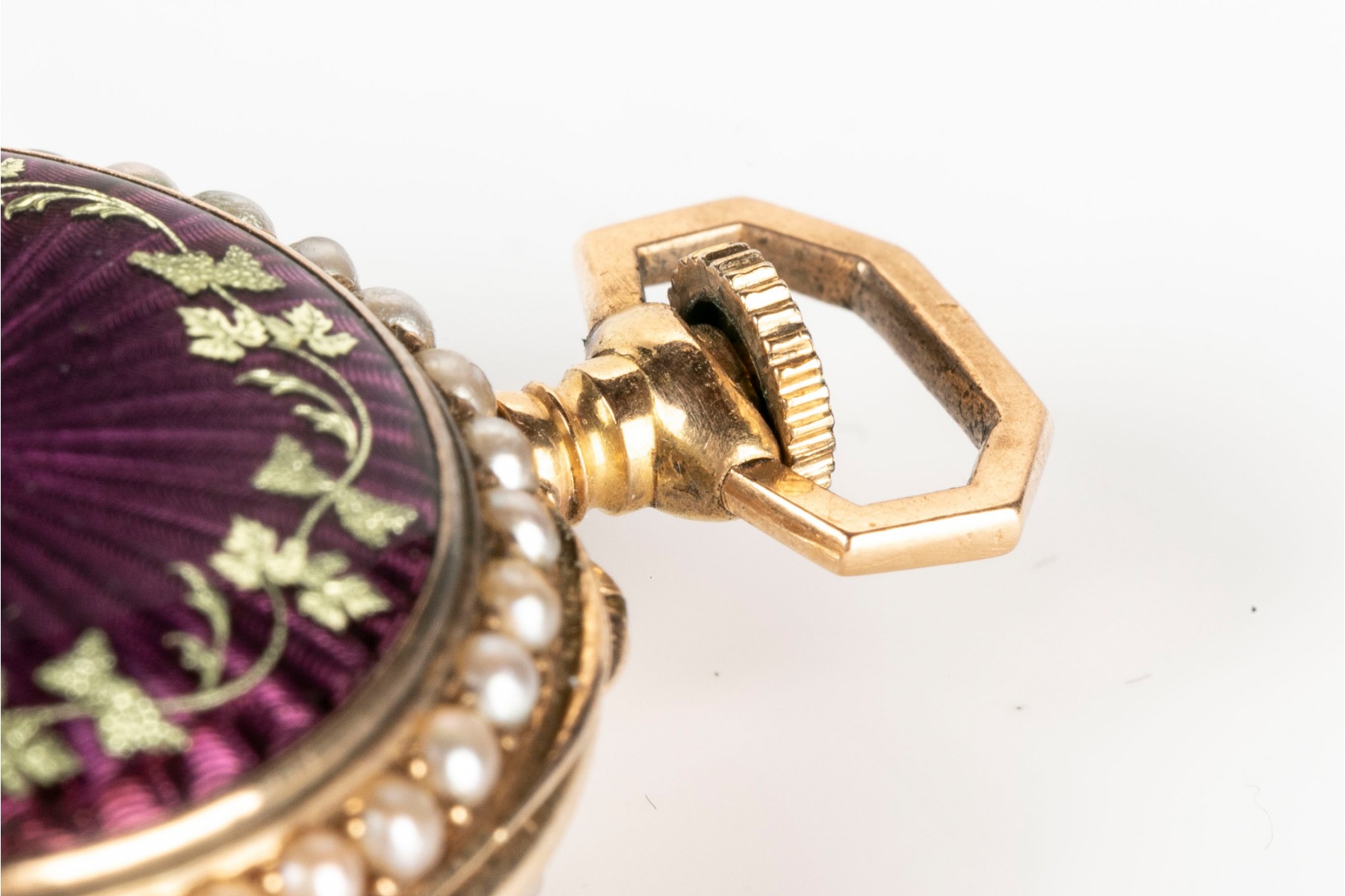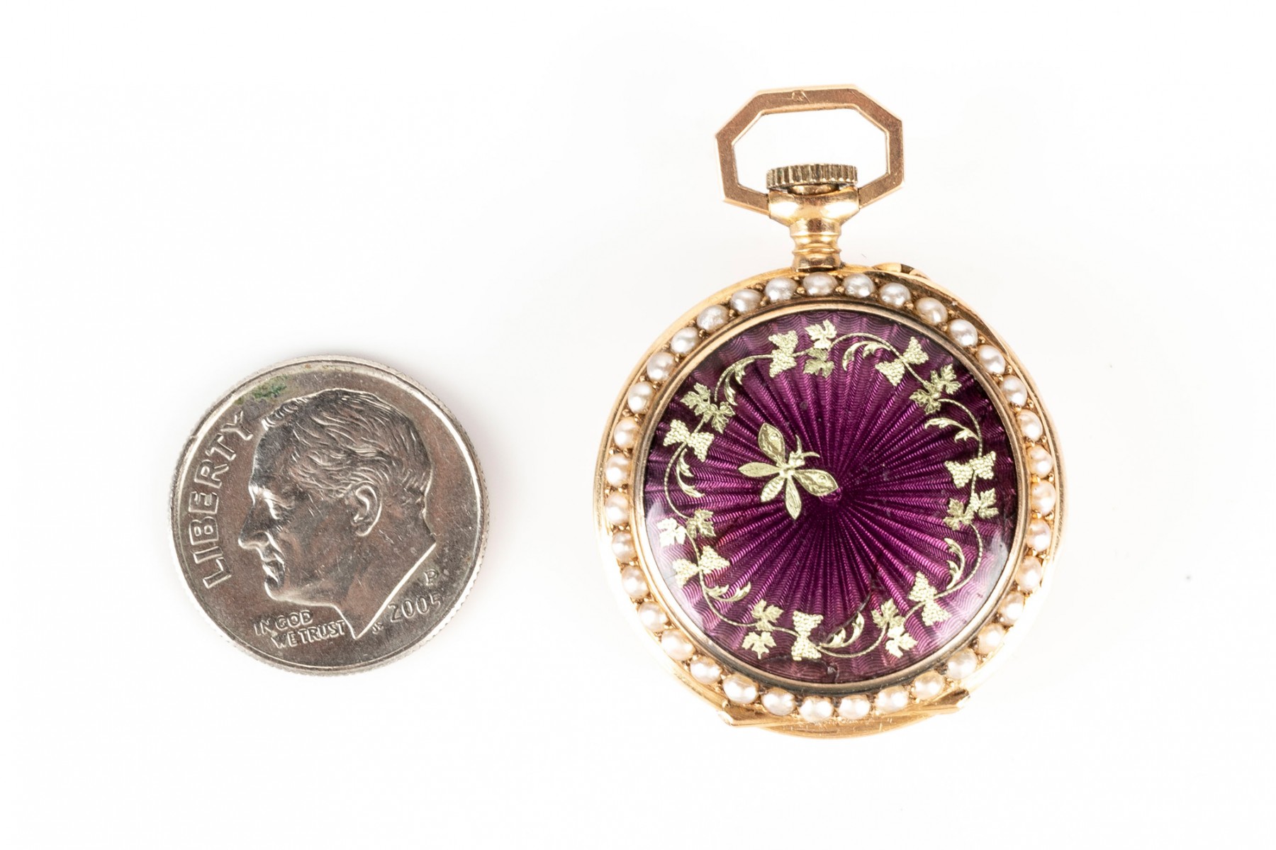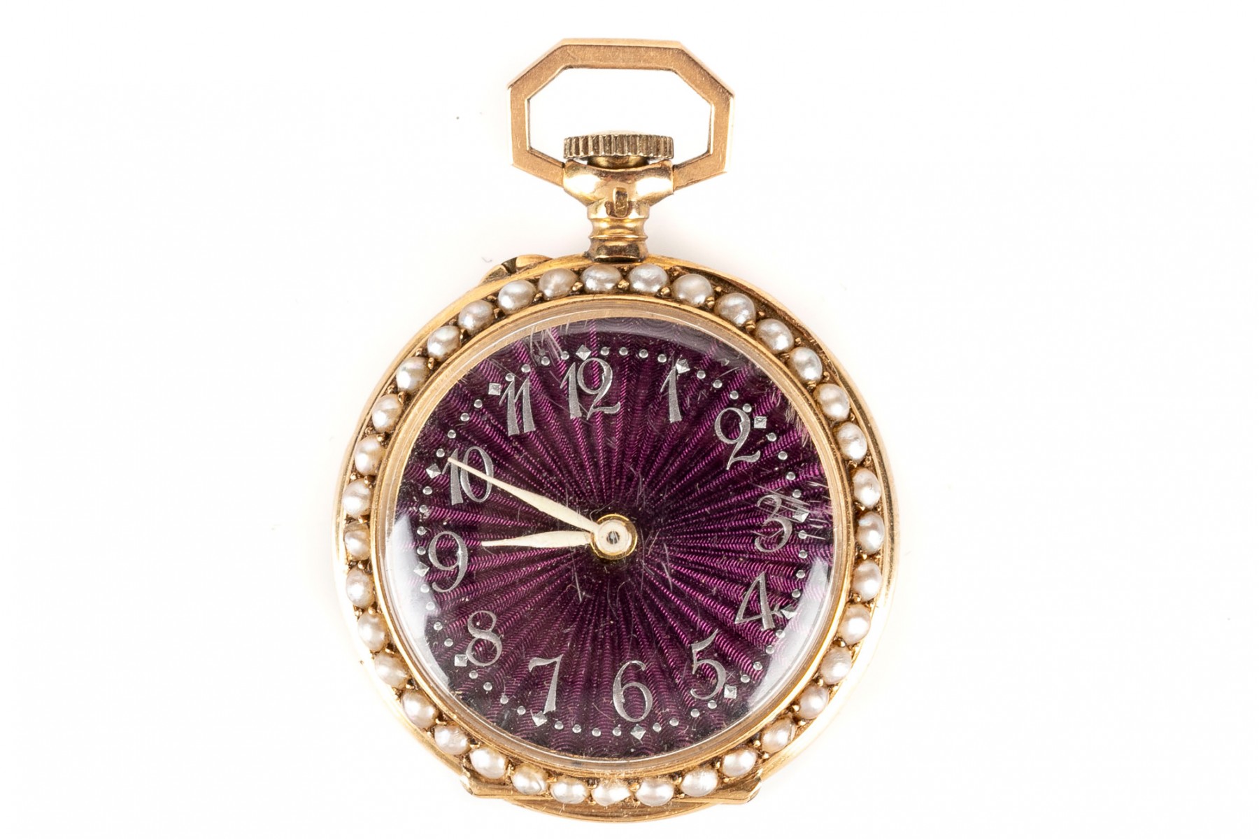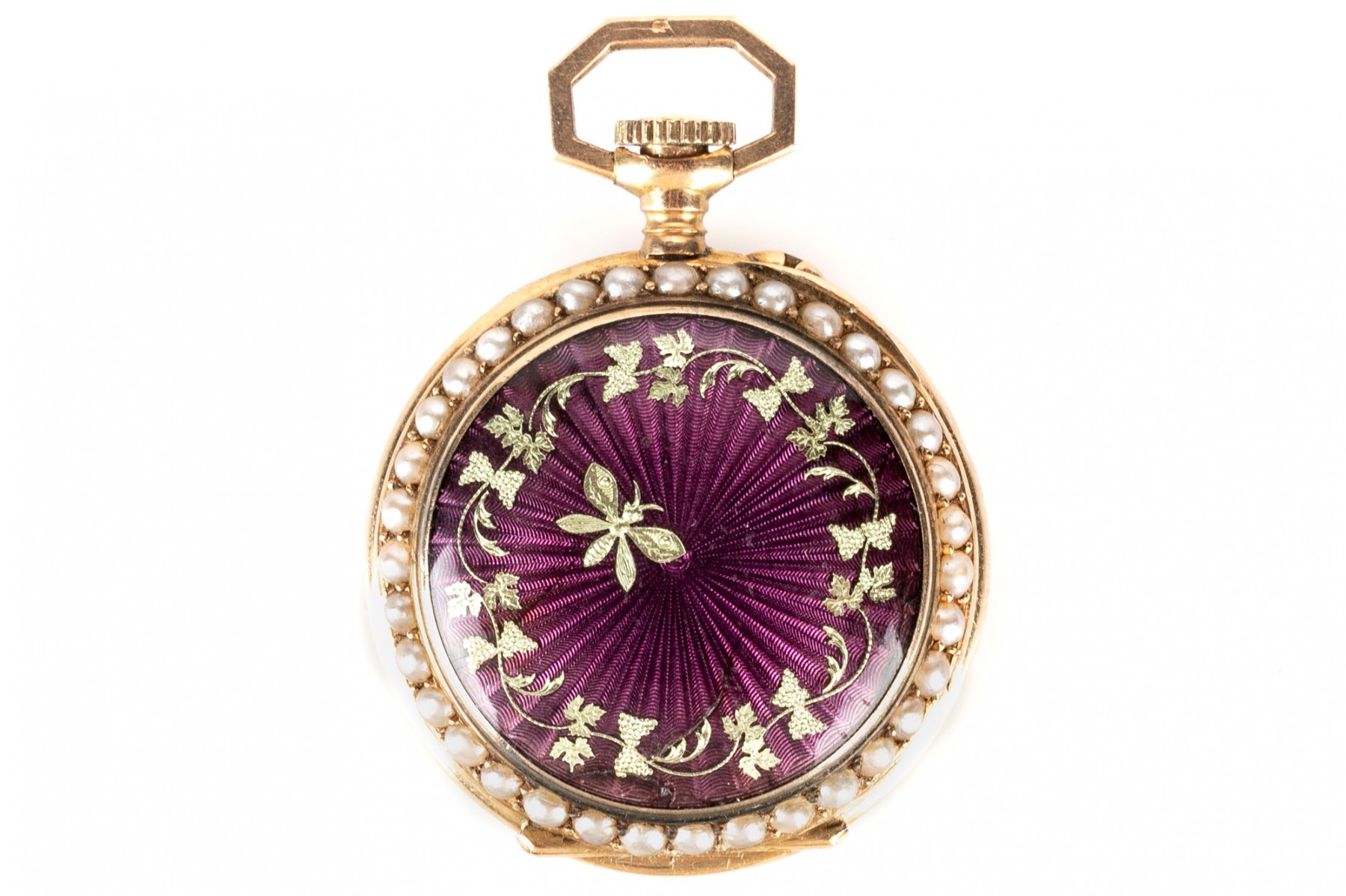 18k yellow gold antique lever set purple guilloche enamel pendant watch. This lovely pendant watch has a guilloche enamel dial and case back, and is decorated with a seed pearl border and a butterfly and foliate patterning