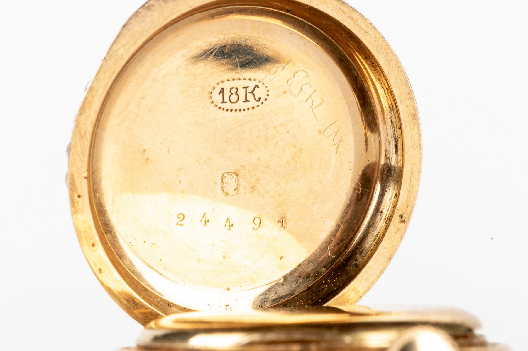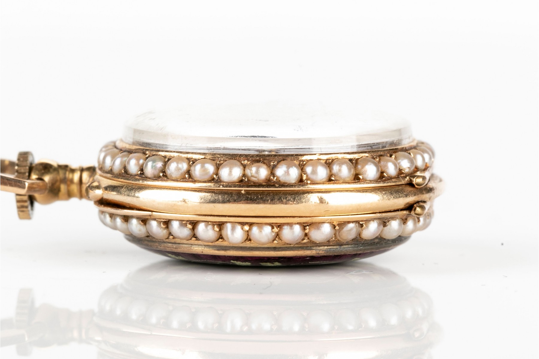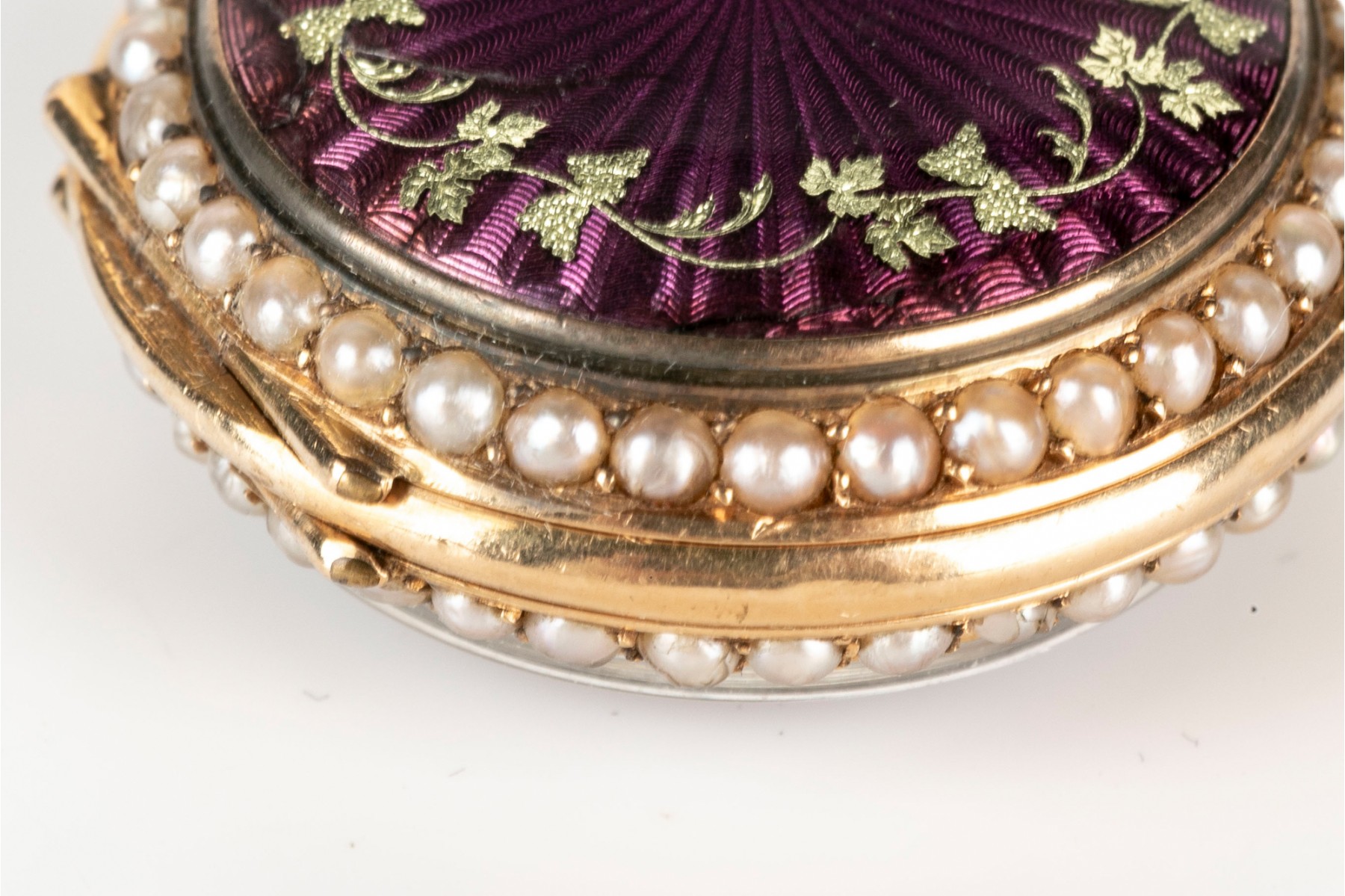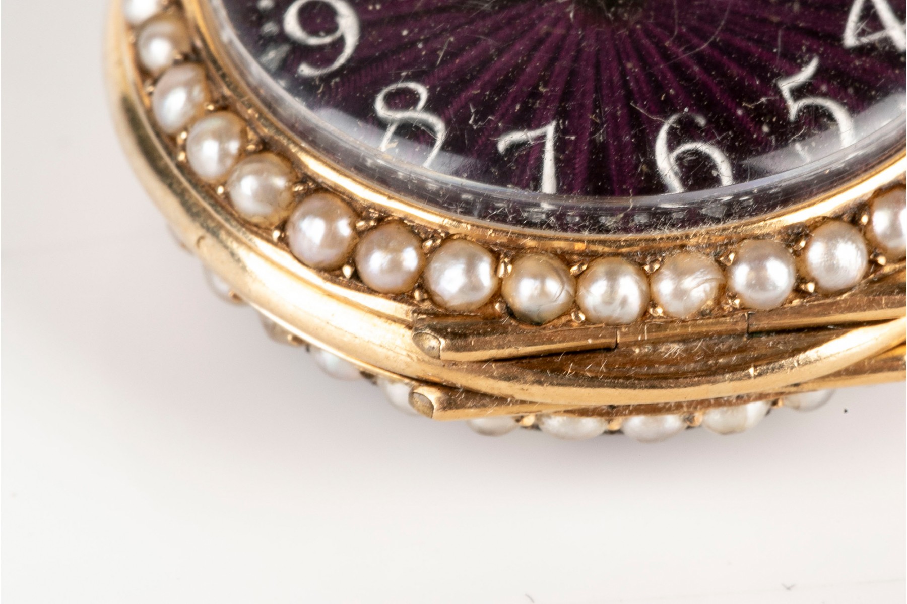 18k yellow gold antique lever set purple guilloche enamel pendant watch. This lovely pendant watch has a guilloche enamel dial and case back, and is decorated with a seed pearl border and a butterfly and foliate patterning