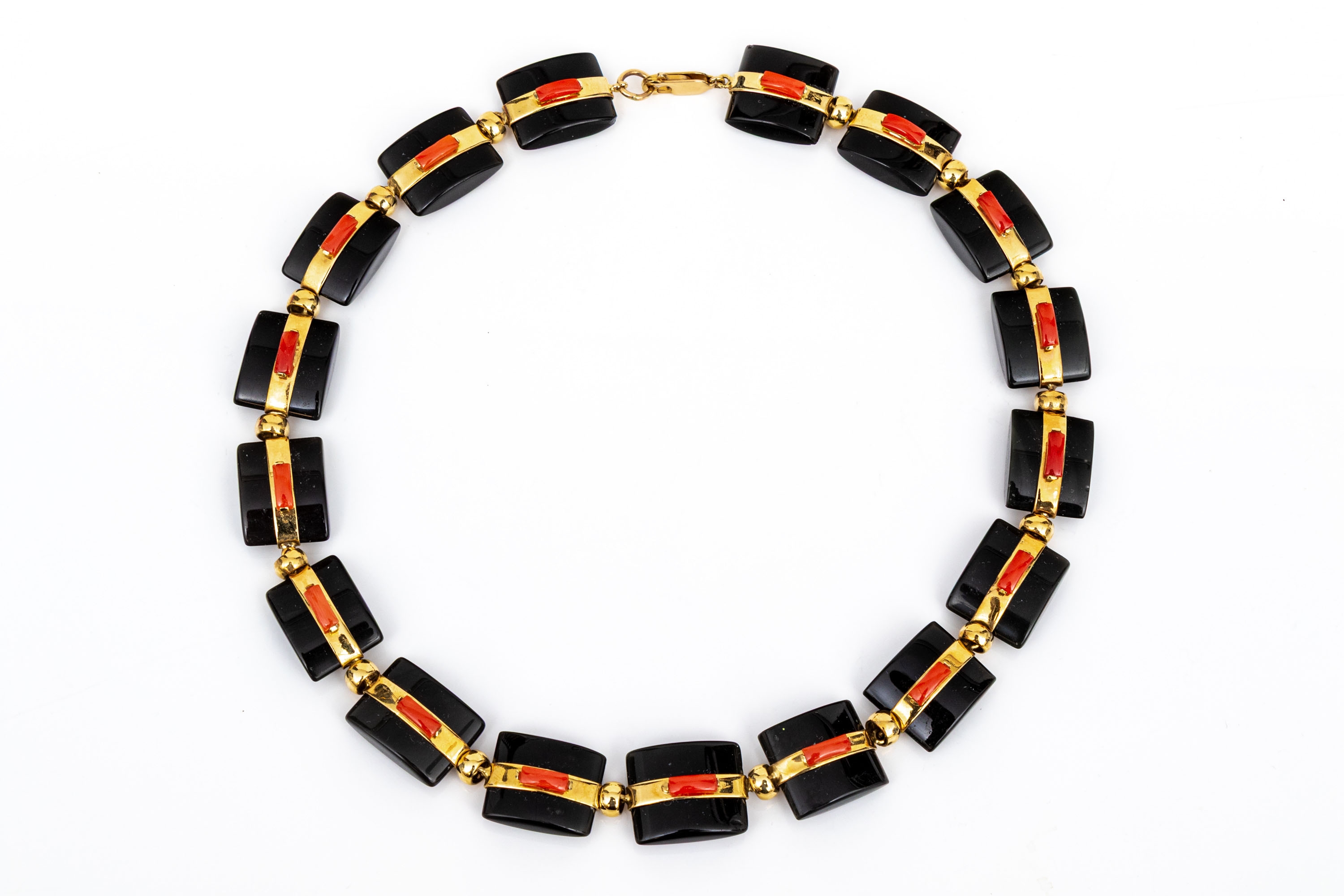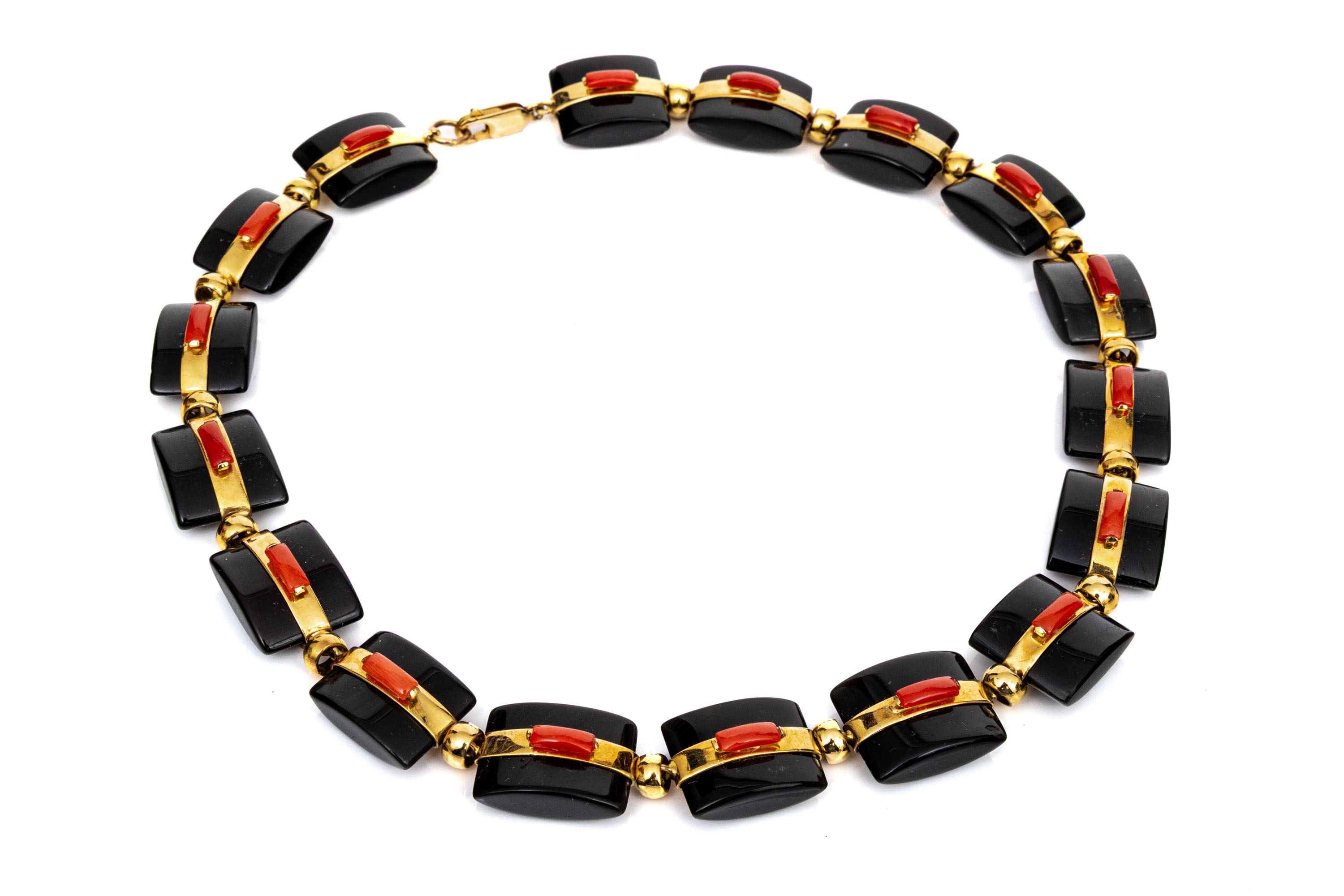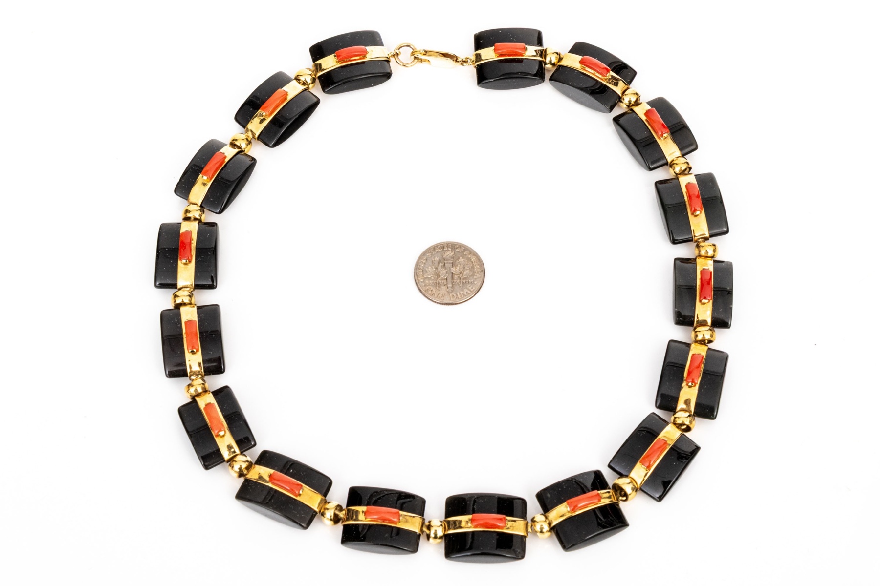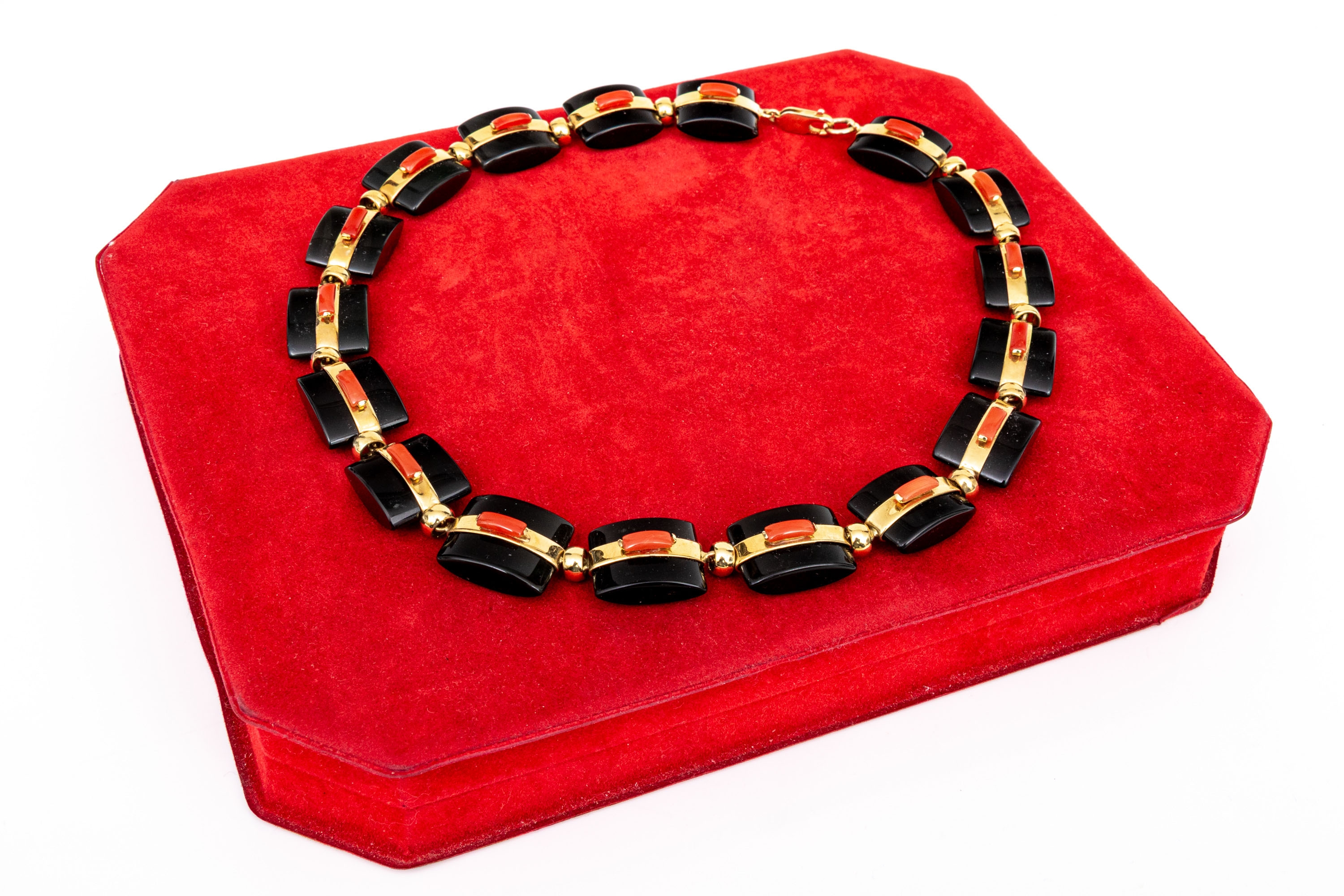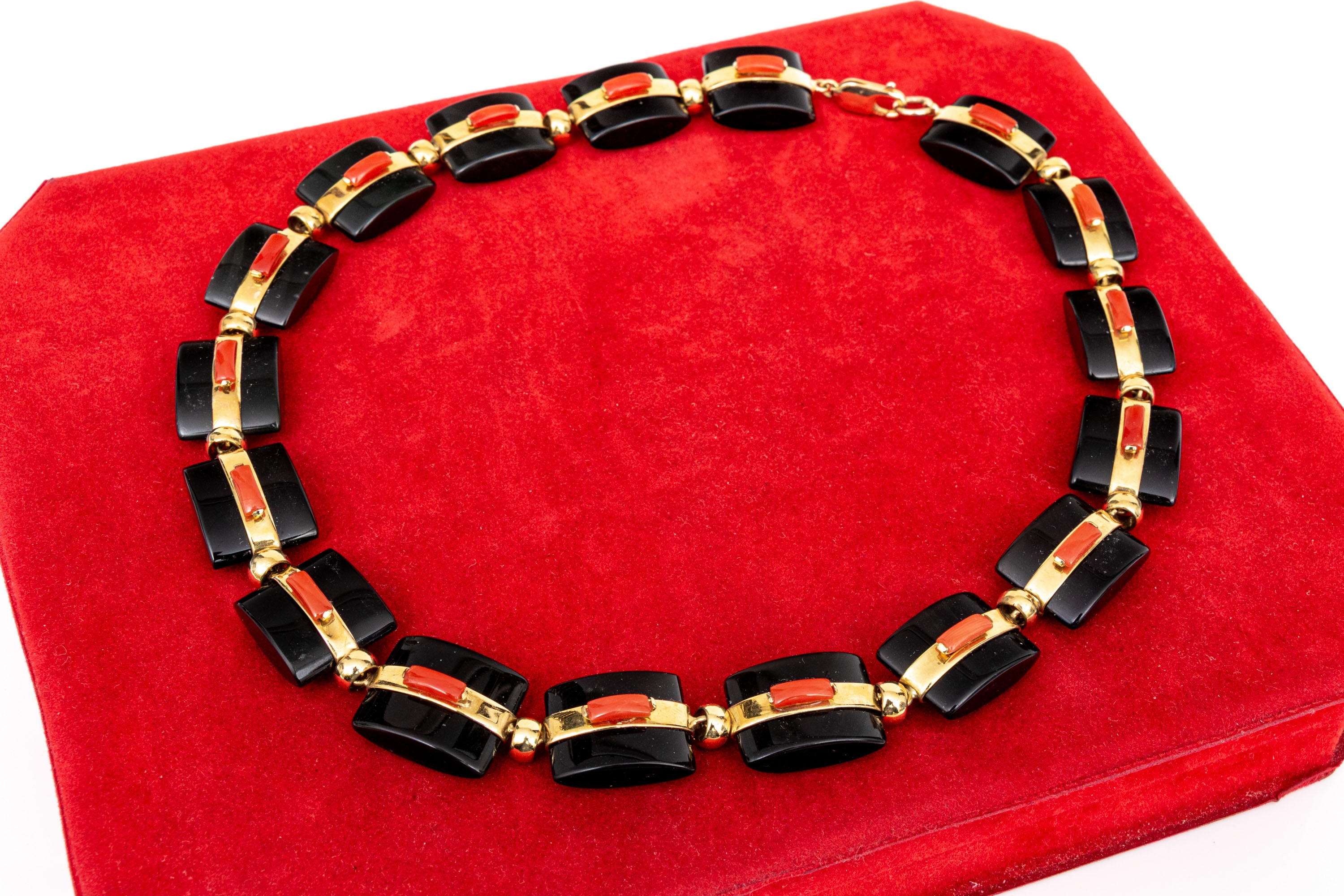 18k yellow gold beautiful chunky square black onyx pillow link and coral set necklace, finished with a 14k yellow gold lobster claw clasp