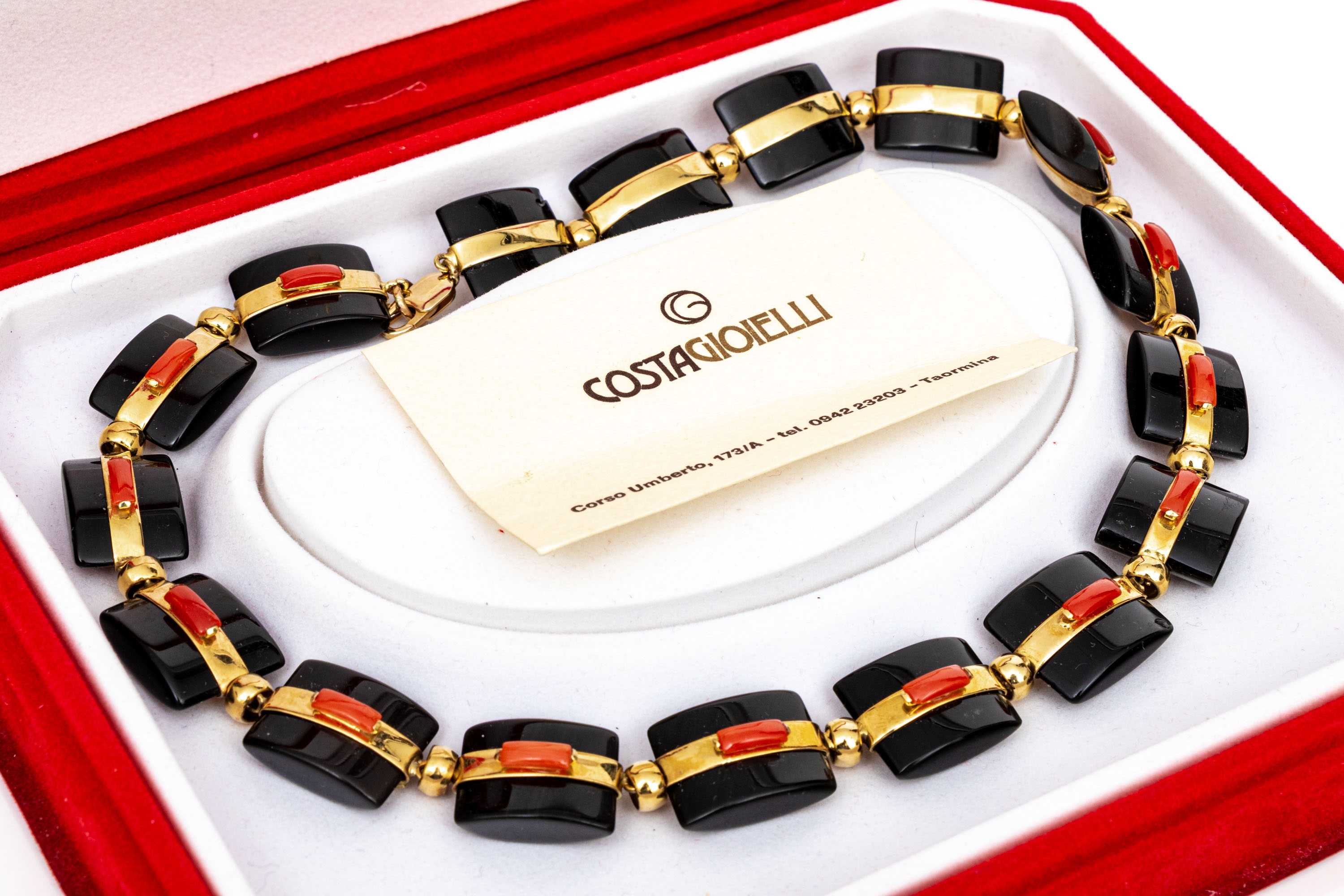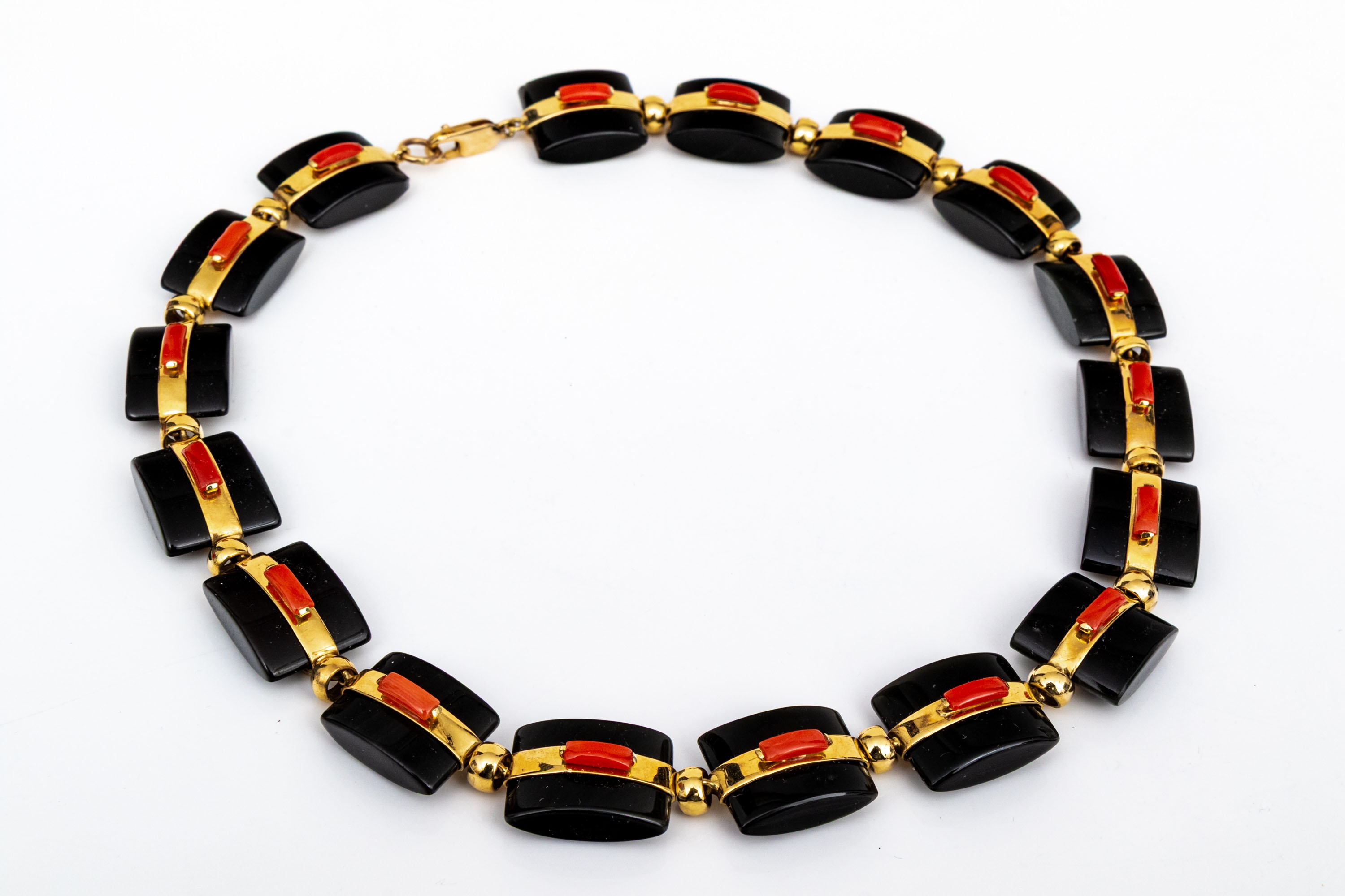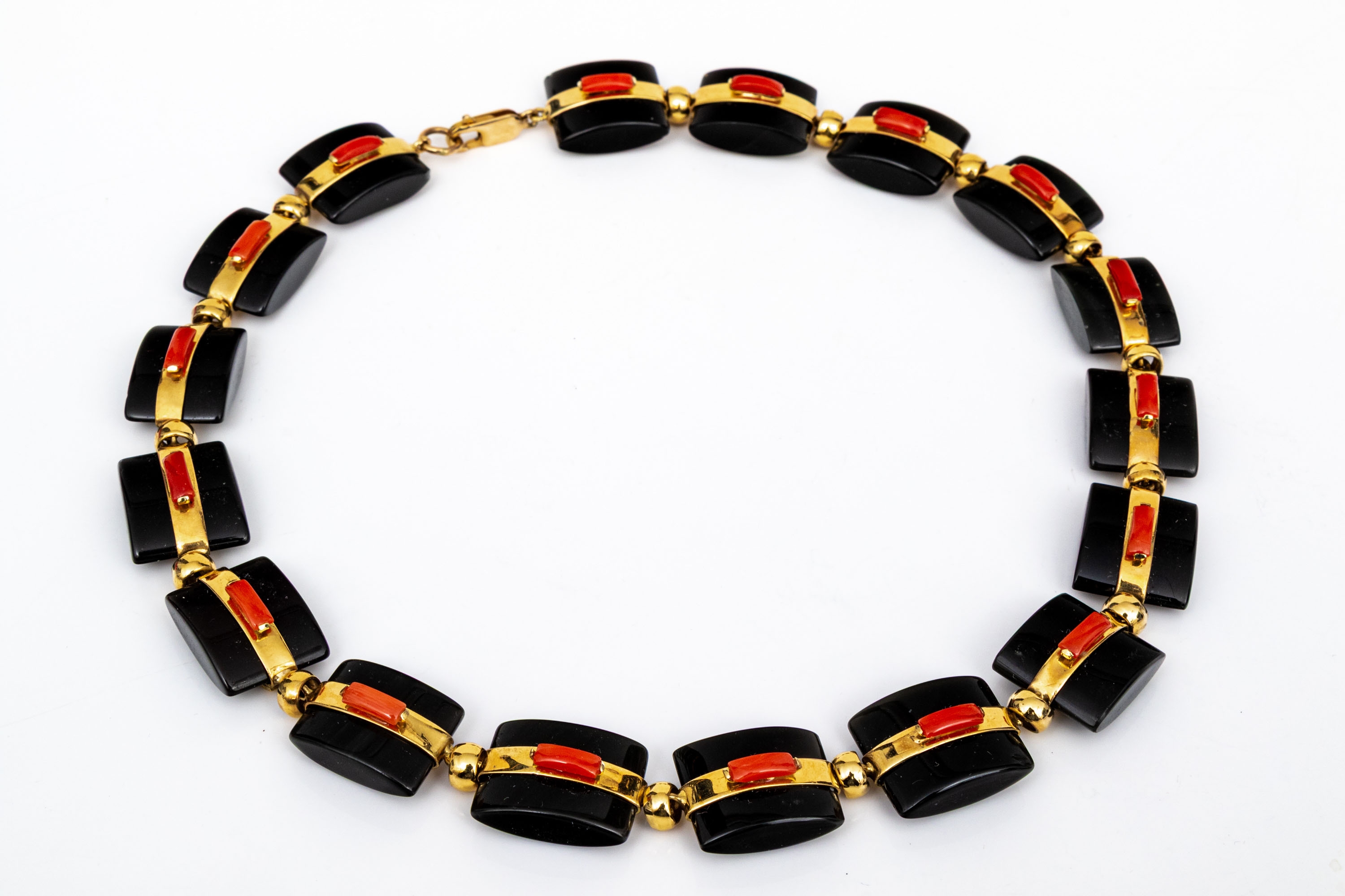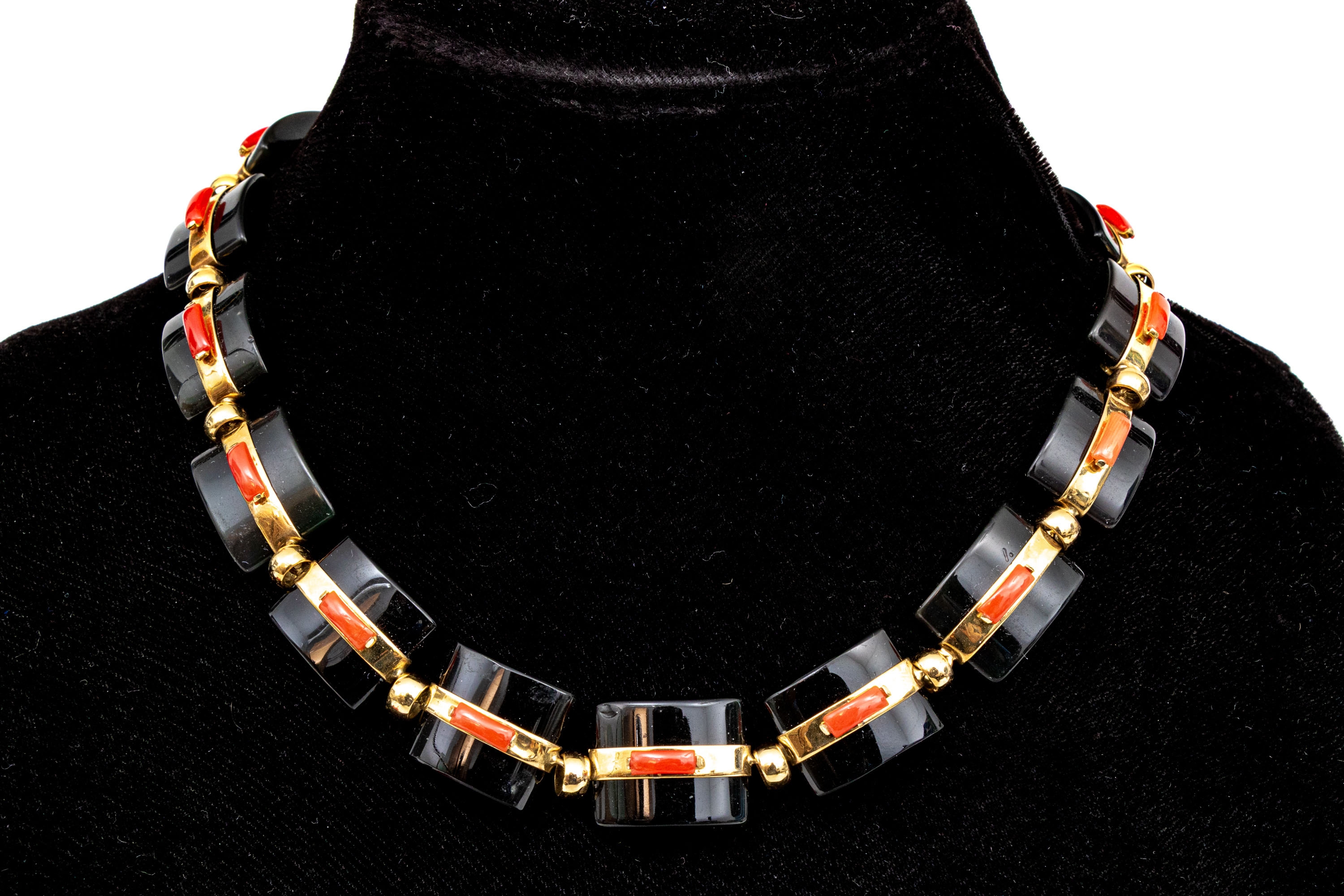18k yellow gold beautiful chunky square black onyx pillow link and coral set necklace, finished with a 14k yellow gold lobster claw clasp