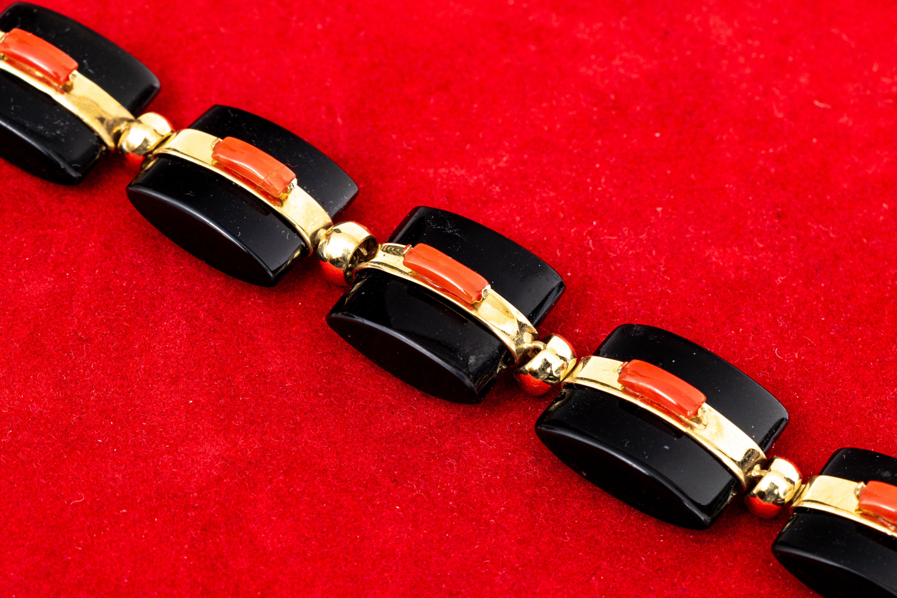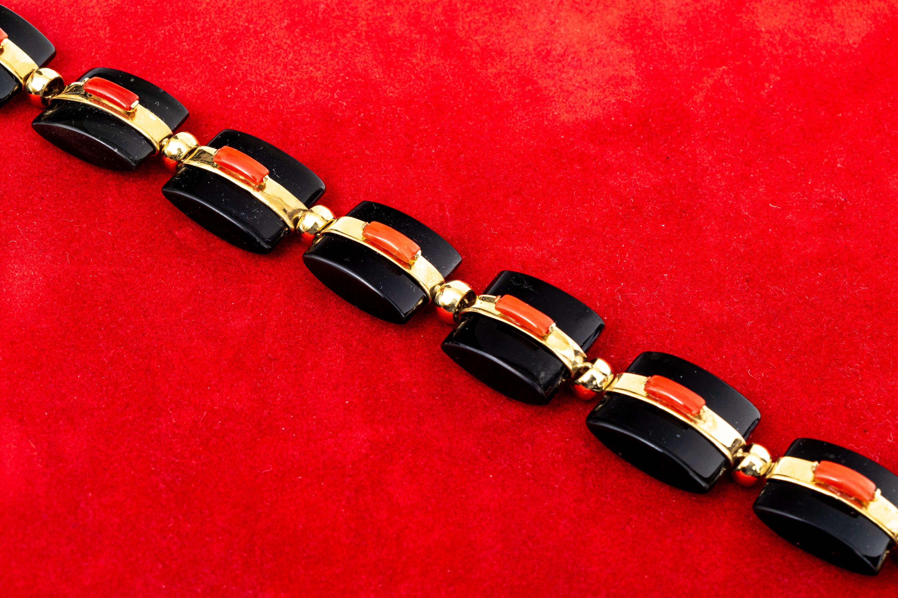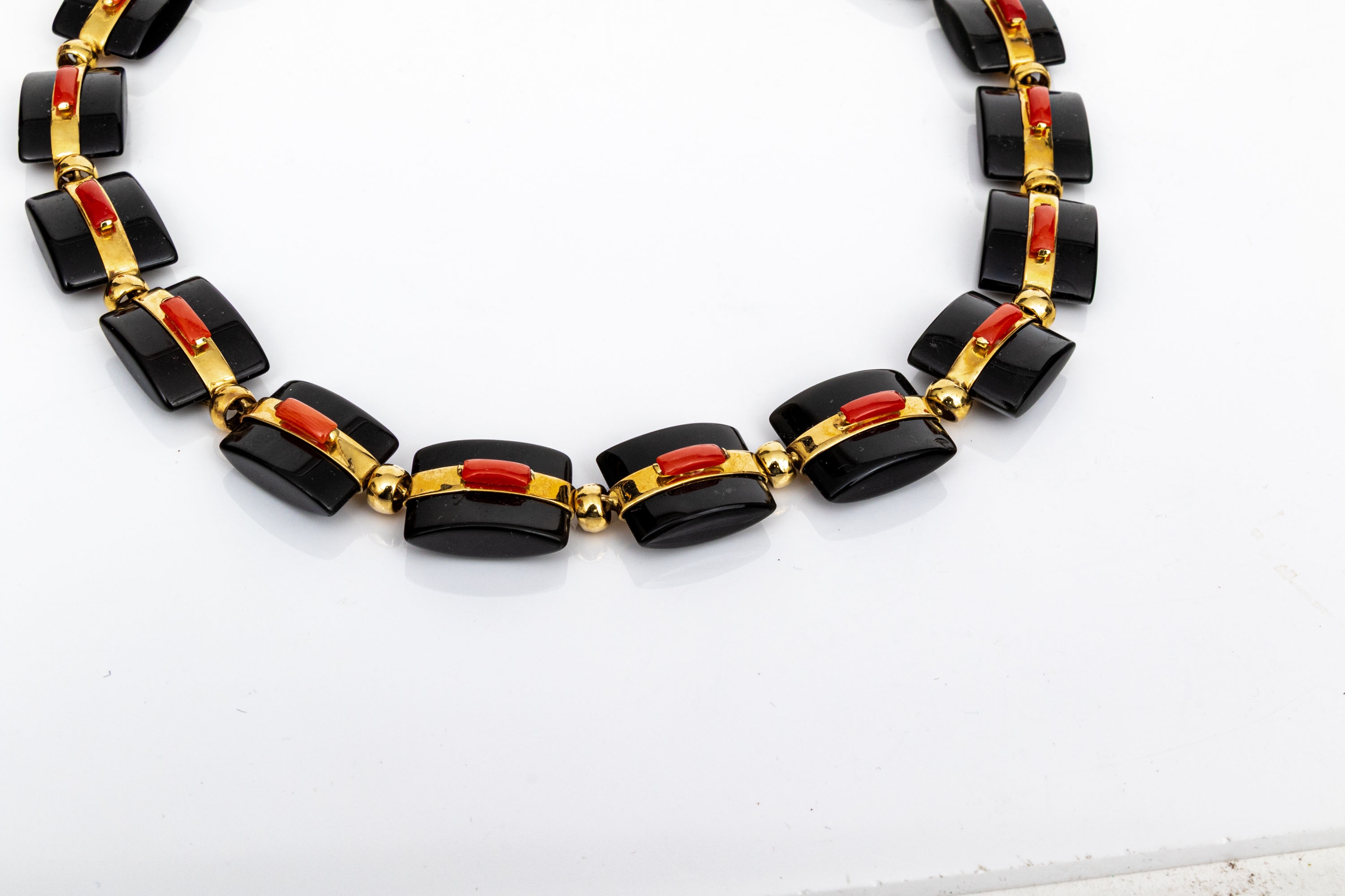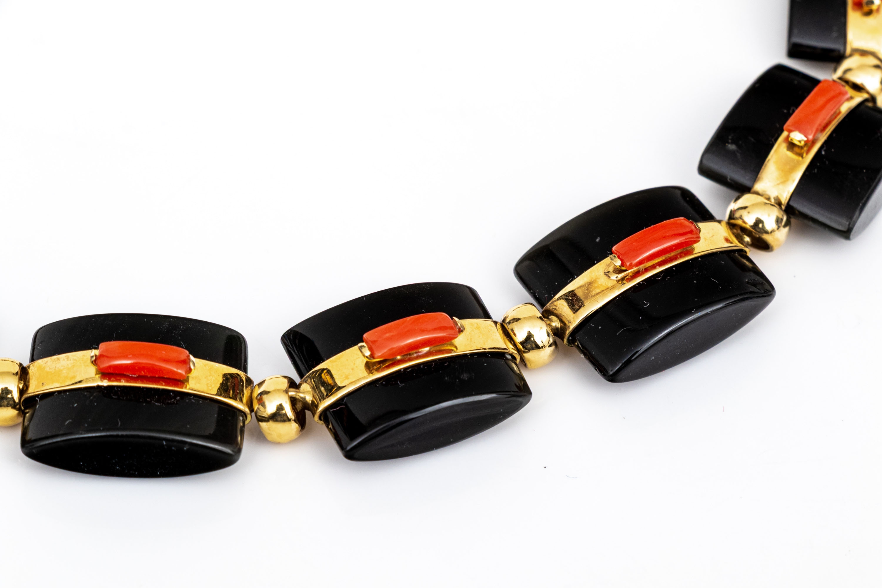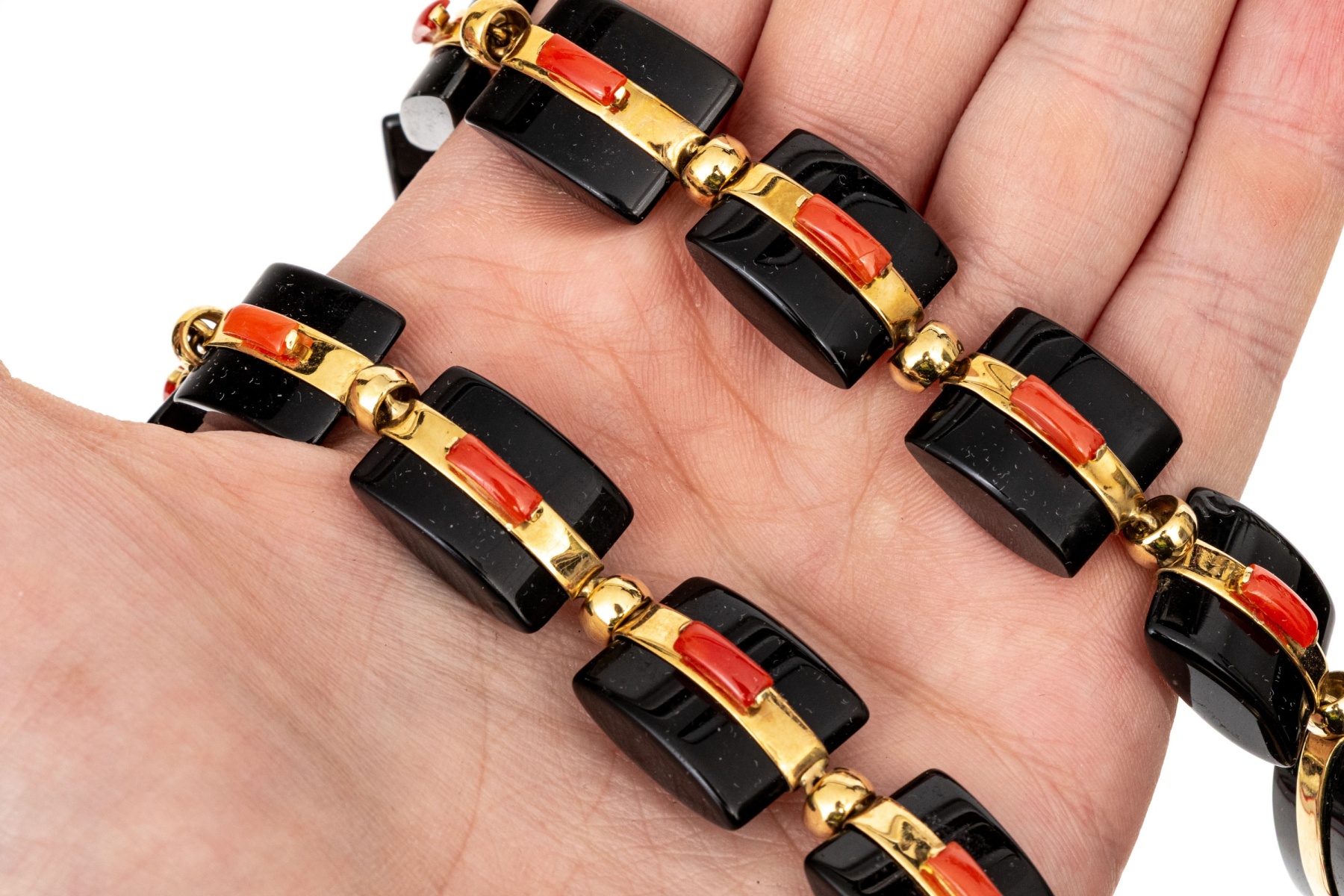 18k yellow gold beautiful chunky square black onyx pillow link and coral set necklace, finished with a 14k yellow gold lobster claw clasp