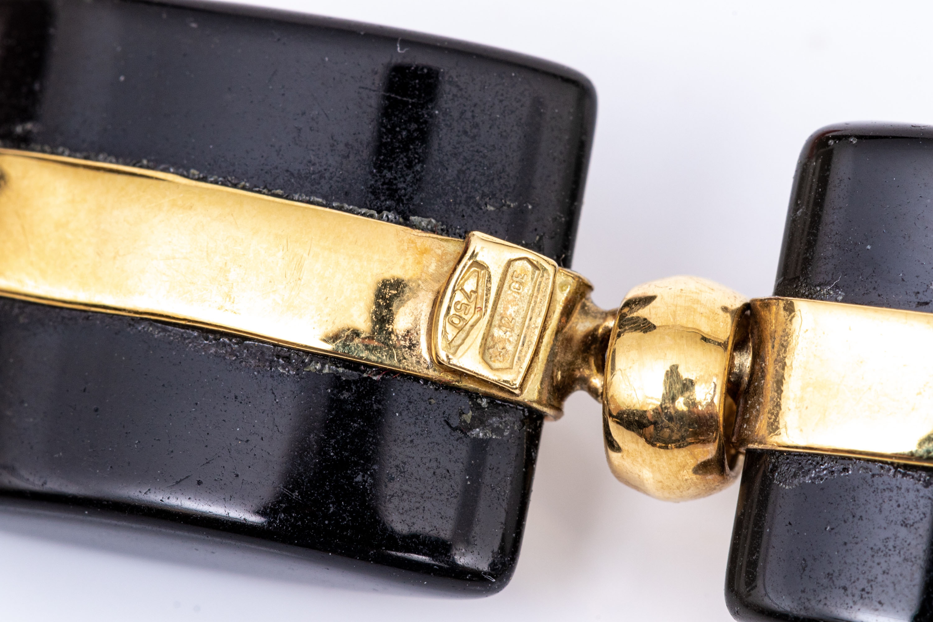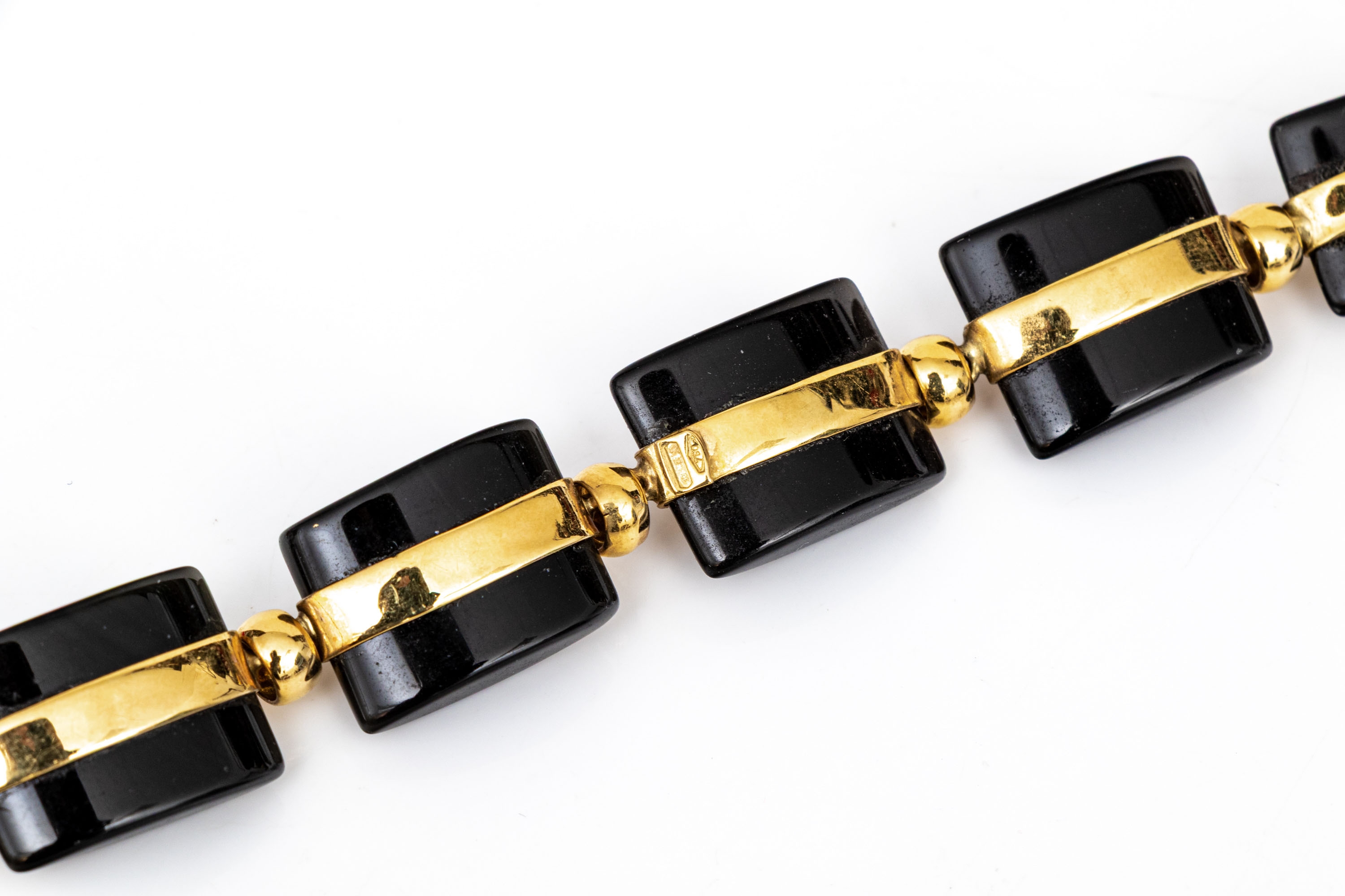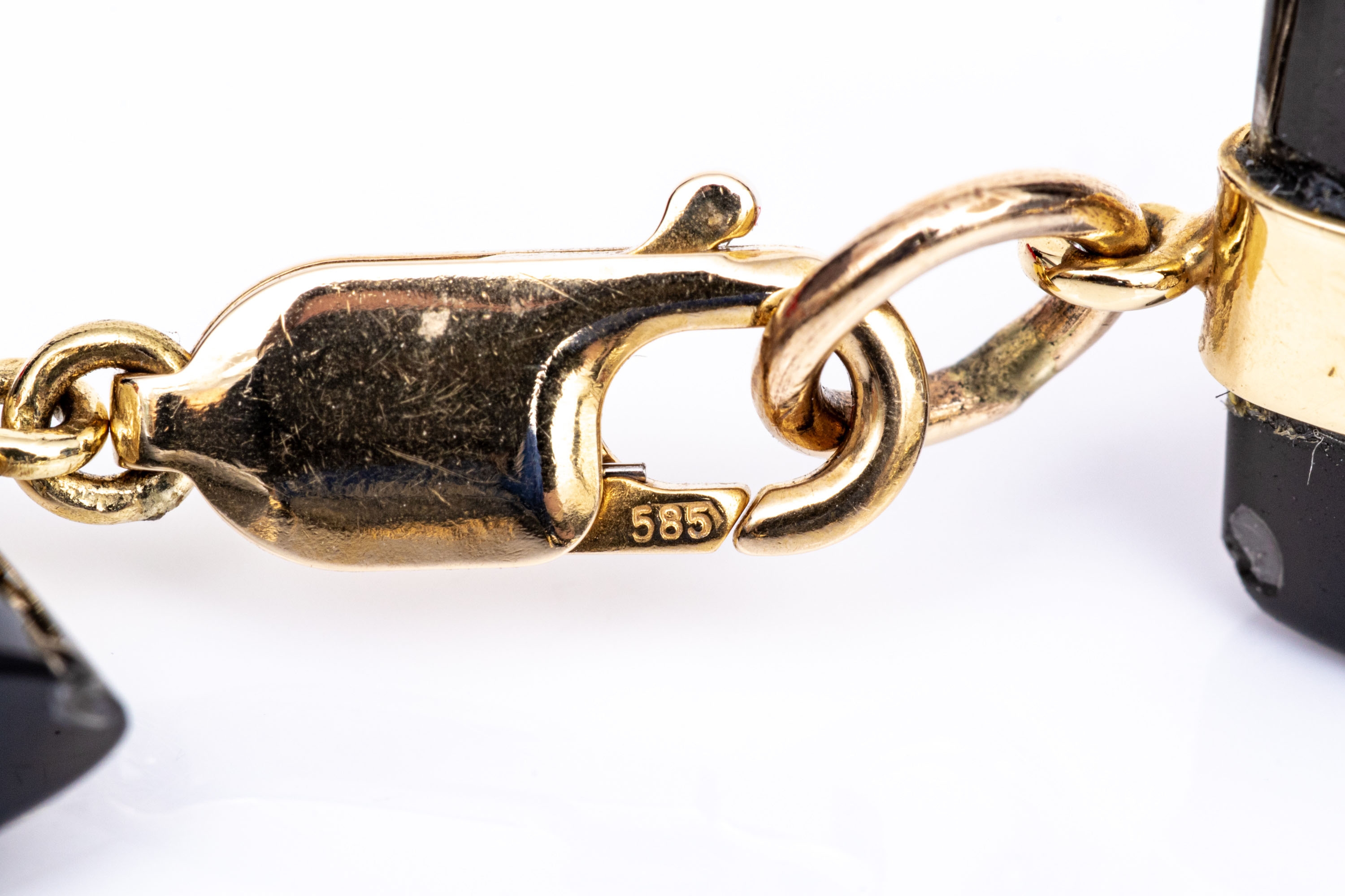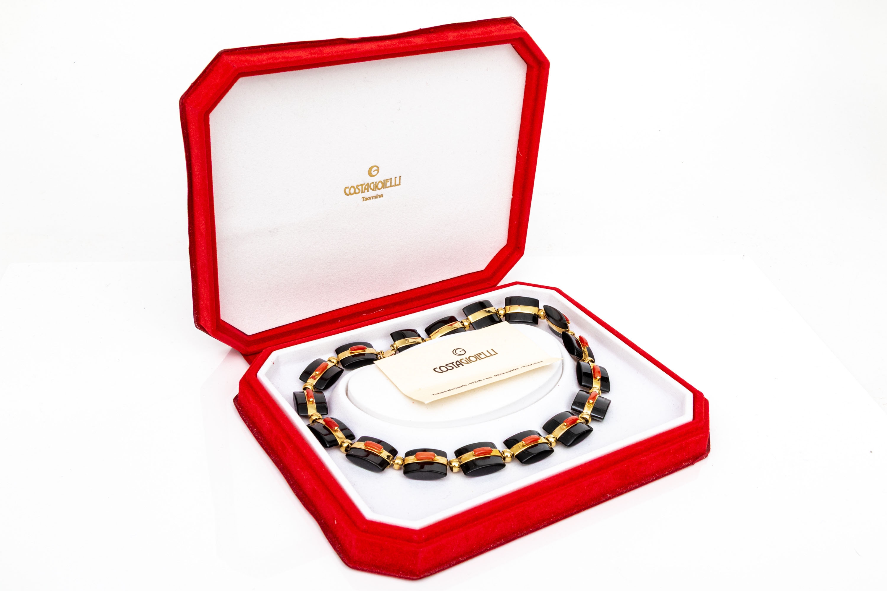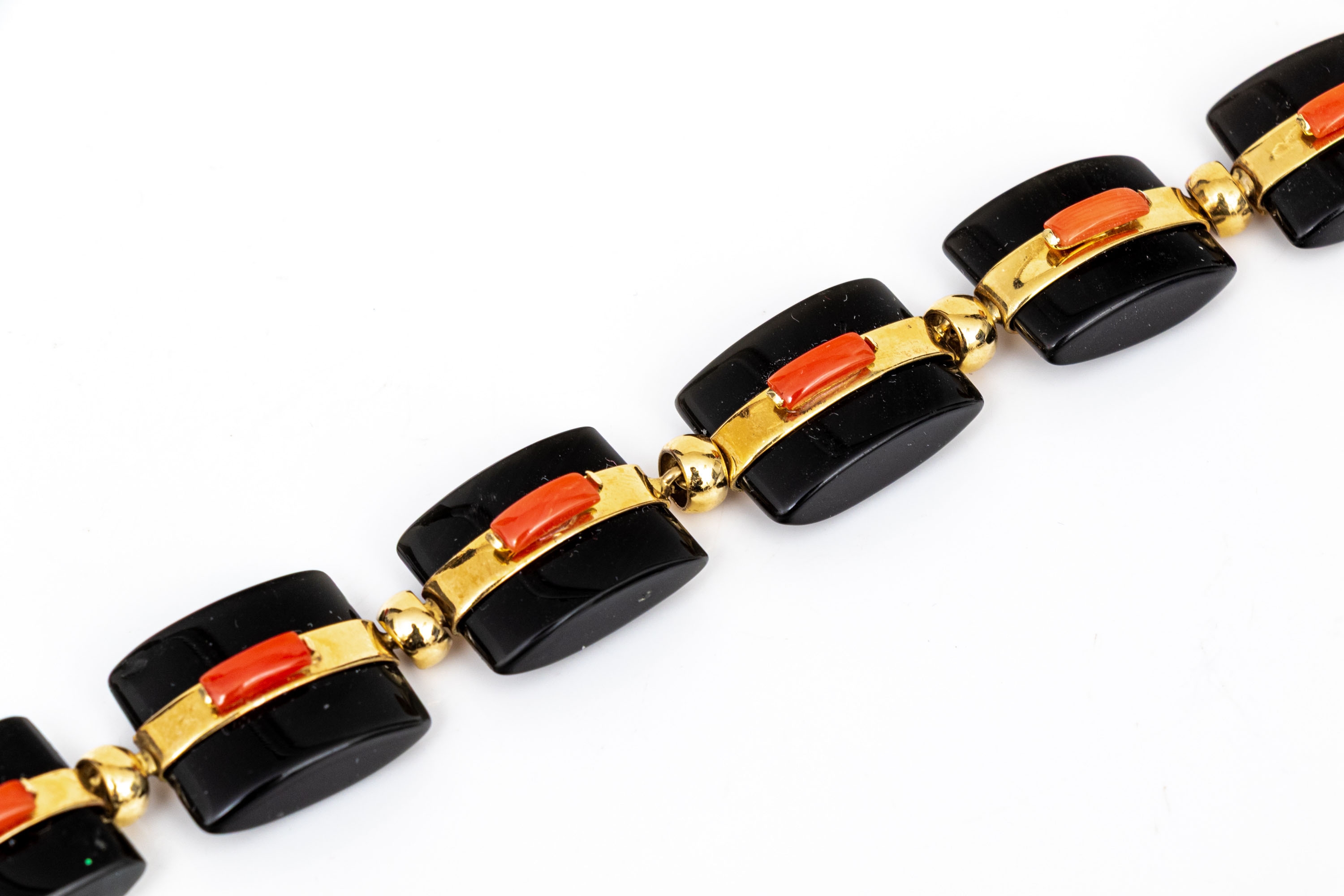 18k yellow gold beautiful chunky square black onyx pillow link and coral set necklace, finished with a 14k yellow gold lobster claw clasp