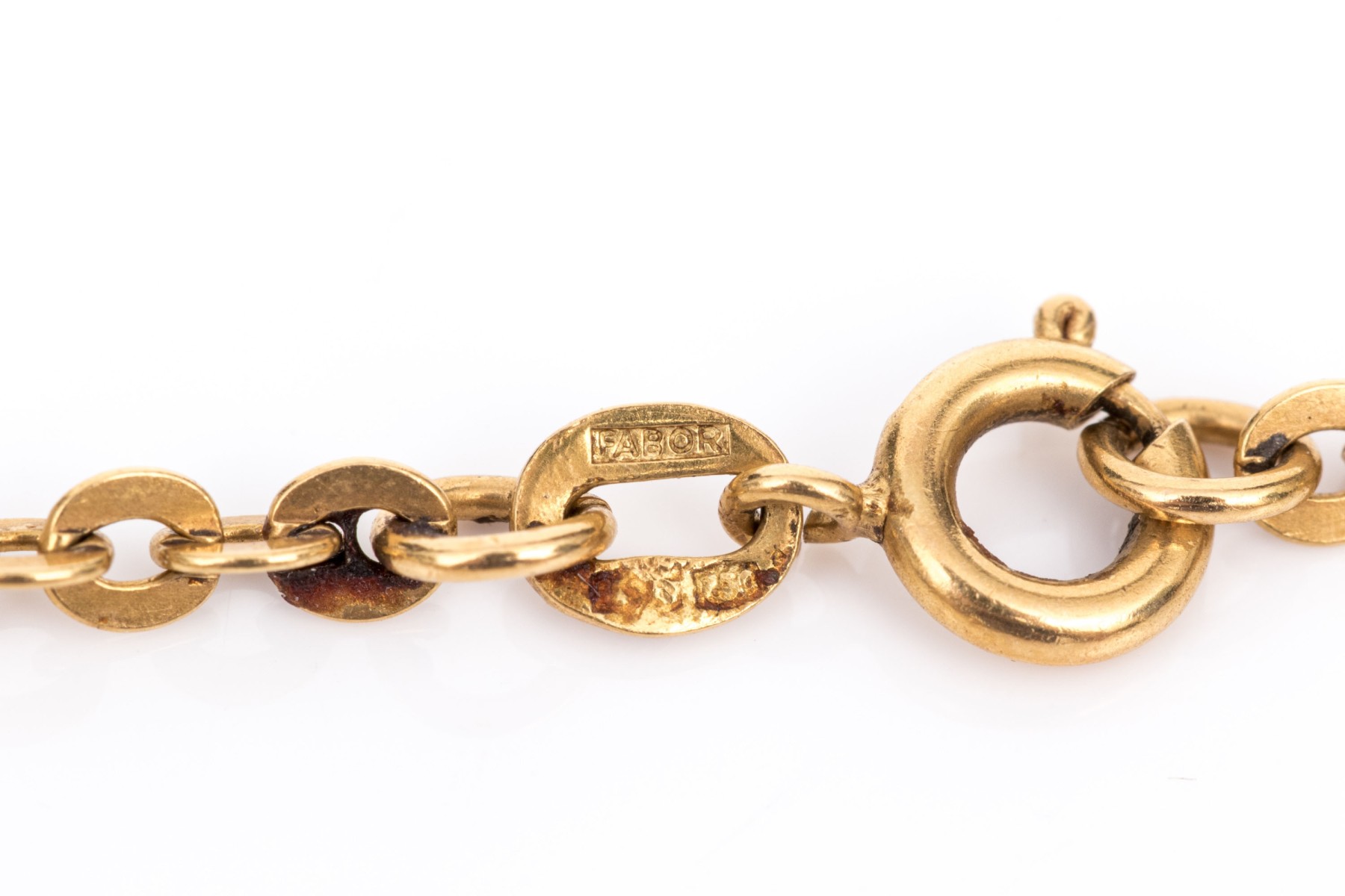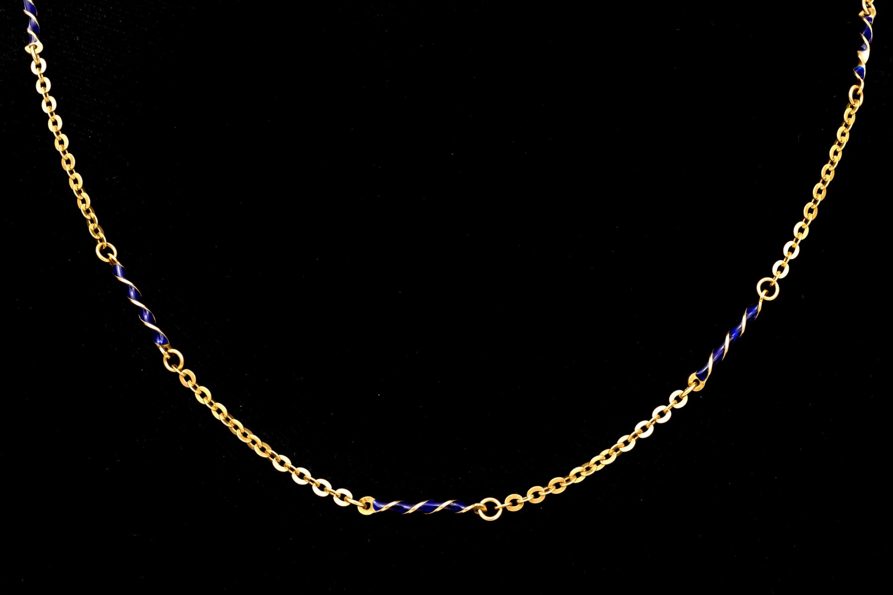 18k yellow gold beautiful opera length flat curb and blue enamel link necklace, finished with a spring ring style clasp
