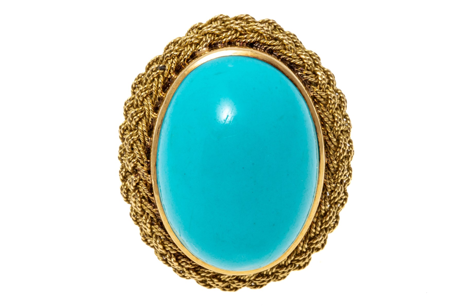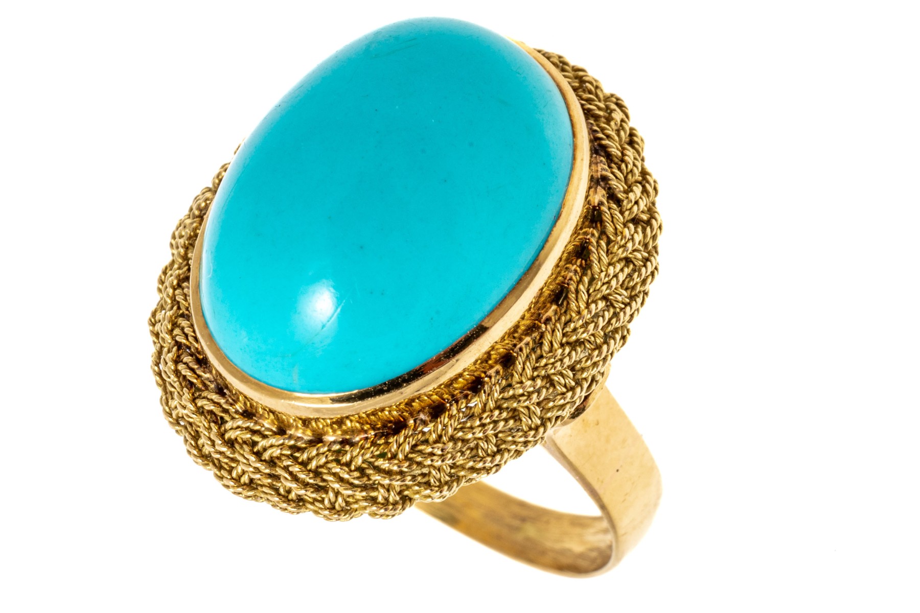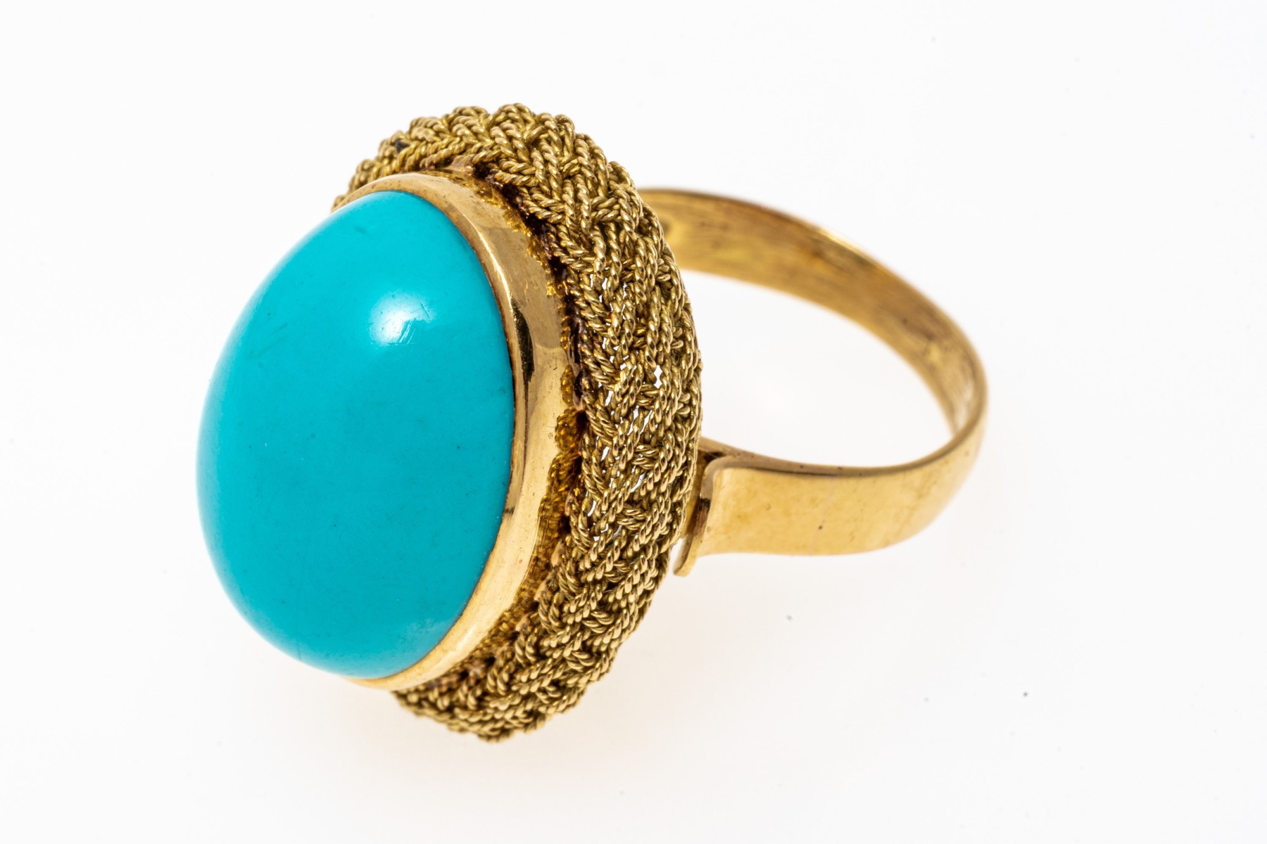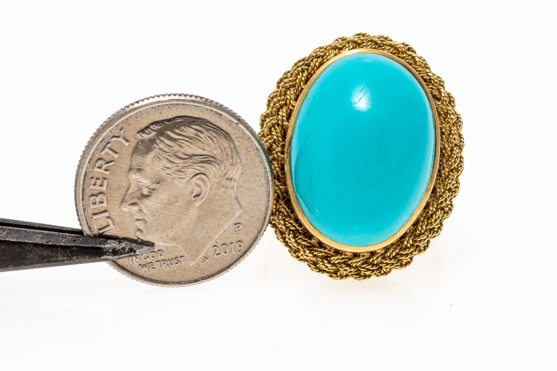 18k yellow gold beautiful vintage oval cabachon turquoise ring, braided edge, size 6