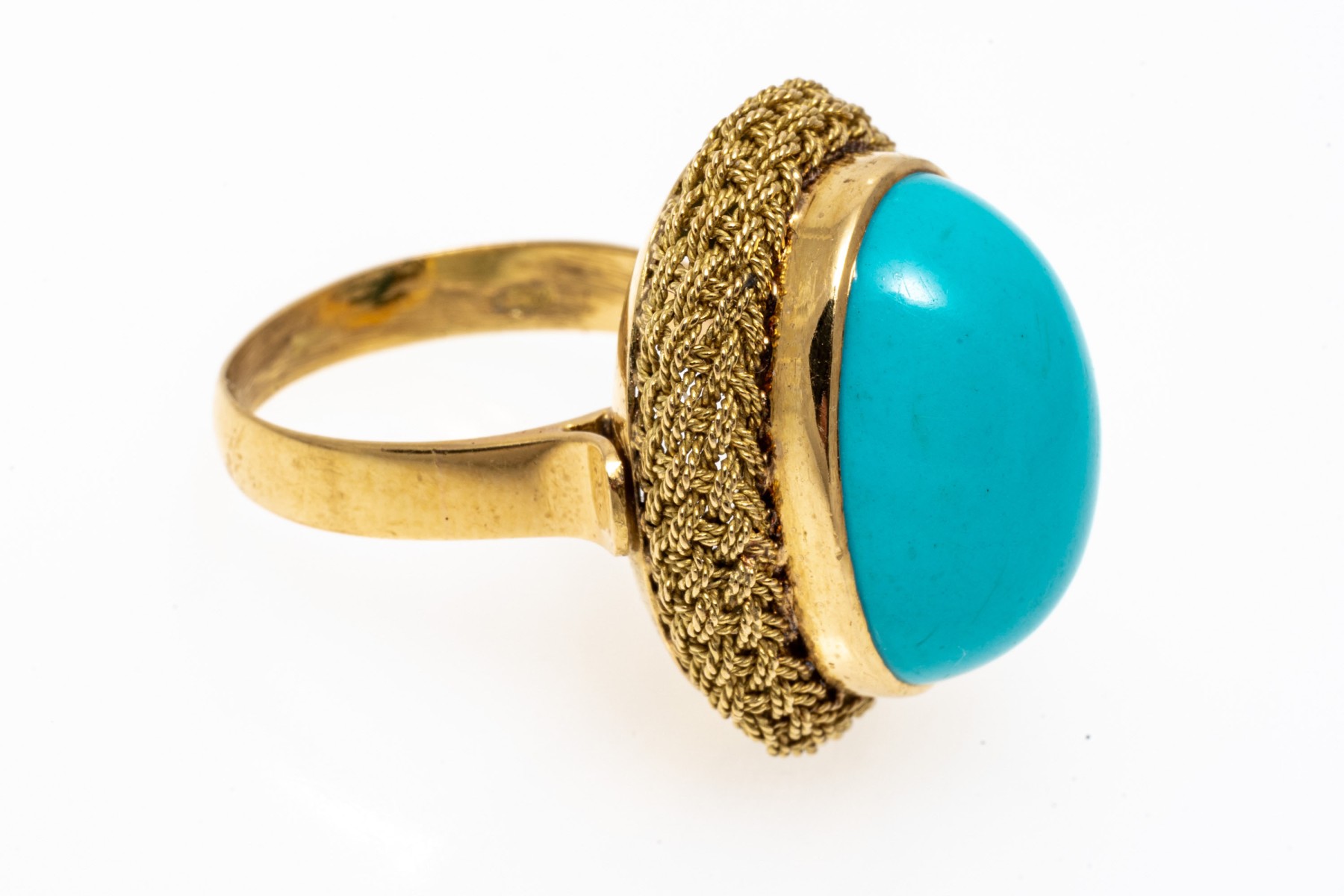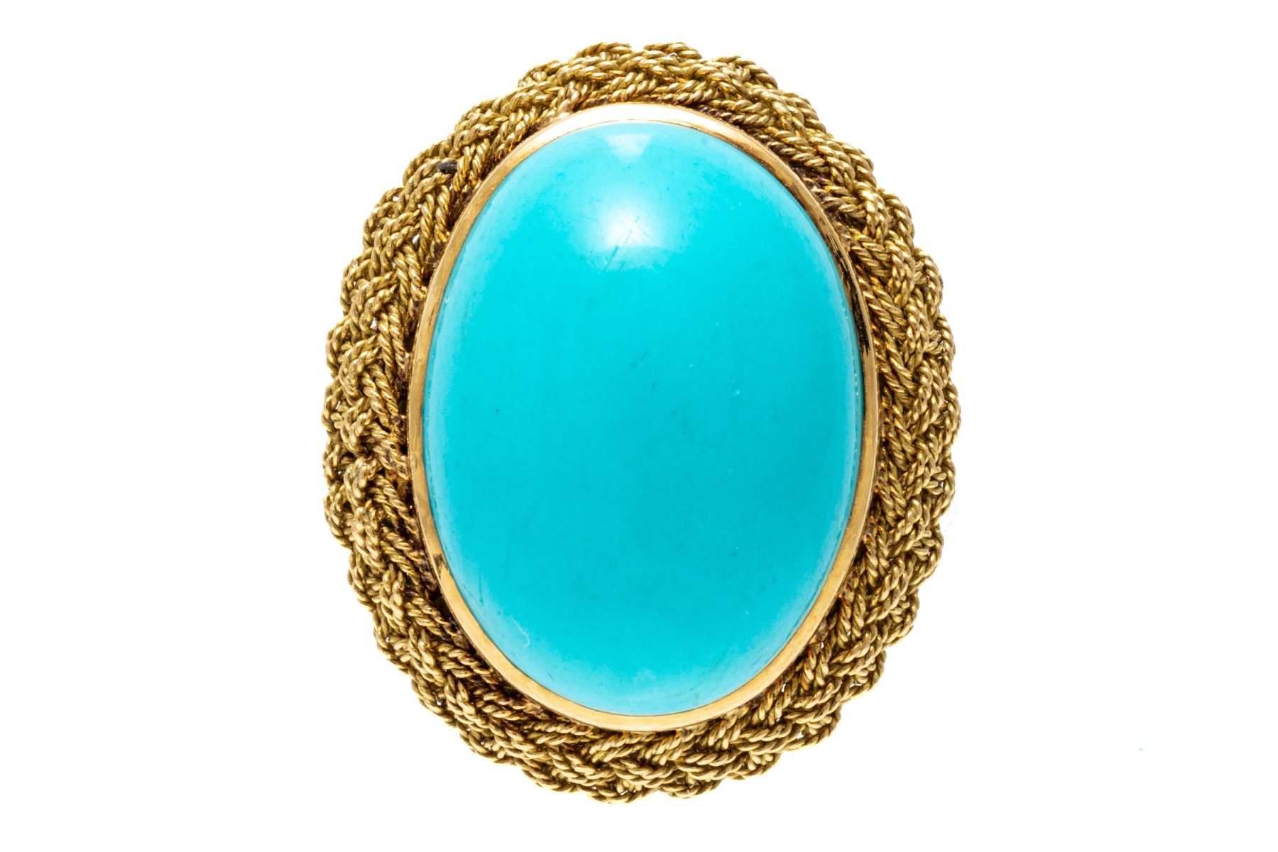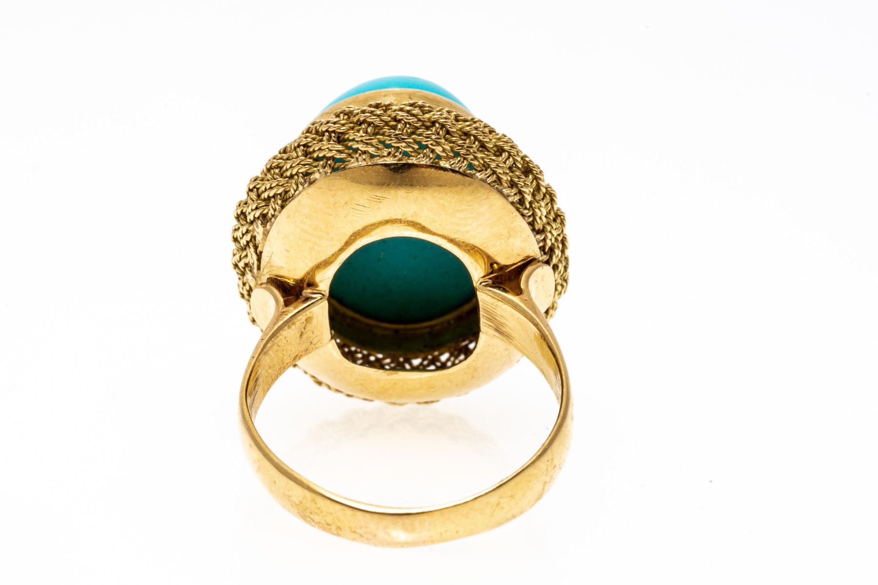 18k yellow gold beautiful vintage oval cabachon turquoise ring, braided edge, size 6