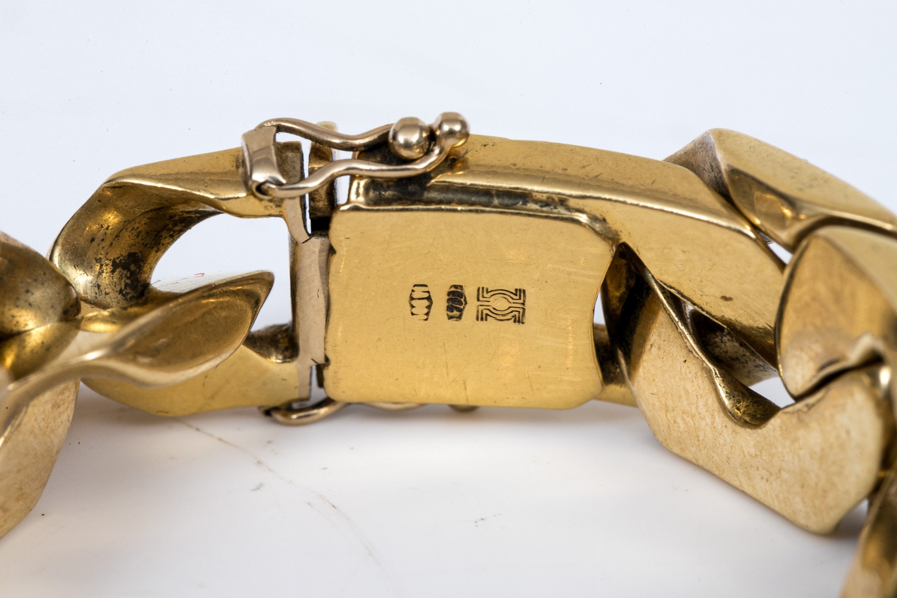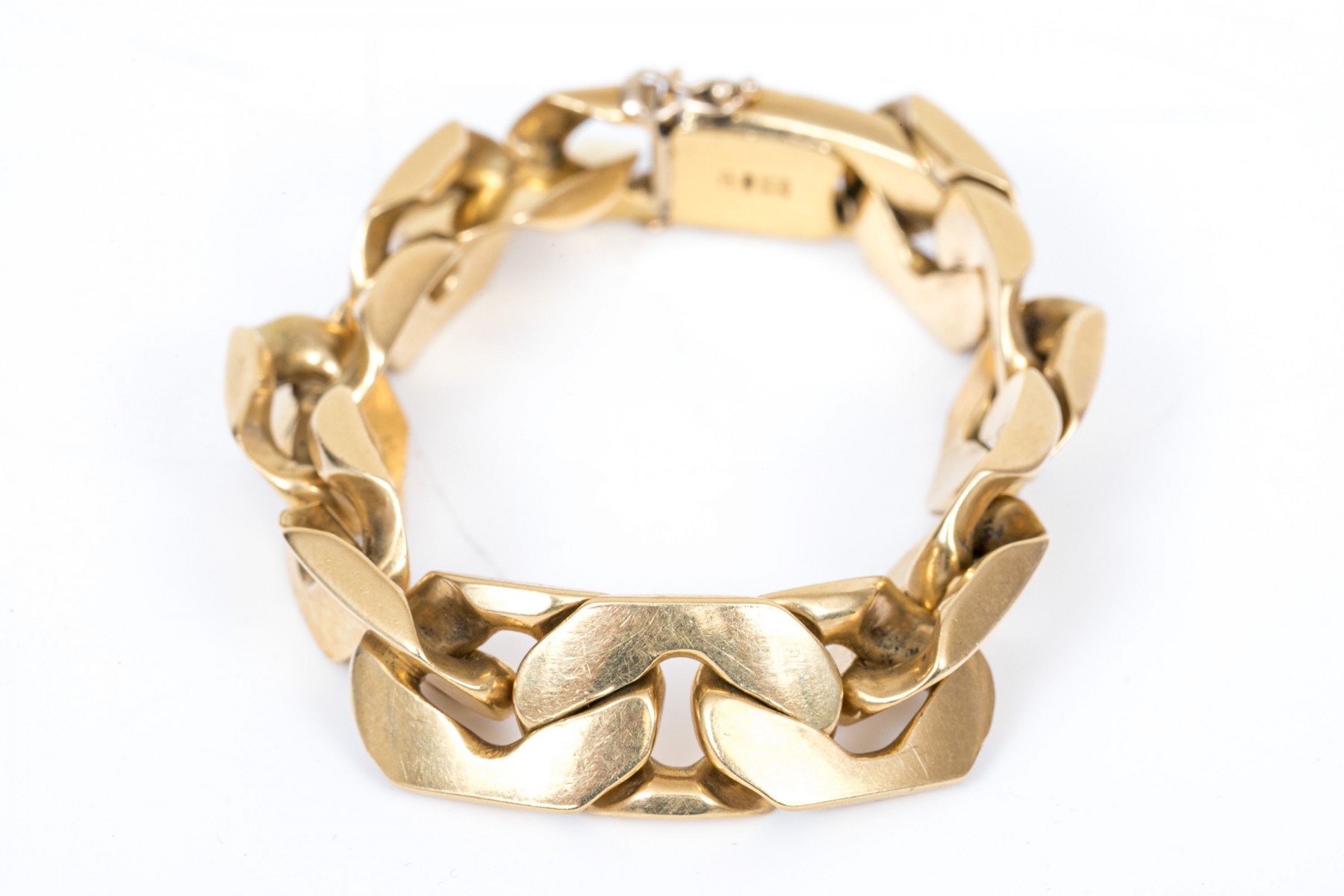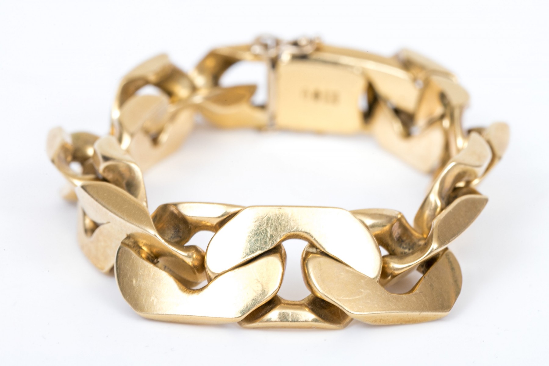 18k yellow gold chunky wide chain link bracelet, finished with a hidden box style clasp and two figure eight safeties
