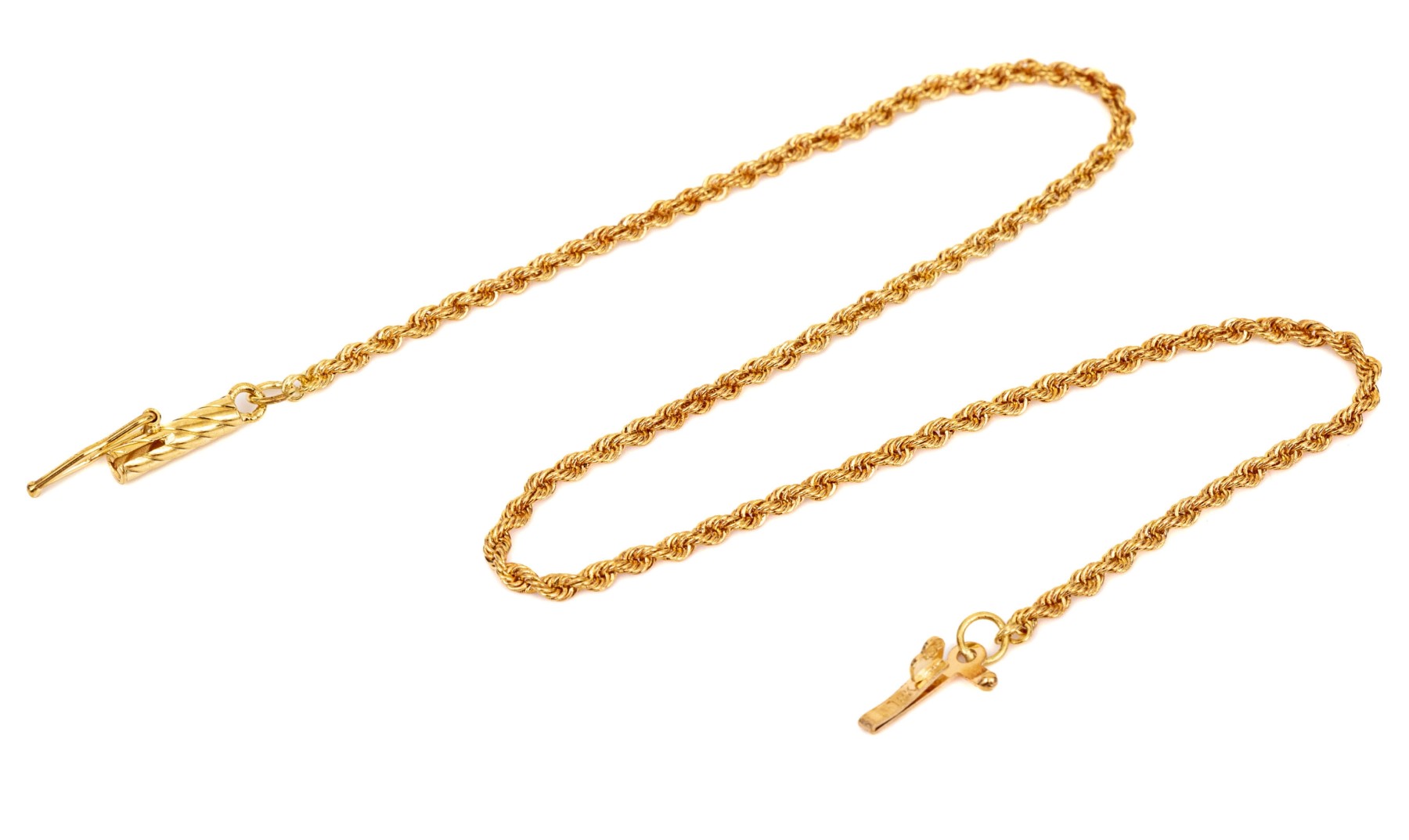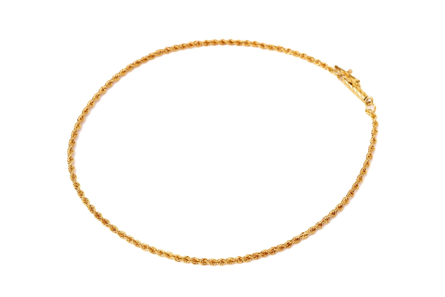 18k yellow gold classic rope style chain anklet, finished with a barrel style clasp