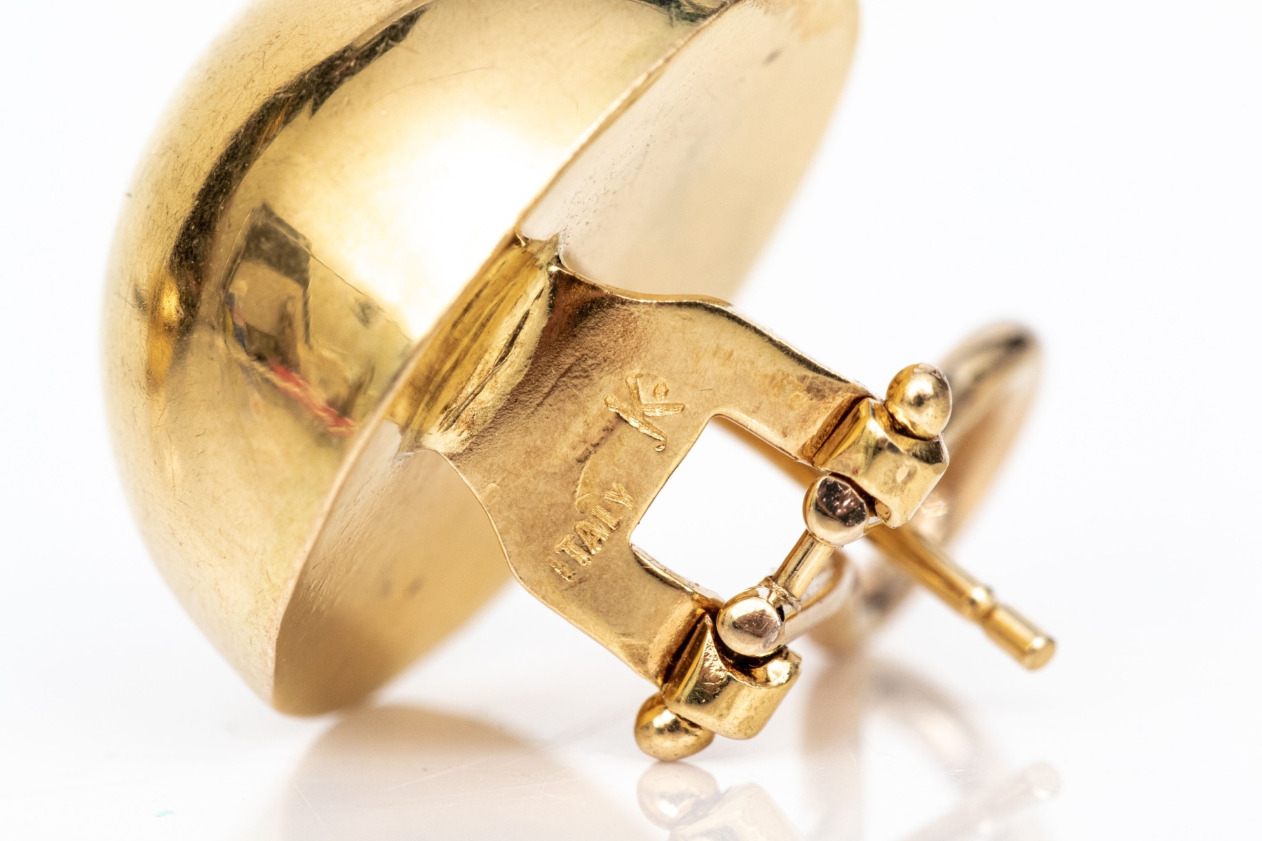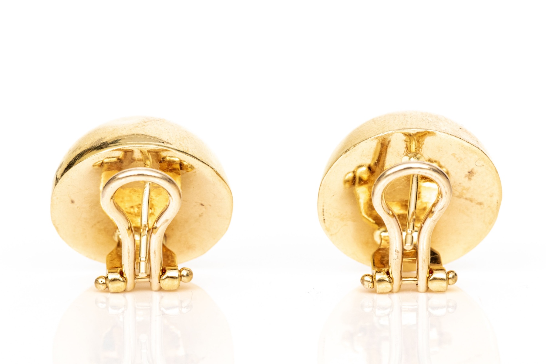 These chic earrings feature a 17mm rounded dome of yellow gold, finished with posts and hinged omega style backs
