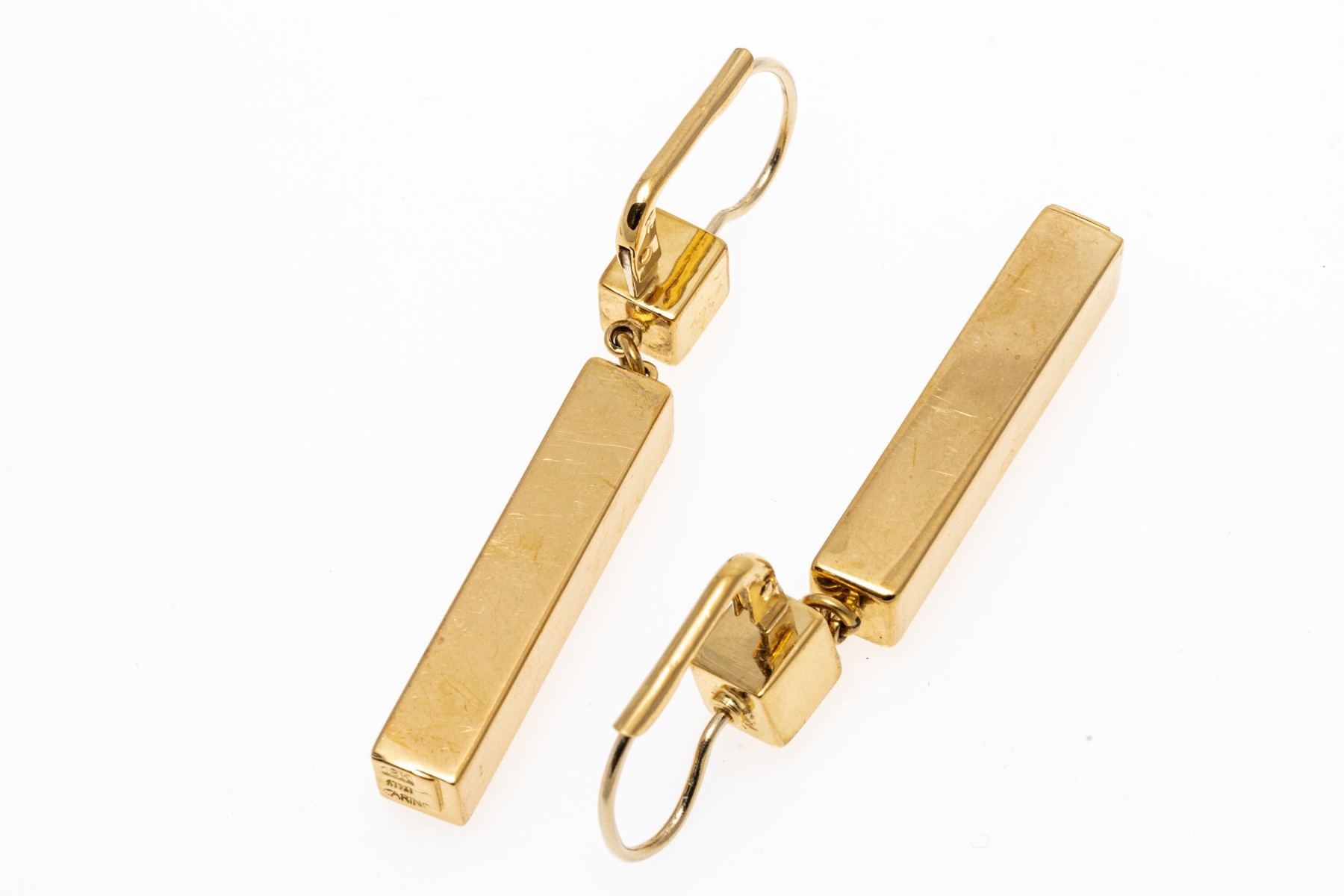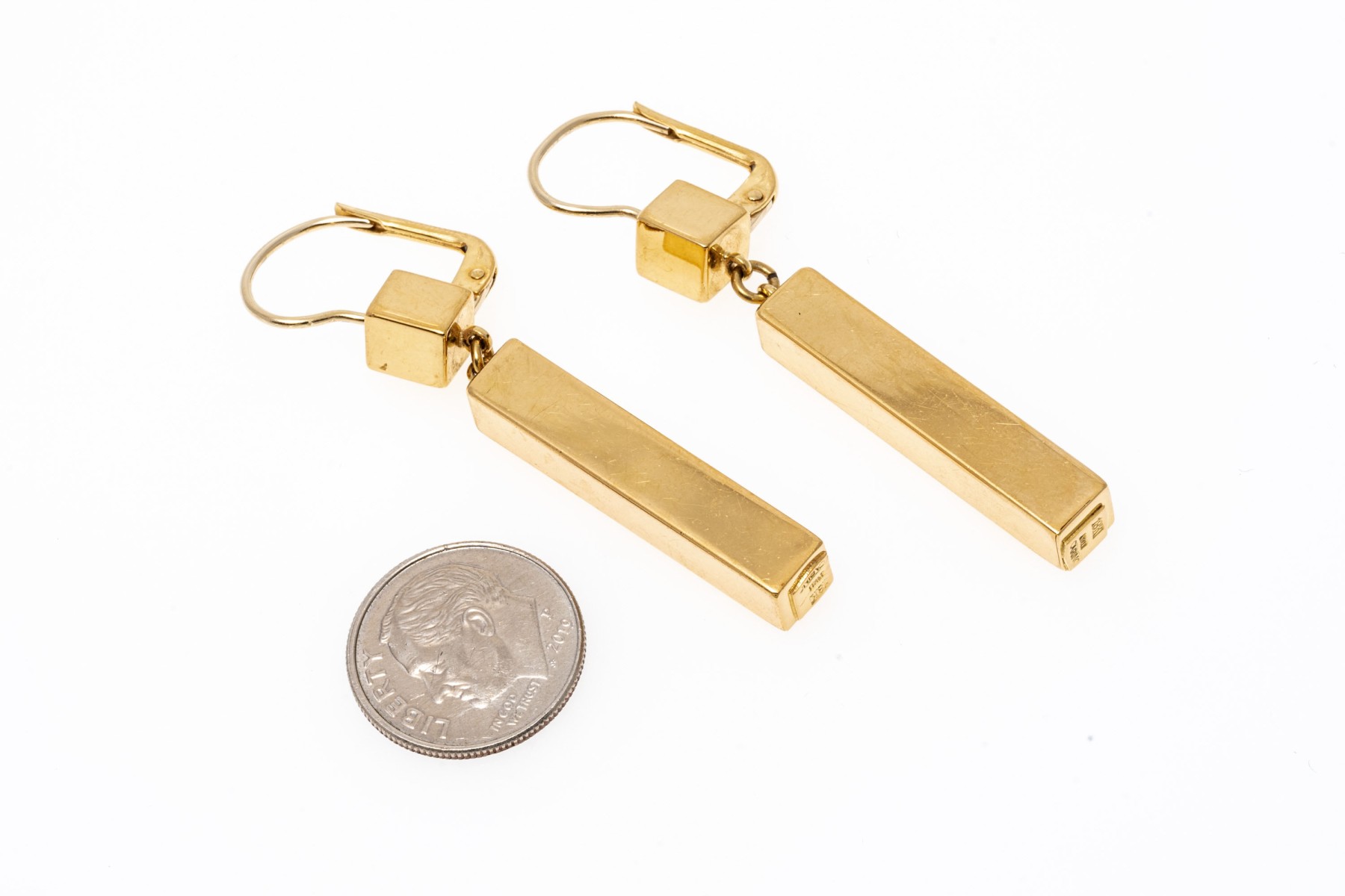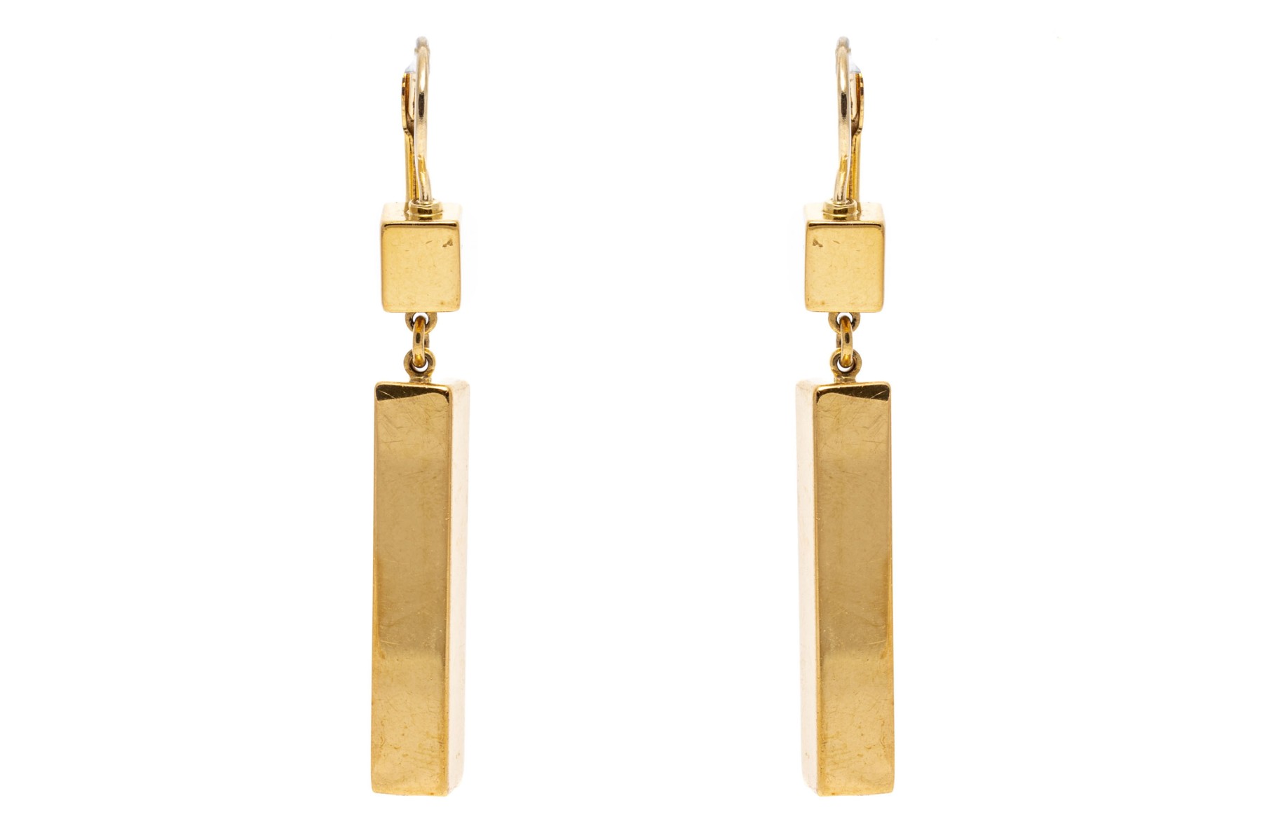18k yellow gold earrings. These distinctive pendant earrings have a block motif top, from which suspends an elongated block motif pendant. The earrings are finished with wires, with lever style backs