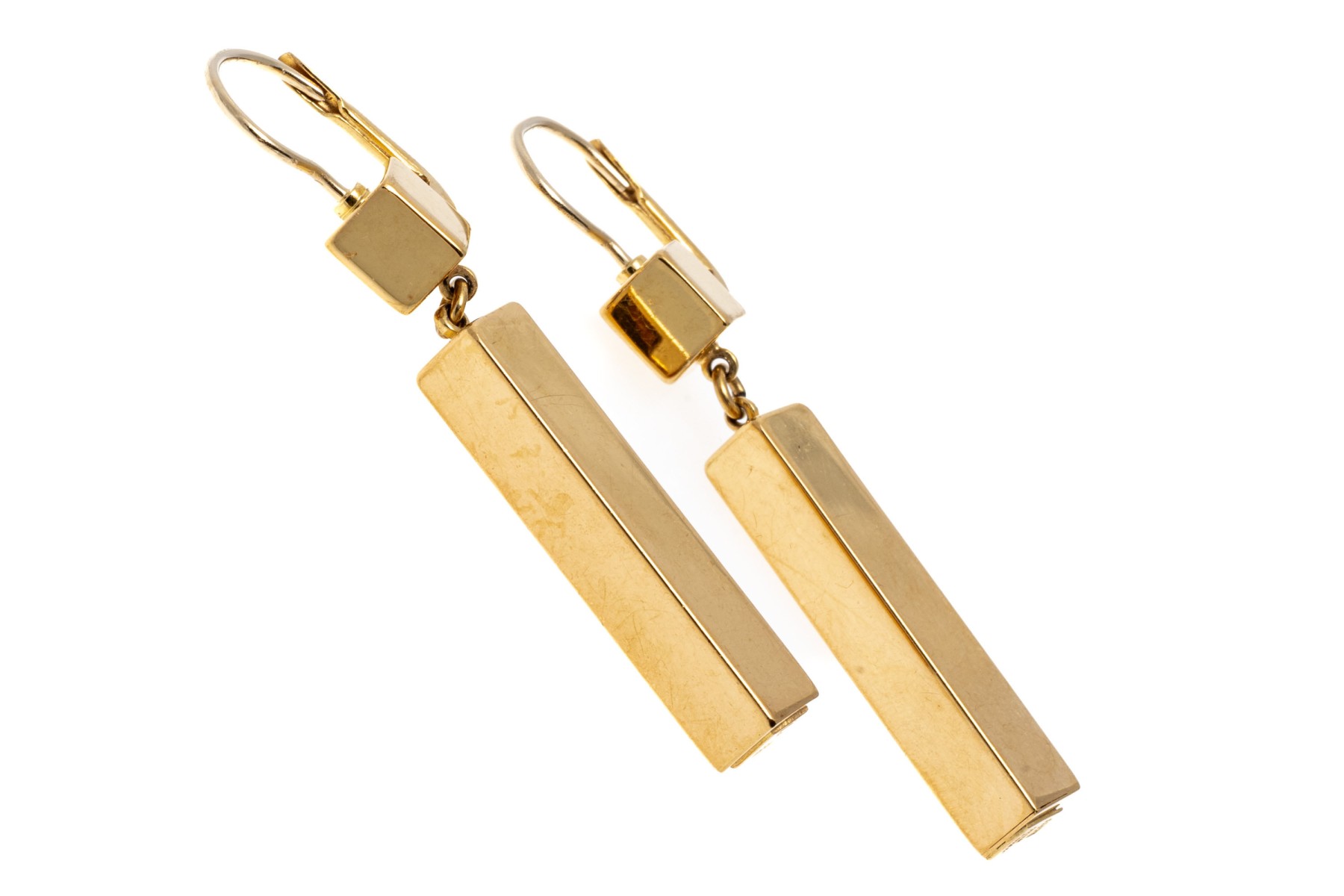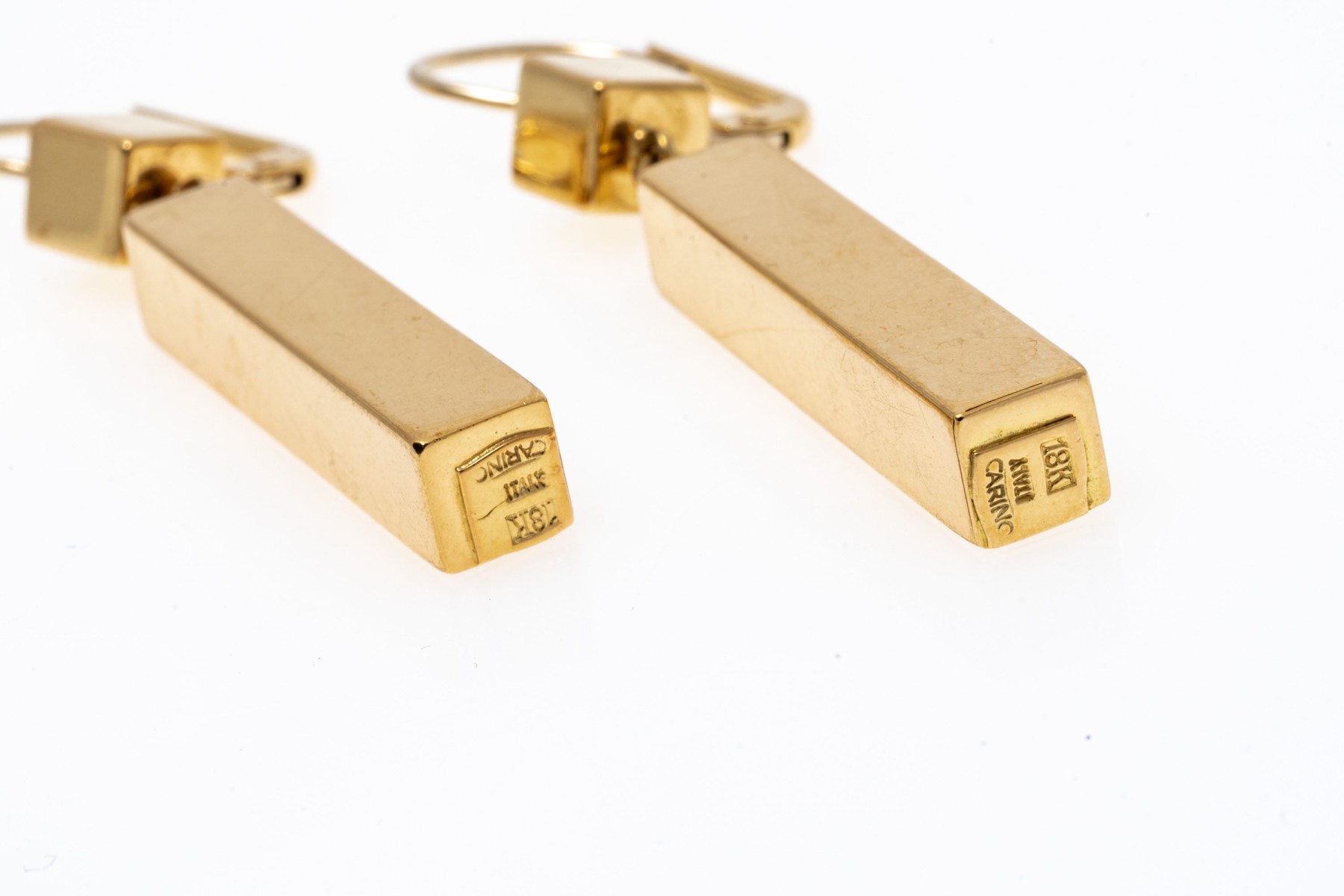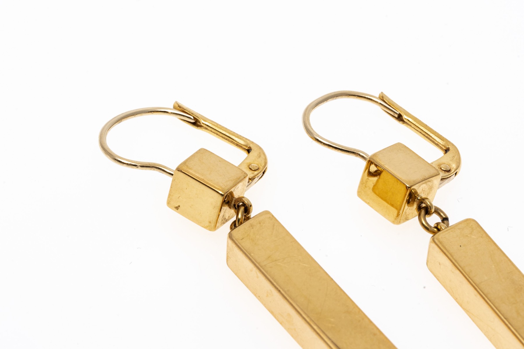 18k yellow gold earrings. These distinctive pendant earrings have a block motif top, from which suspends an elongated block motif pendant. The earrings are finished with wires, with lever style backs