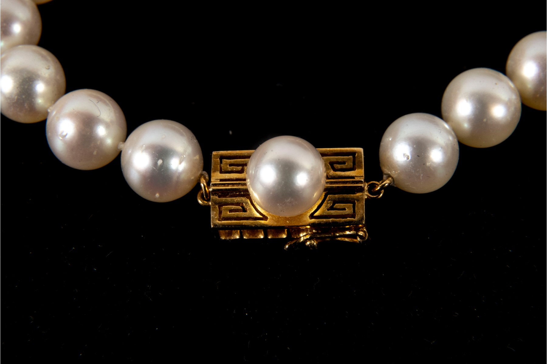 An elegant necklace of round, white cultured pearls with beautiful iridescent undertones of pink and yellow, displaying on a white knotted cord leading to a yellow gold rectangular clasp with pierced fret designs, adorned with an additional pearl.