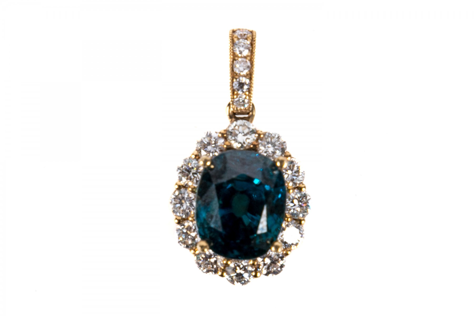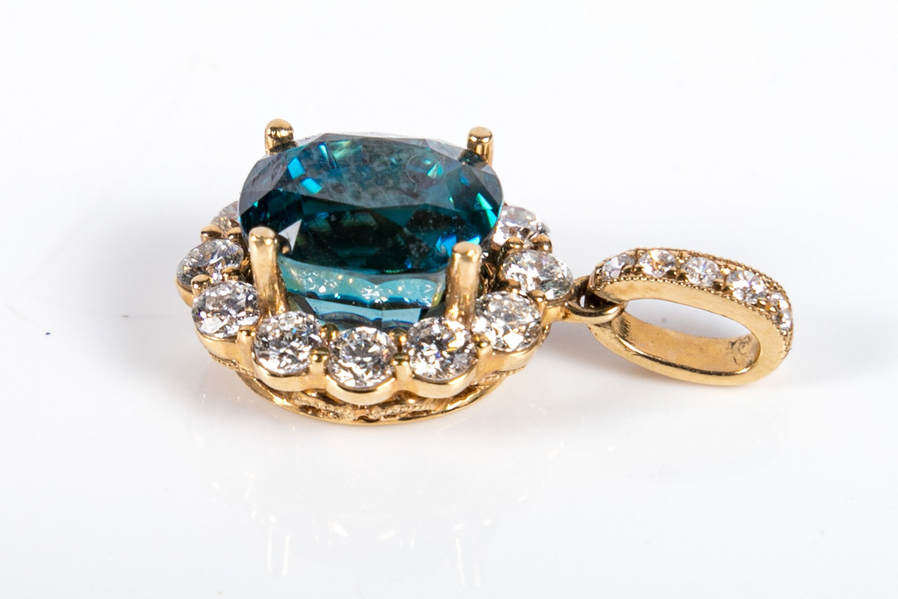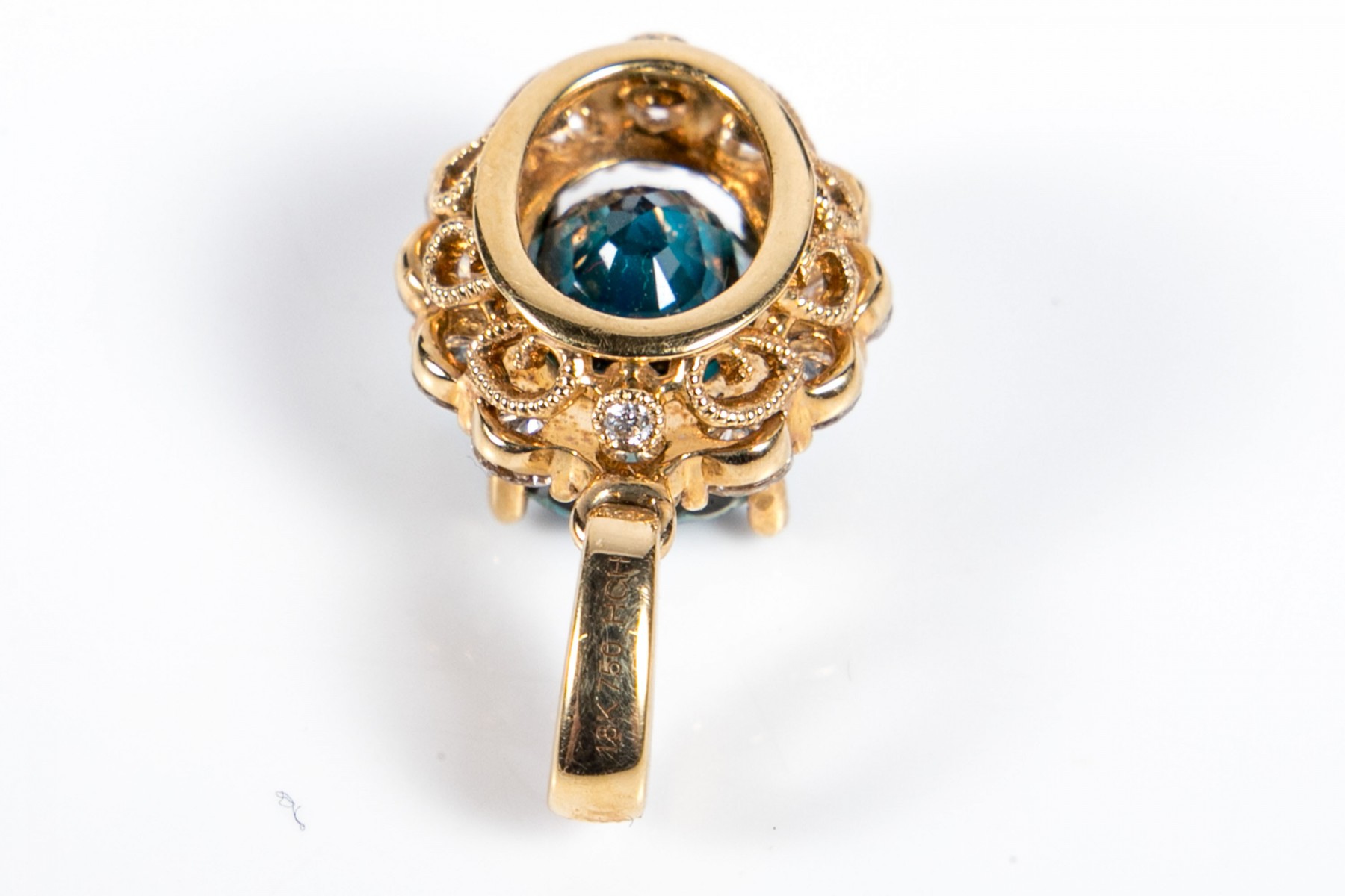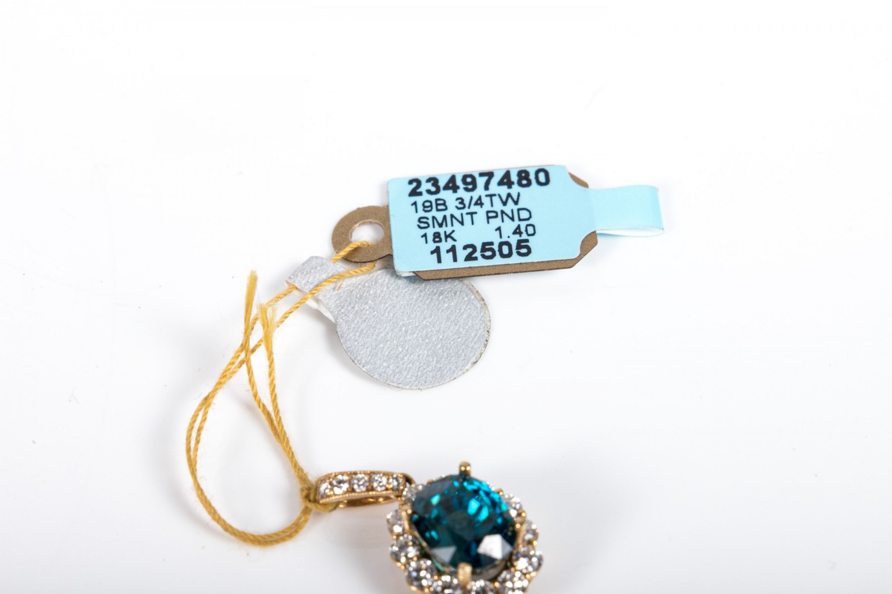 18K yellow gold, diamond and blue topaz pendant. Central cushion cut blue topaz encased in a ring of diamonds set into a yellow gold mount. Marked verso. Accompanied with retailer's tag for $2,500 stating carat weight at 3/4 (not confirmed).