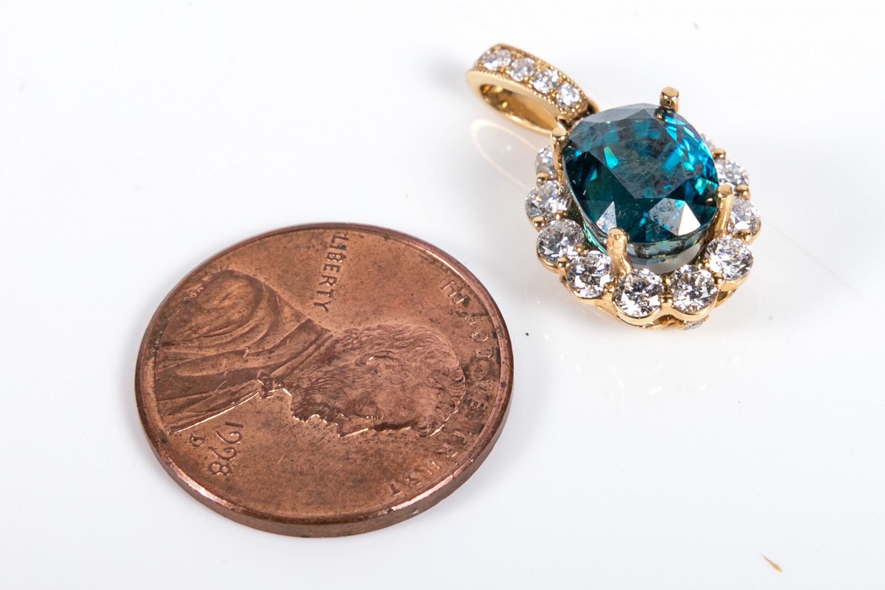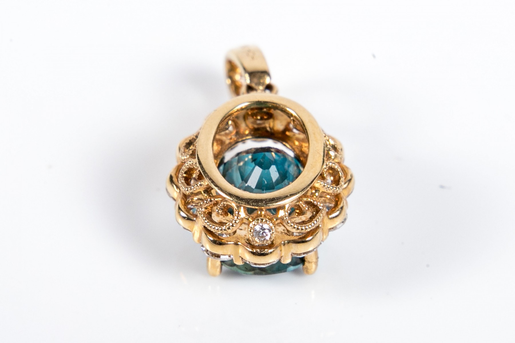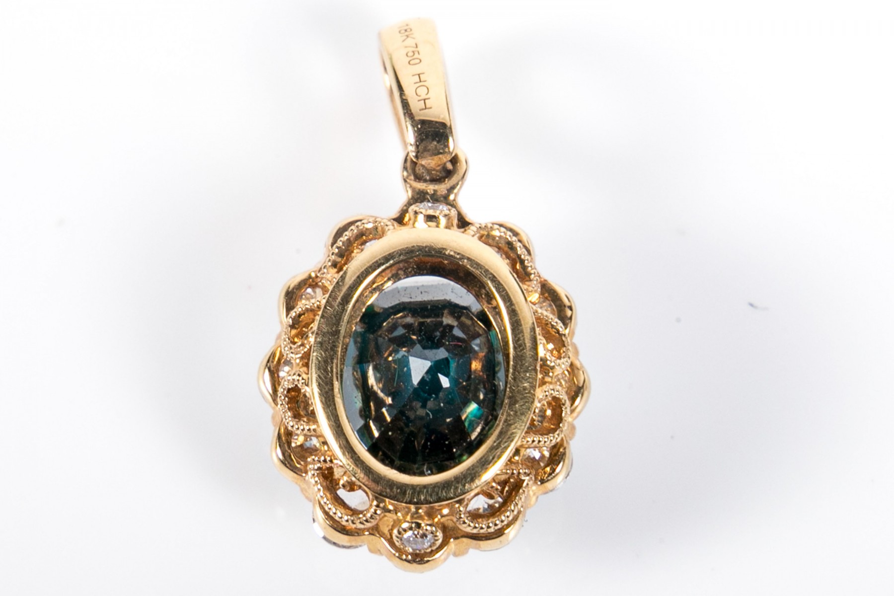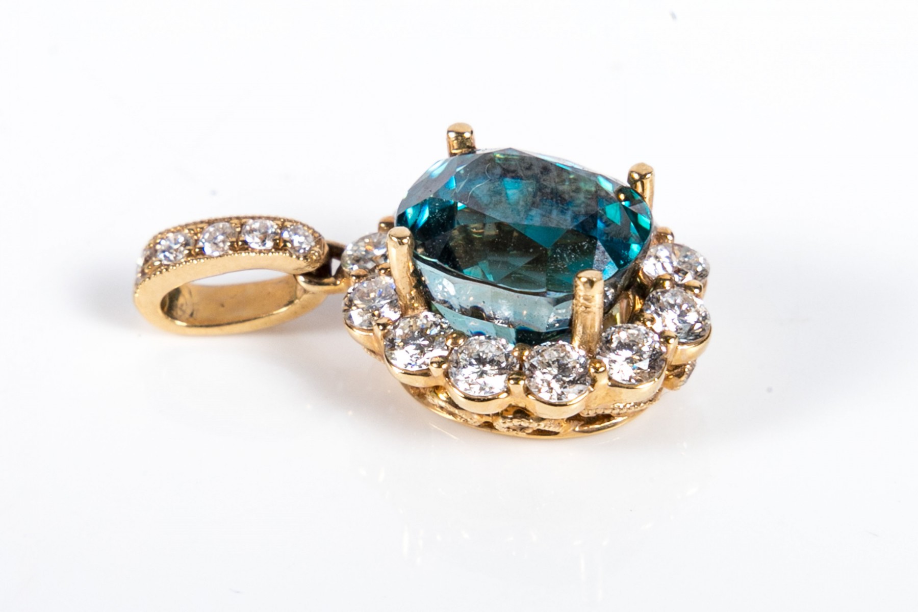 18K yellow gold, diamond and blue topaz pendant. Central cushion cut blue topaz encased in a ring of diamonds set into a yellow gold mount. Marked verso. Accompanied with retailer's tag for $2,500 stating carat weight at 3/4 (not confirmed).