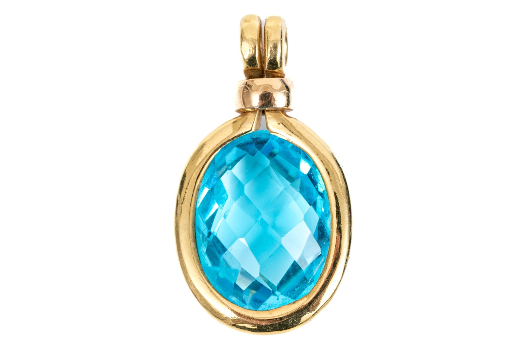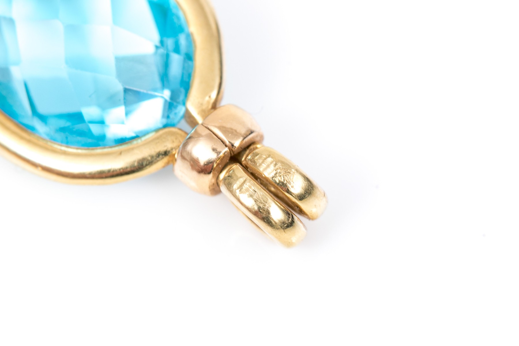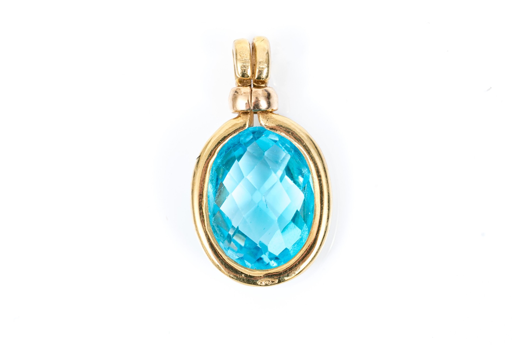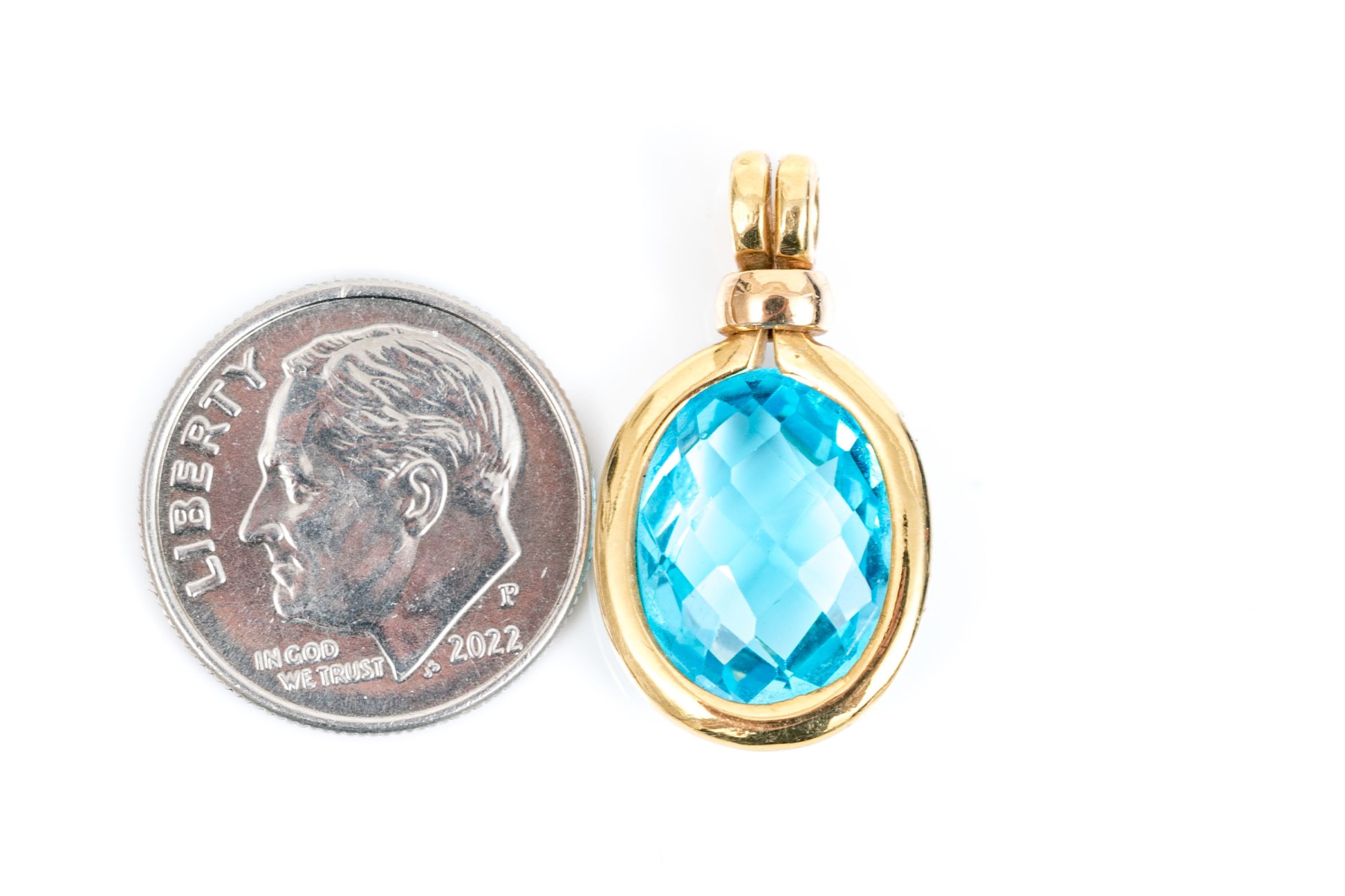 18k yellow gold fabulous double sided oval checkerboard cushion, medium to light blue color blue topaz pendant, approximately 5.60 TCW, bezel set, finished by a ribbed top bale
