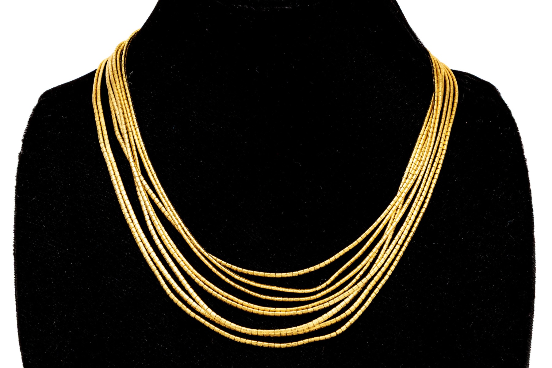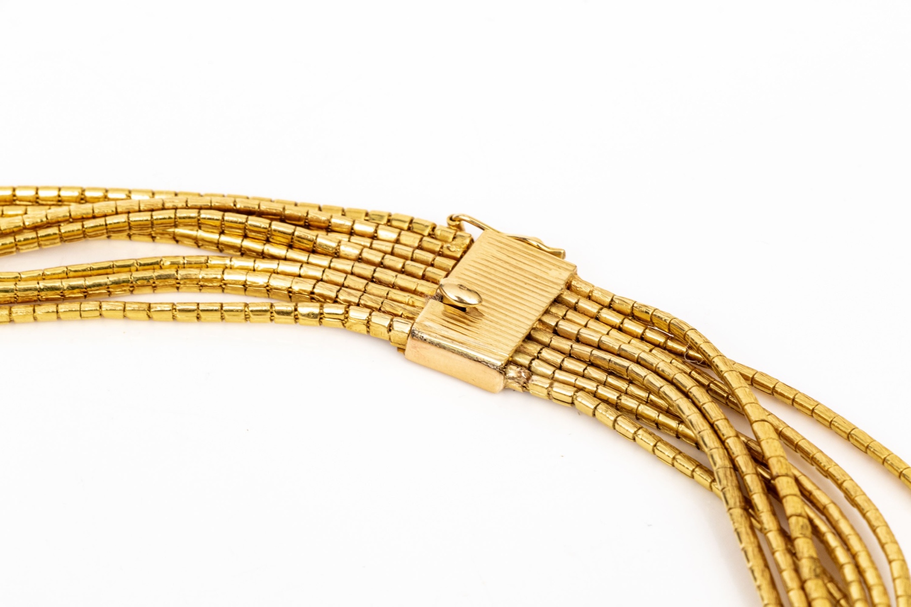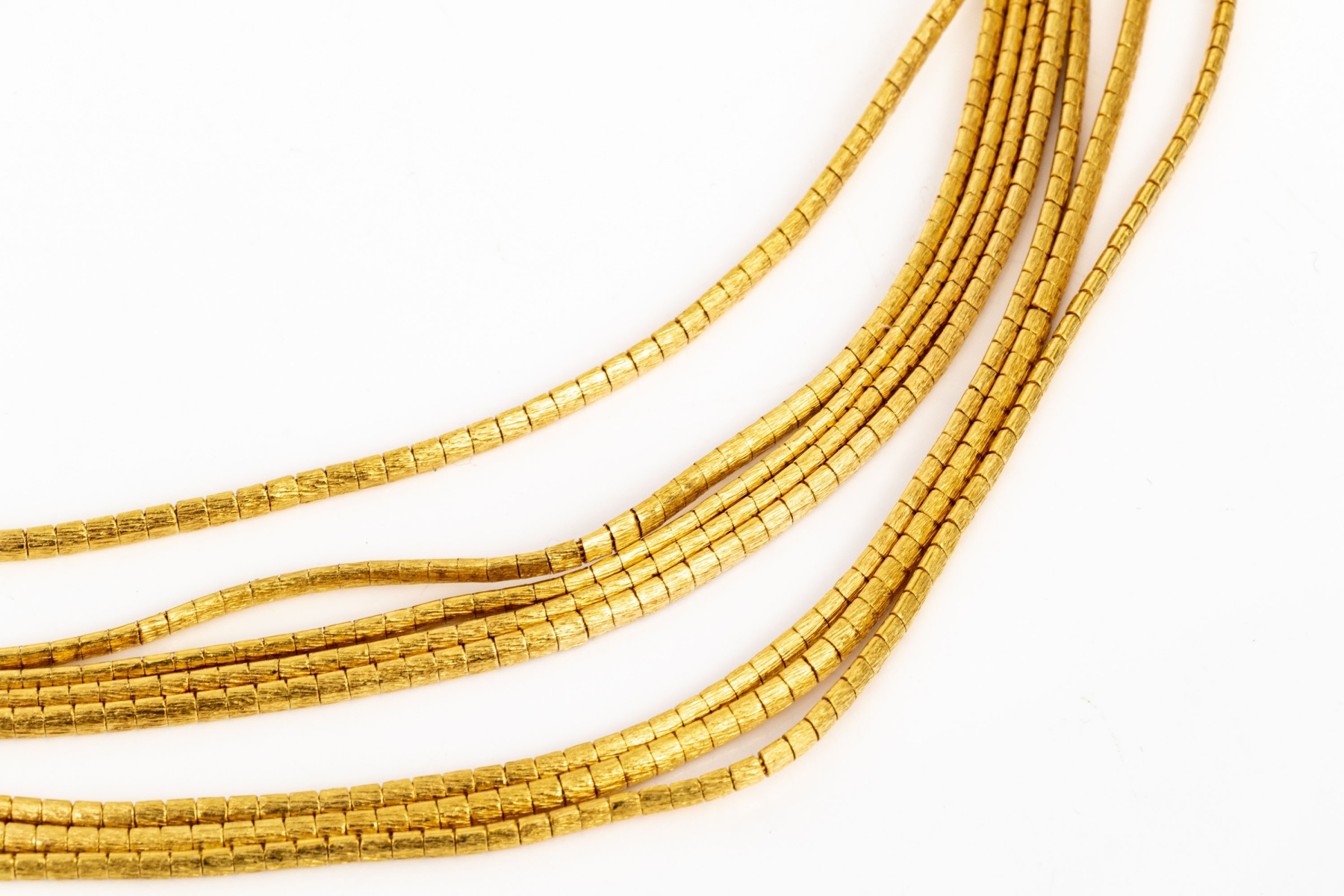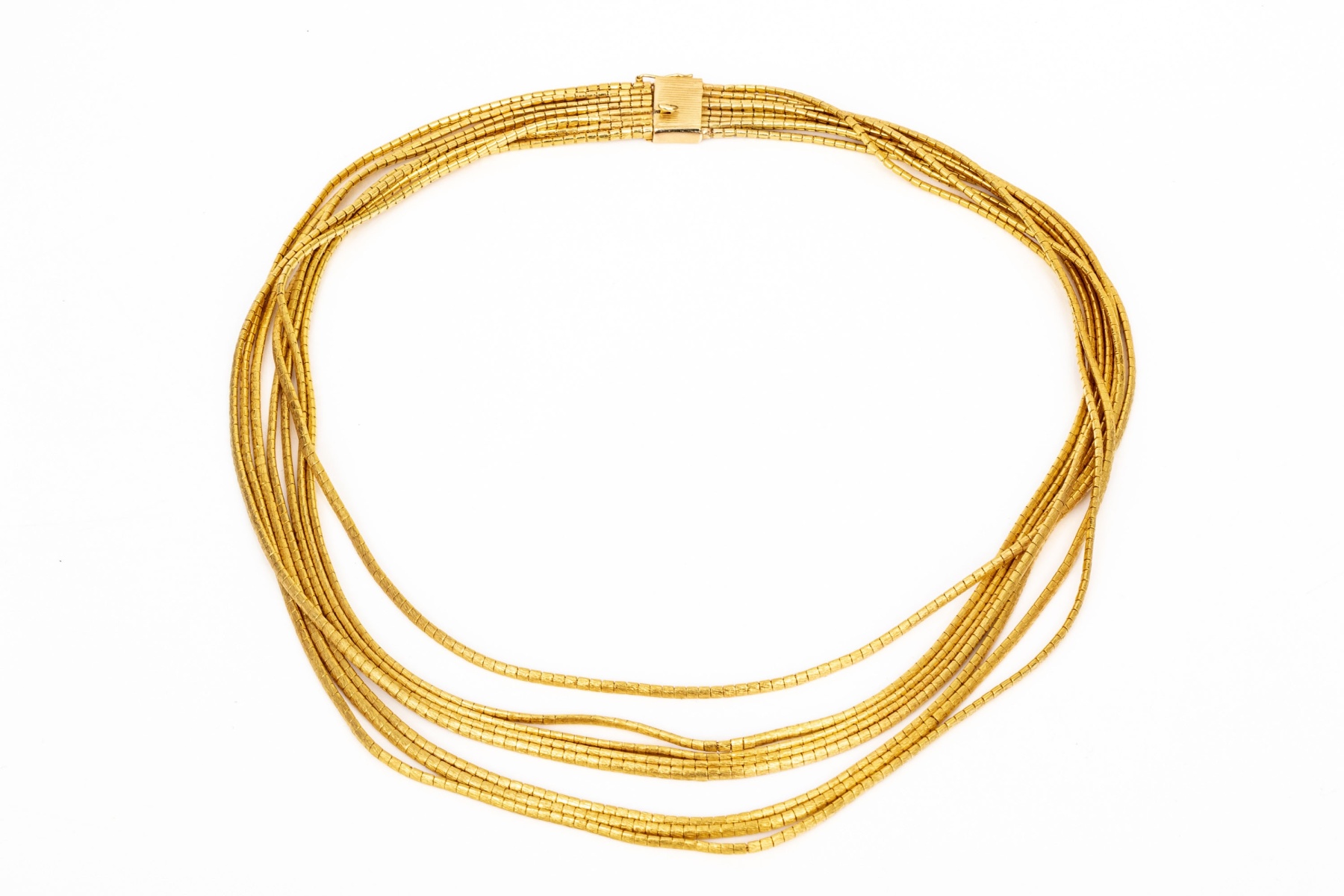 18k yellow gold fabulous vintage flexible graduated multi strand omega style necklace. This striking necklace features eight strands of omega style links, with a brushed finish, and completed with a rectangular ribbed clasp and a figure eight safety