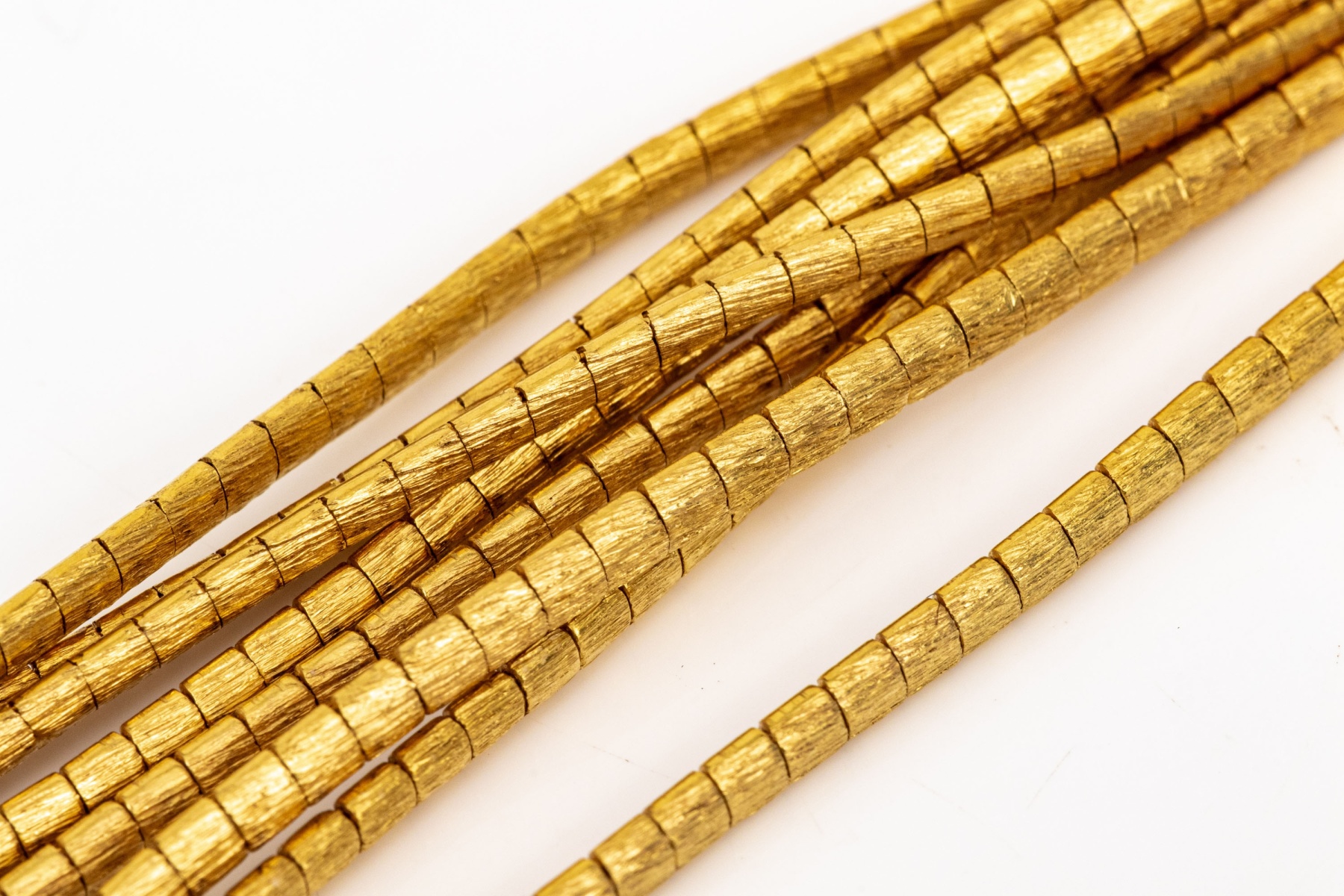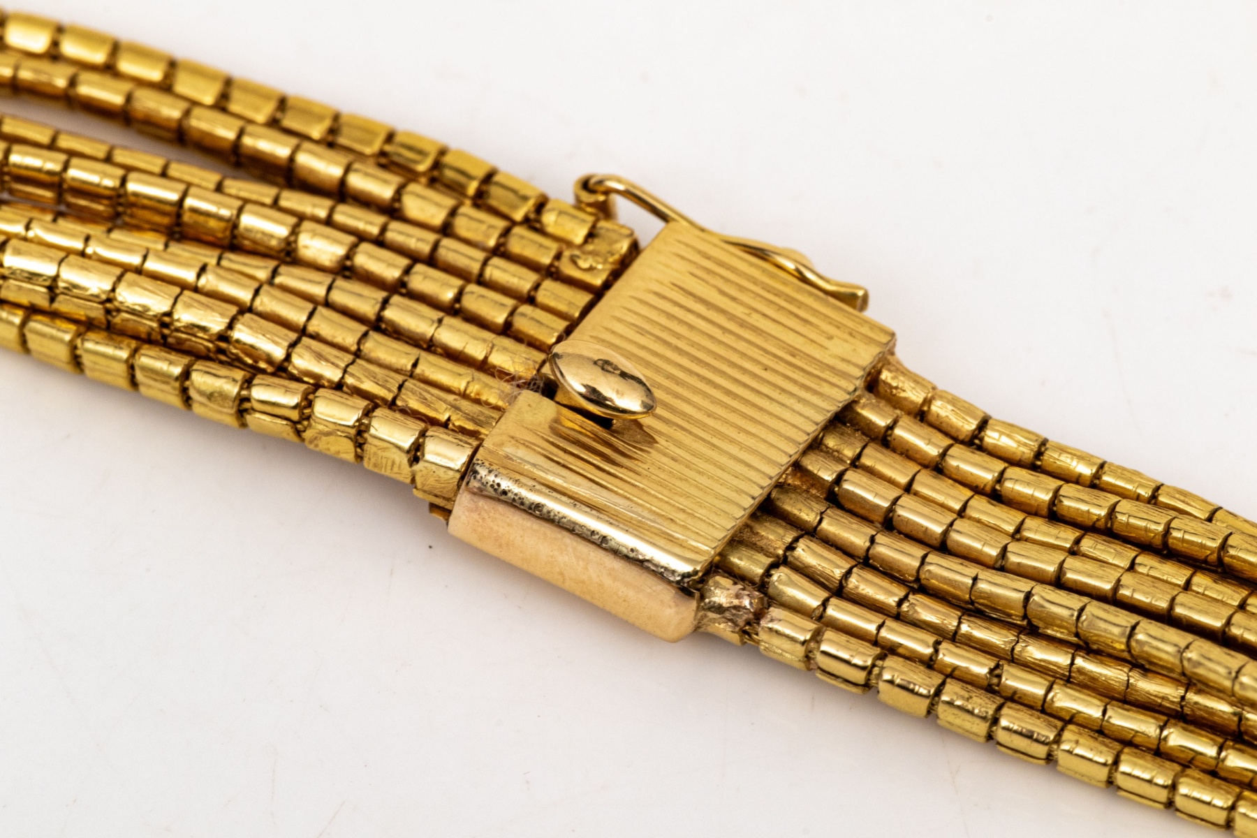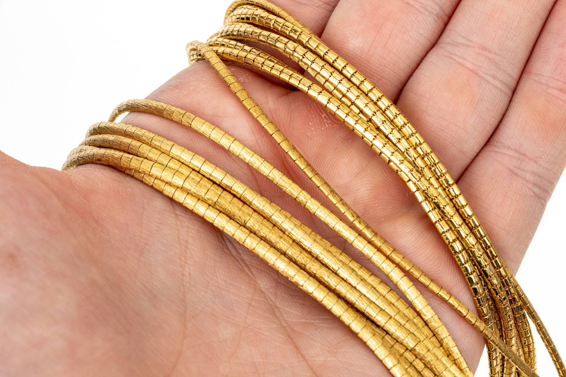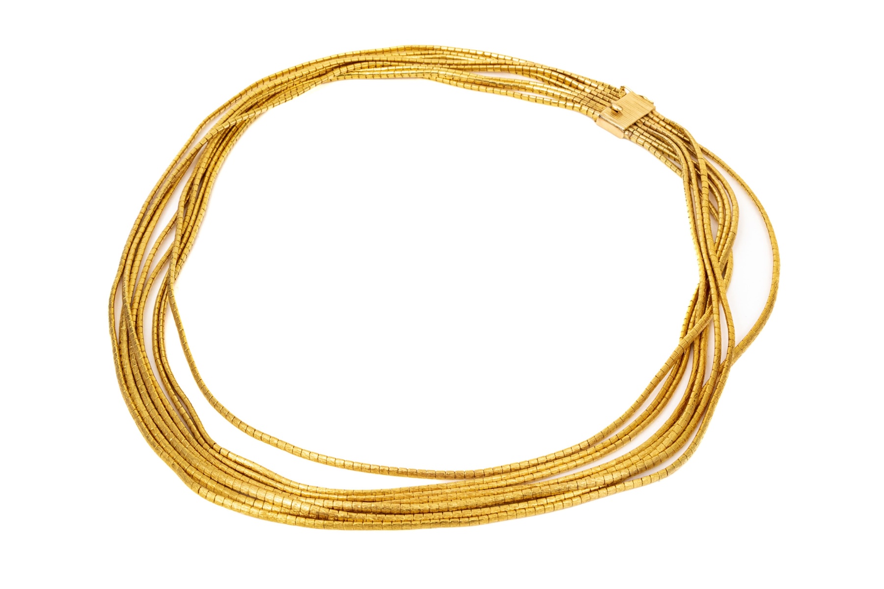 18k yellow gold fabulous vintage flexible graduated multi strand omega style necklace. This striking necklace features eight strands of omega style links, with a brushed finish, and completed with a rectangular ribbed clasp and a figure eight safety