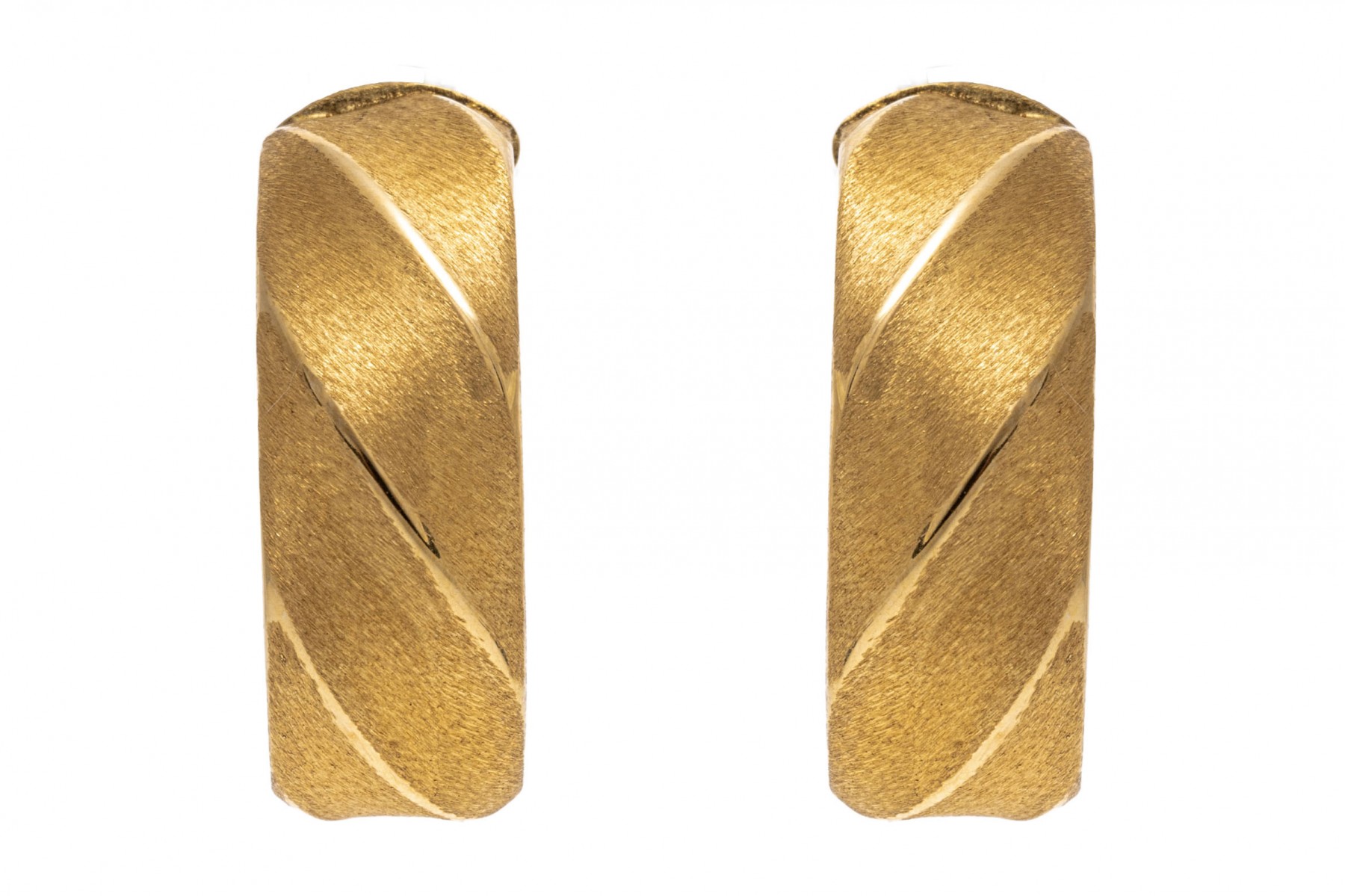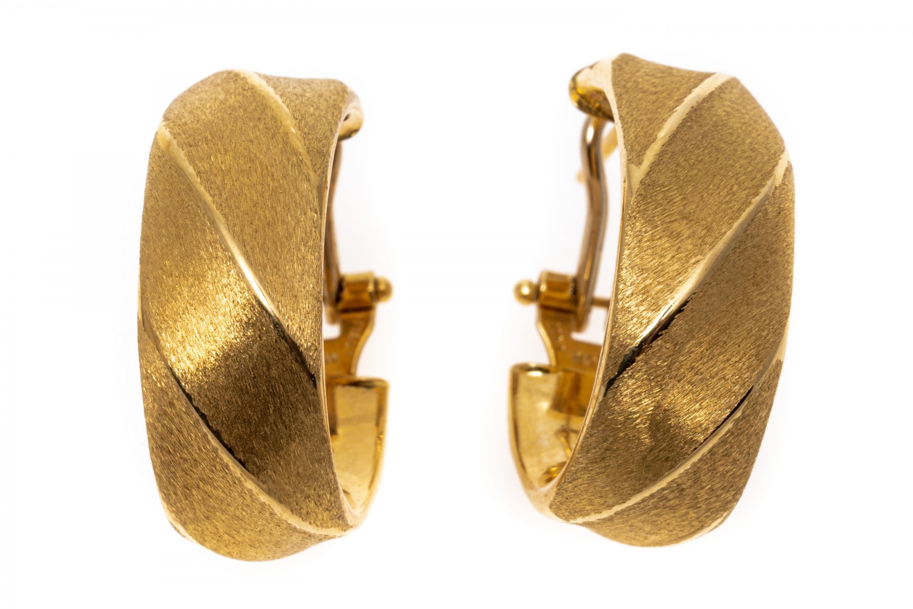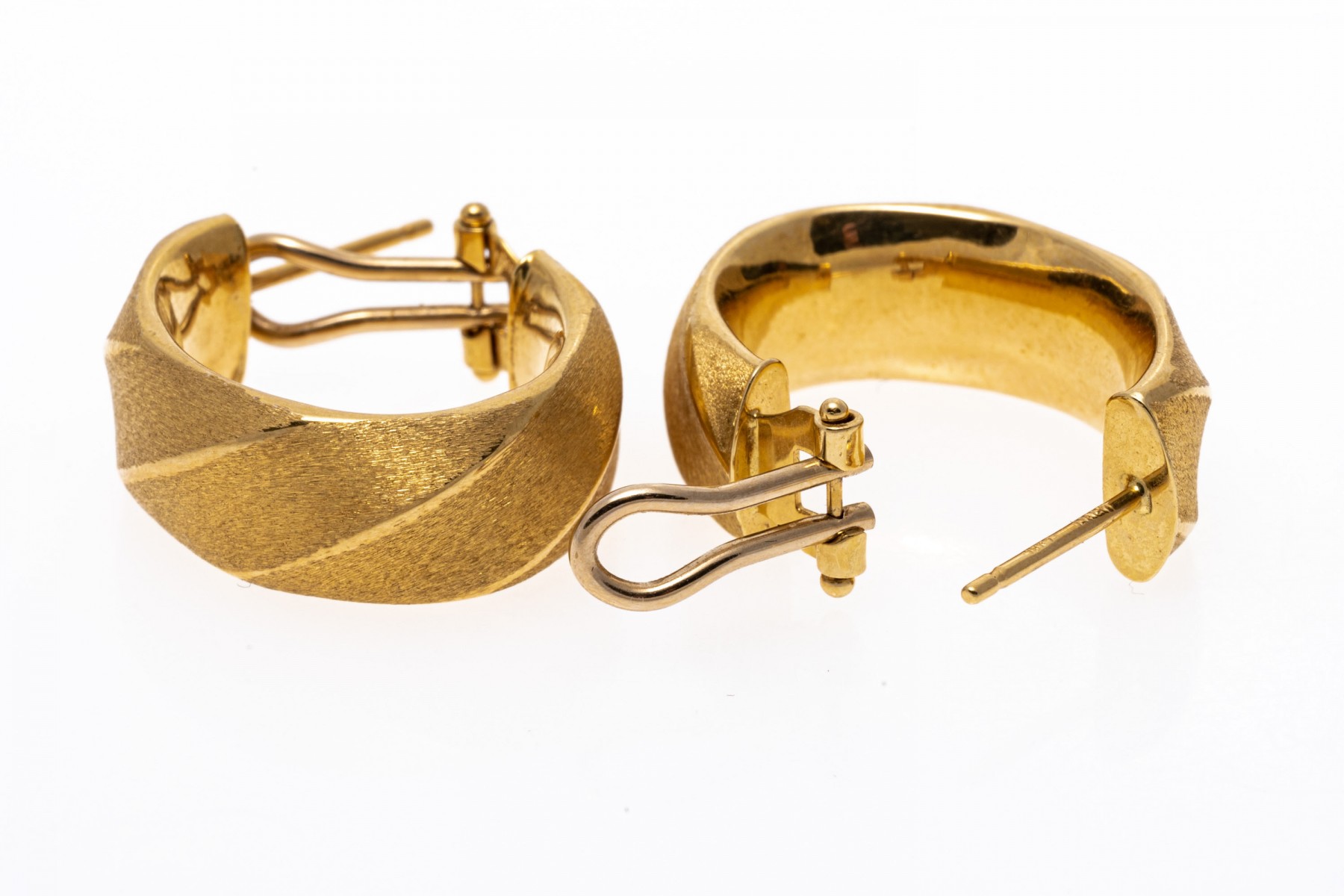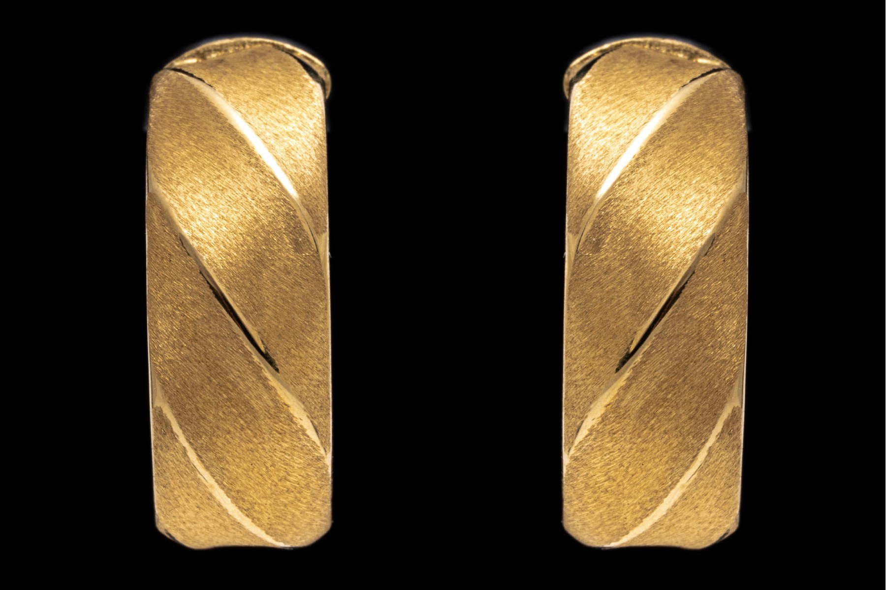 18k yellow gold earrings. These handsome yellow gold earrings are a wide, ribbed motif, decorated with a florentine style finish, punctuated with high polished edges. The earrings have posts, with omega style backs.