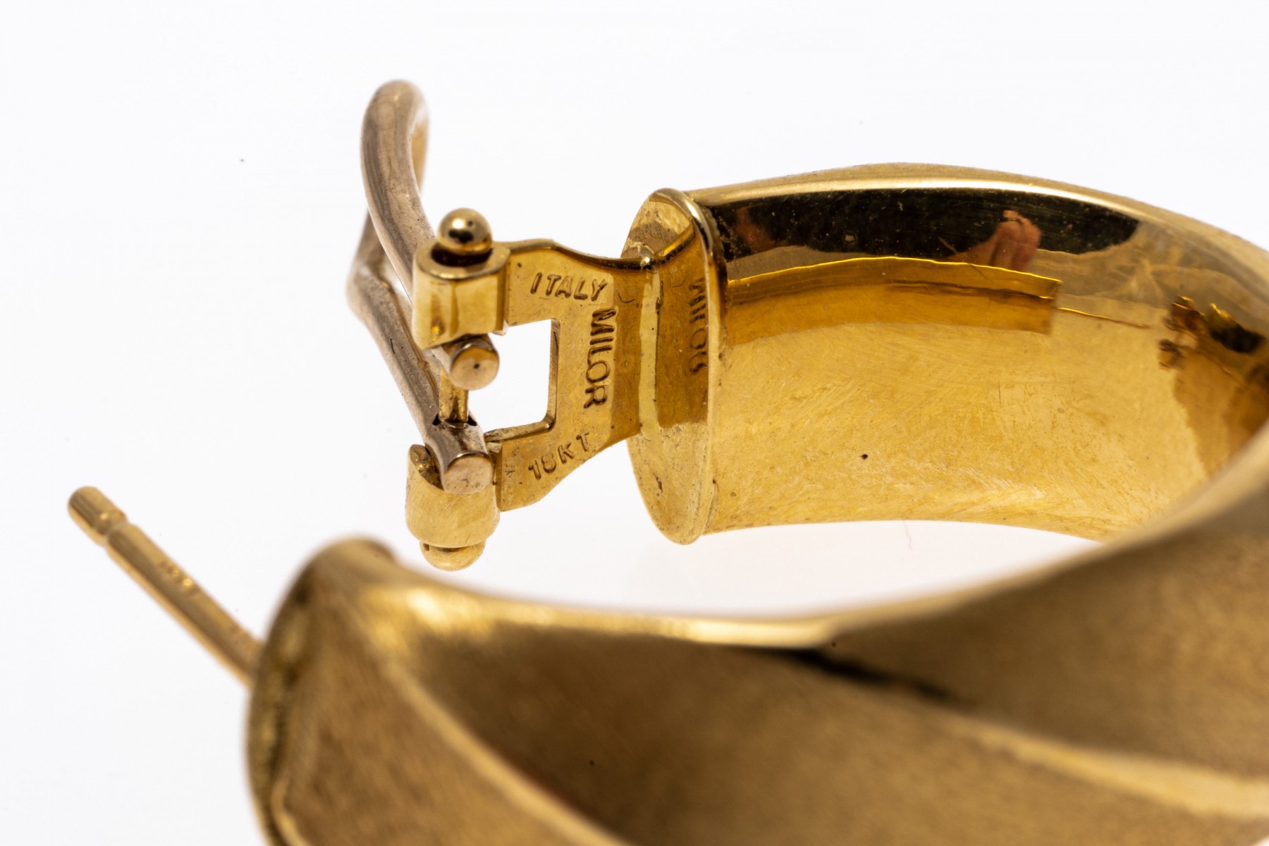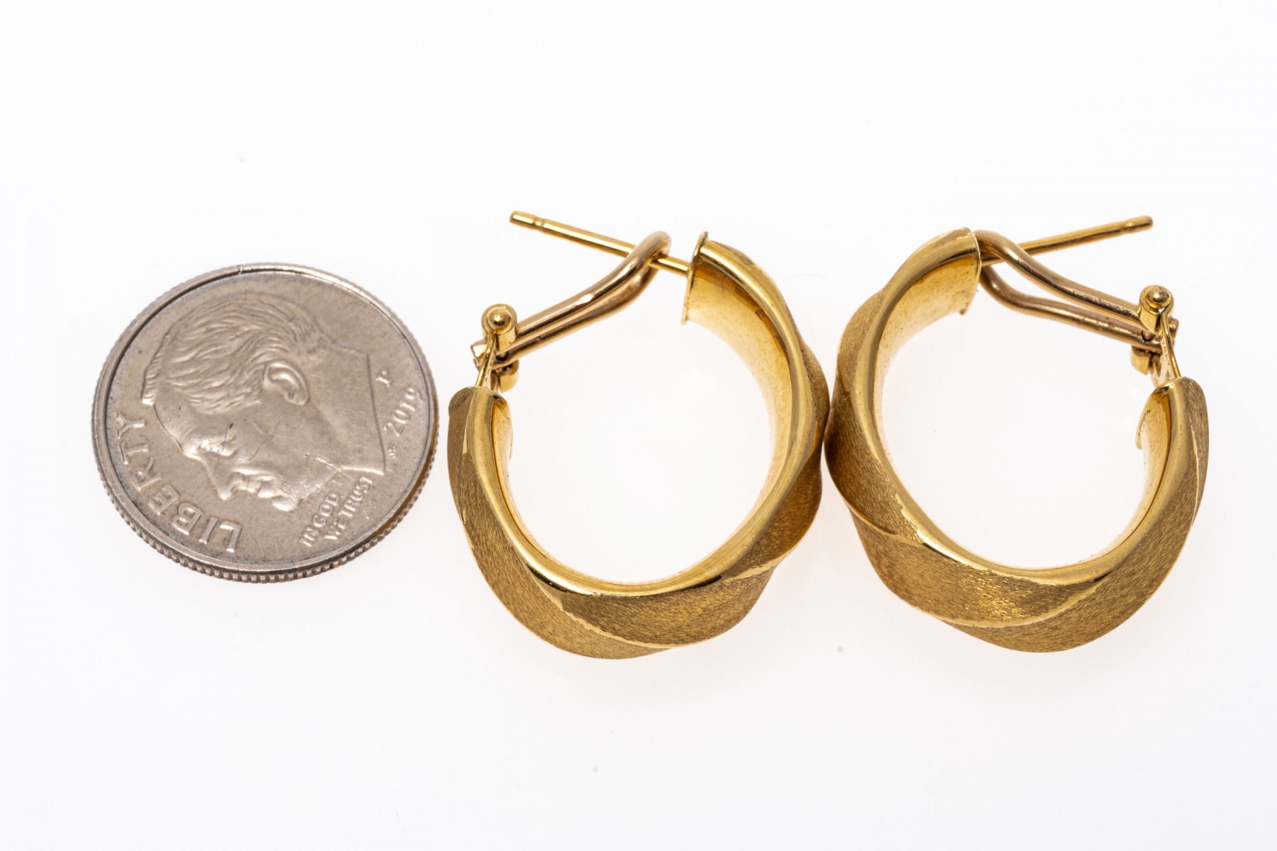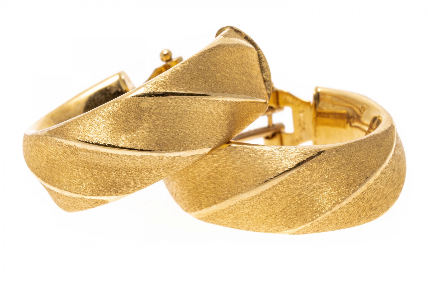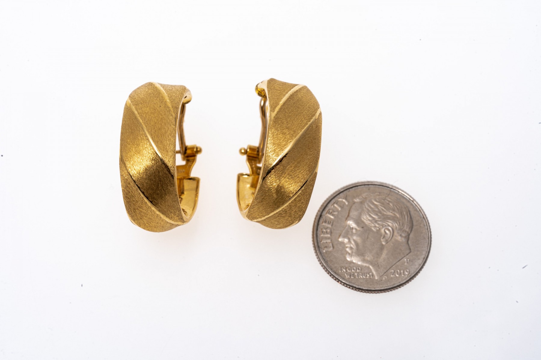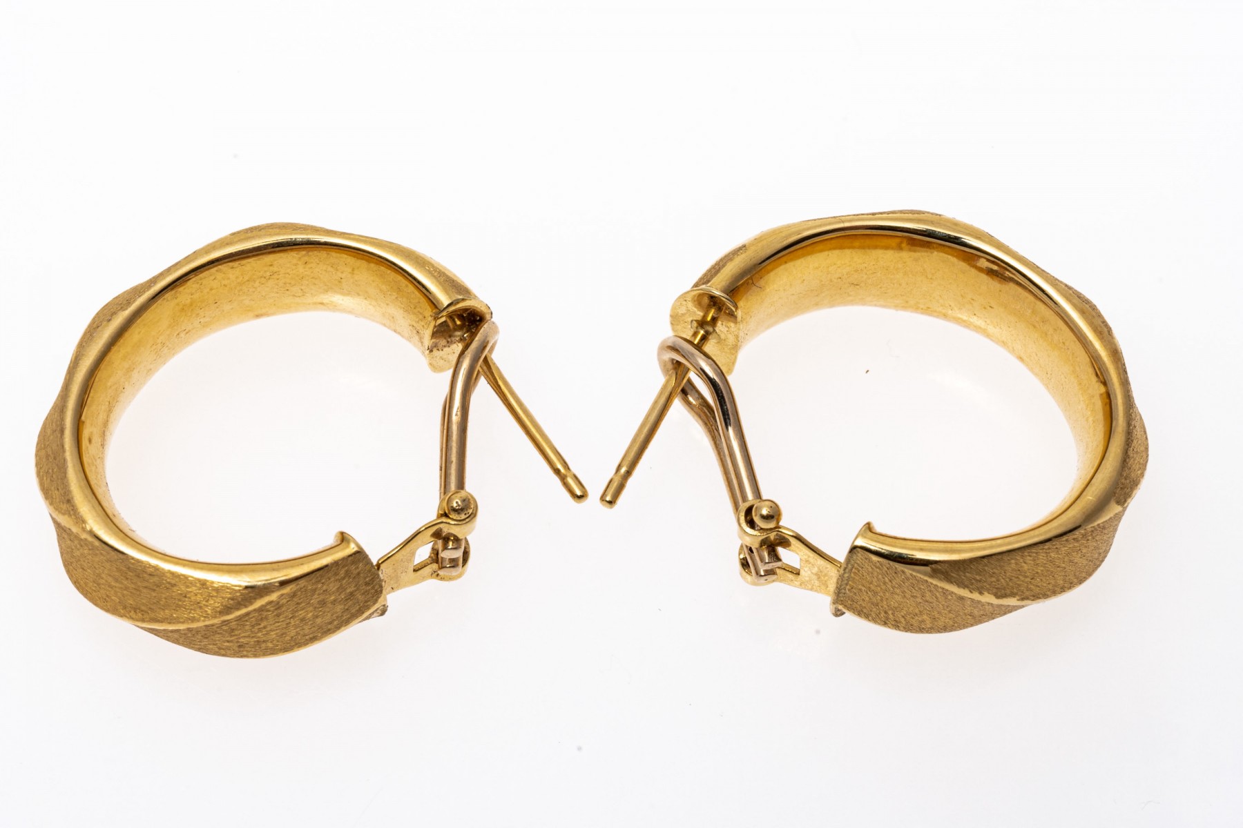 18k yellow gold earrings. These handsome yellow gold earrings are a wide, ribbed motif, decorated with a florentine style finish, punctuated with high polished edges. The earrings have posts, with omega style backs.