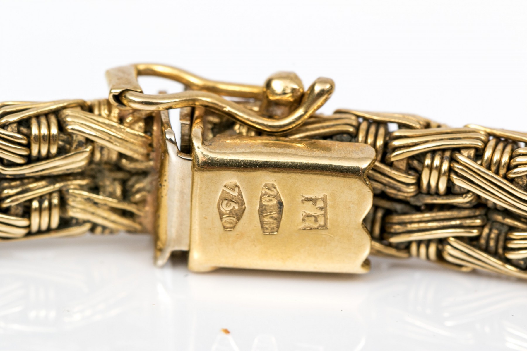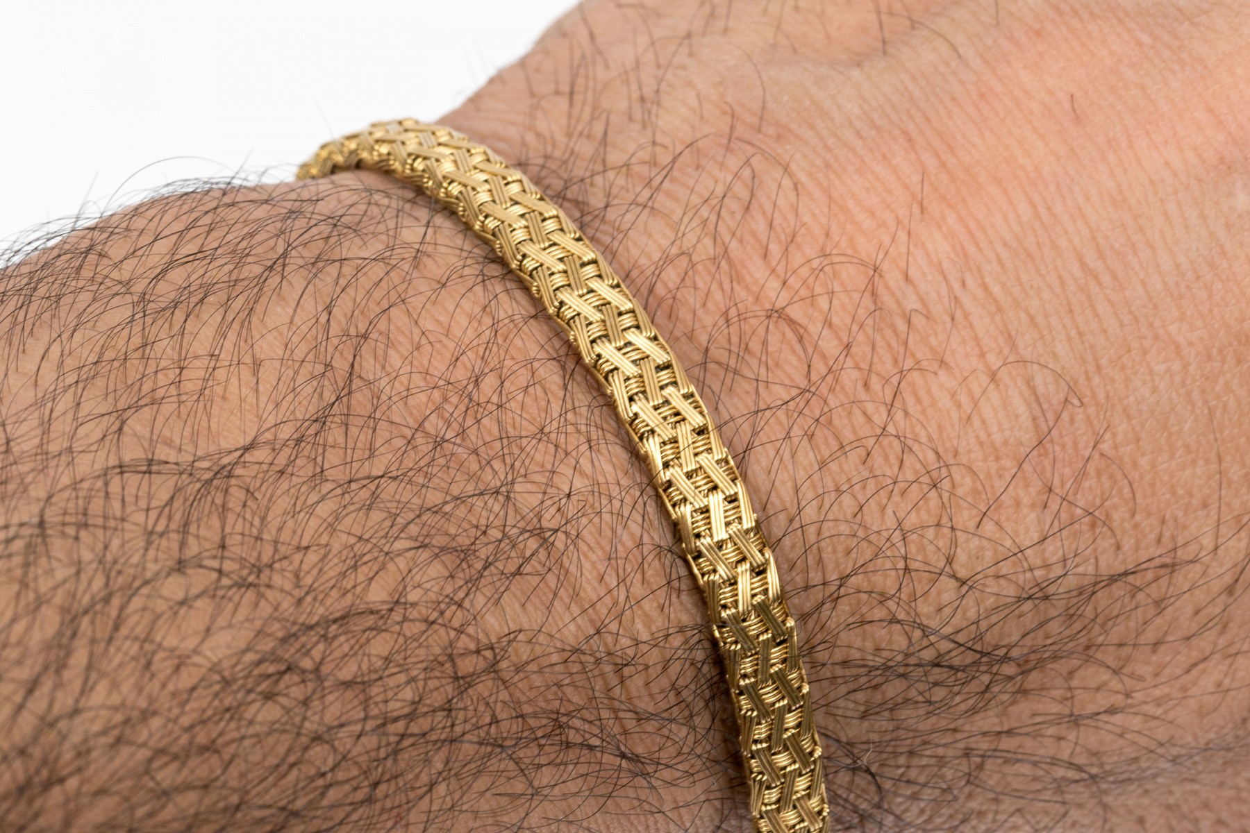 18k yellow gold handsome woven basket weave bracelet, finished with a hidden box style clasp and a figure eight safety