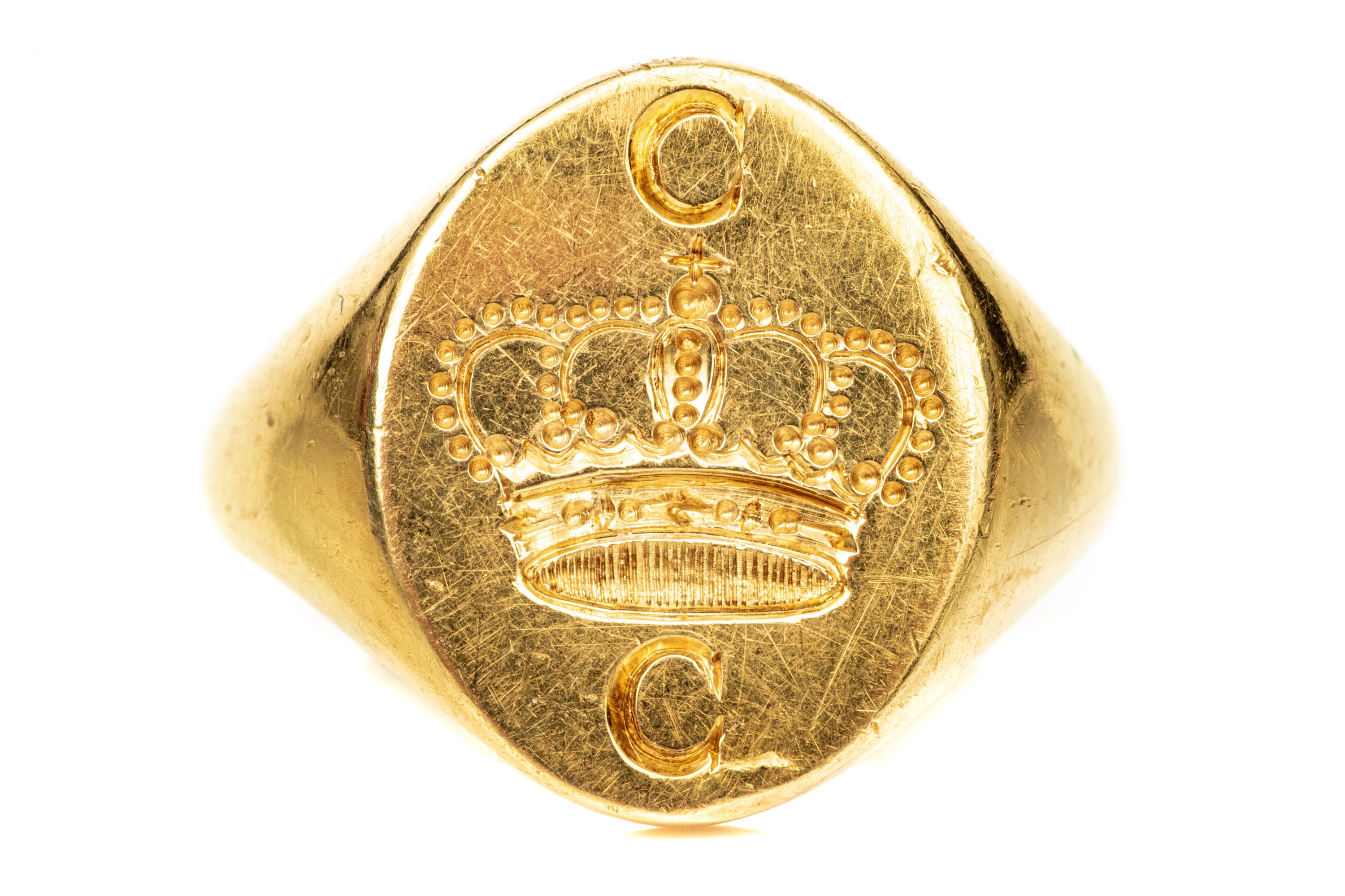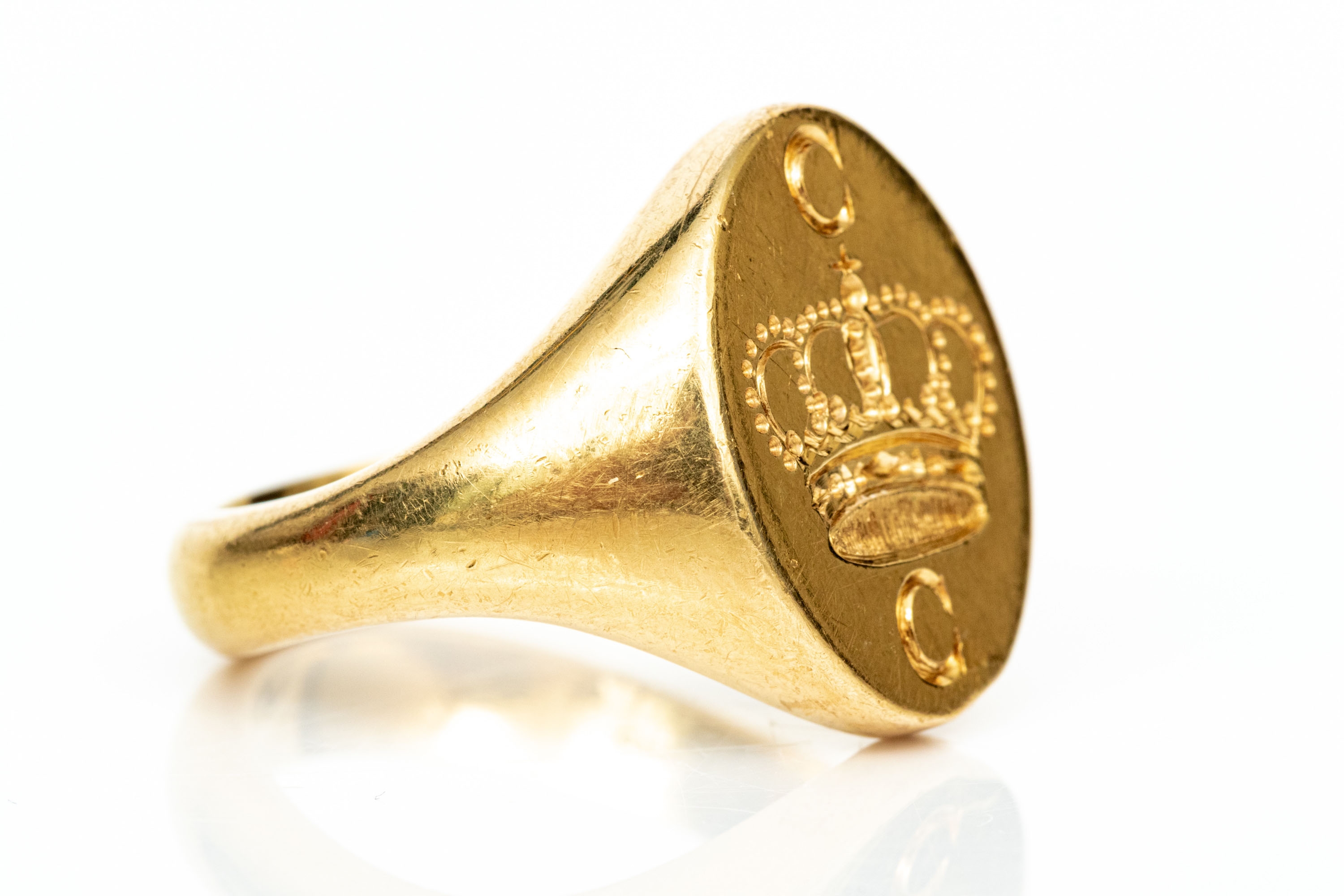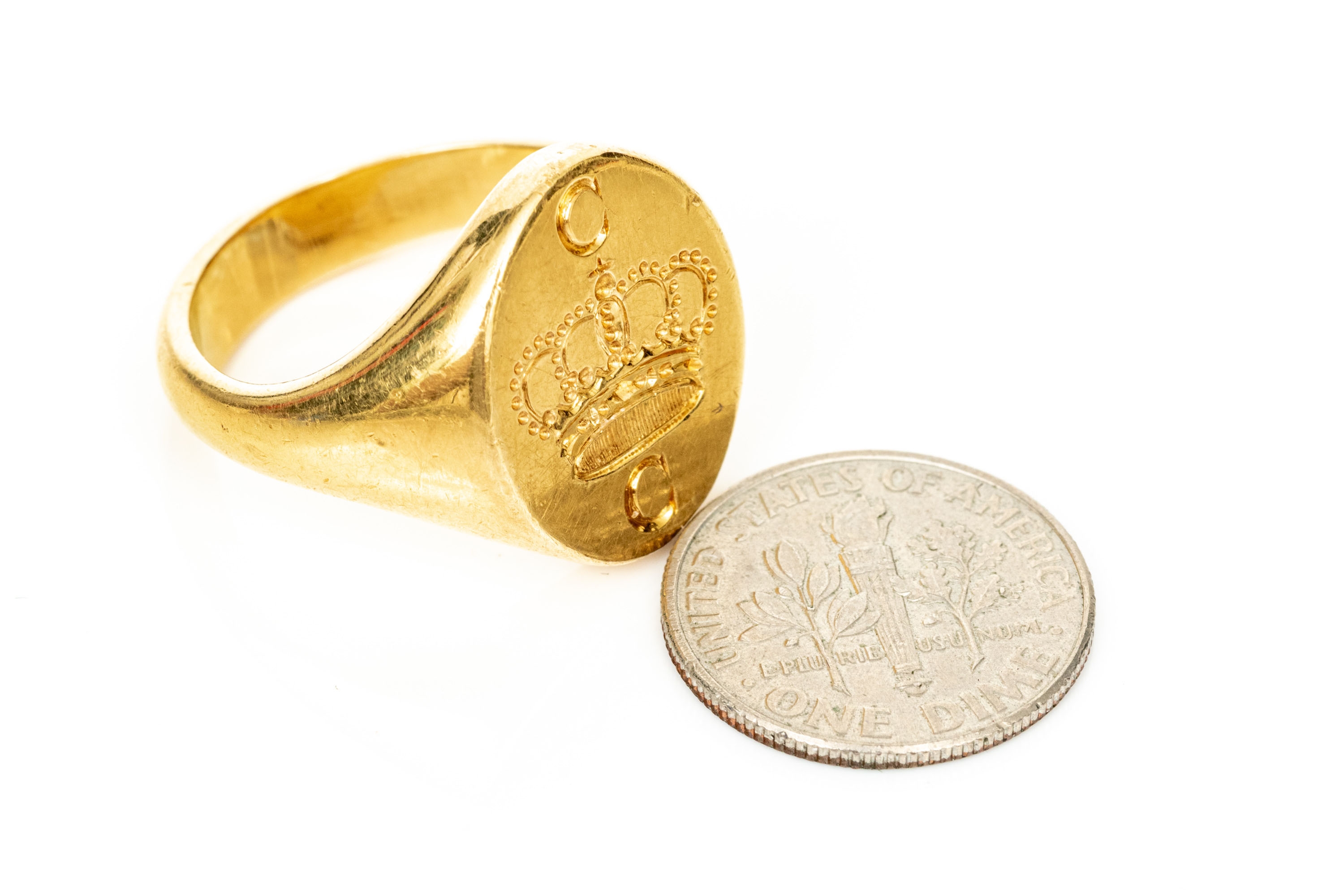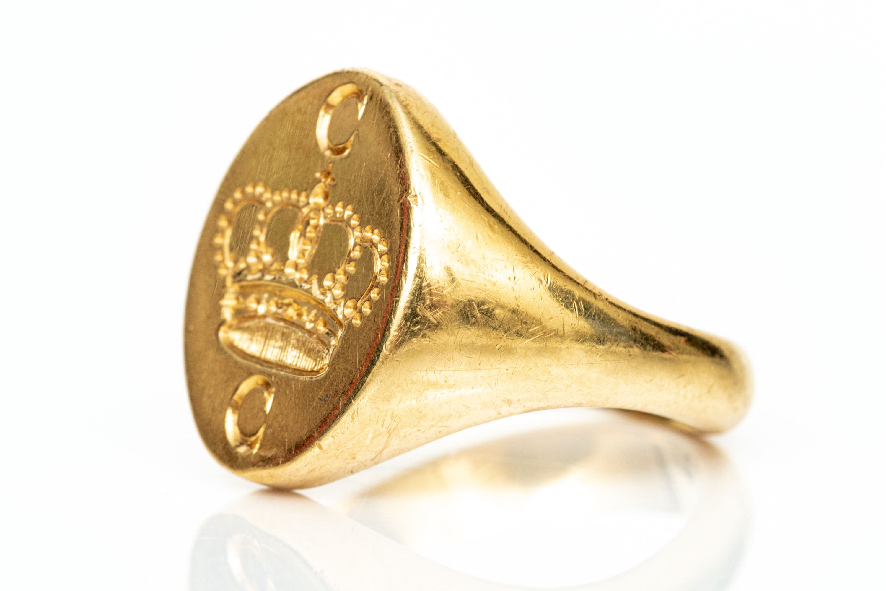 18k yellow gold heavy crown engraved and initialed ring, size 8.25, decorated with the initials CC and an oramental crown (not a heraldic, so it is not symbolic of any specific royal ranking)