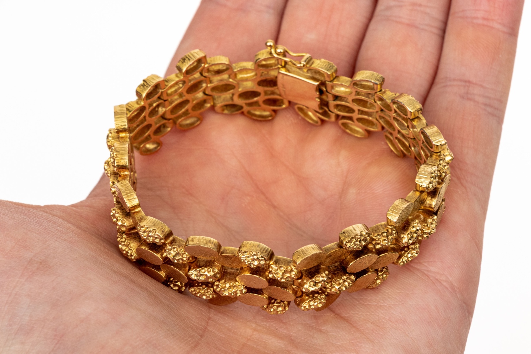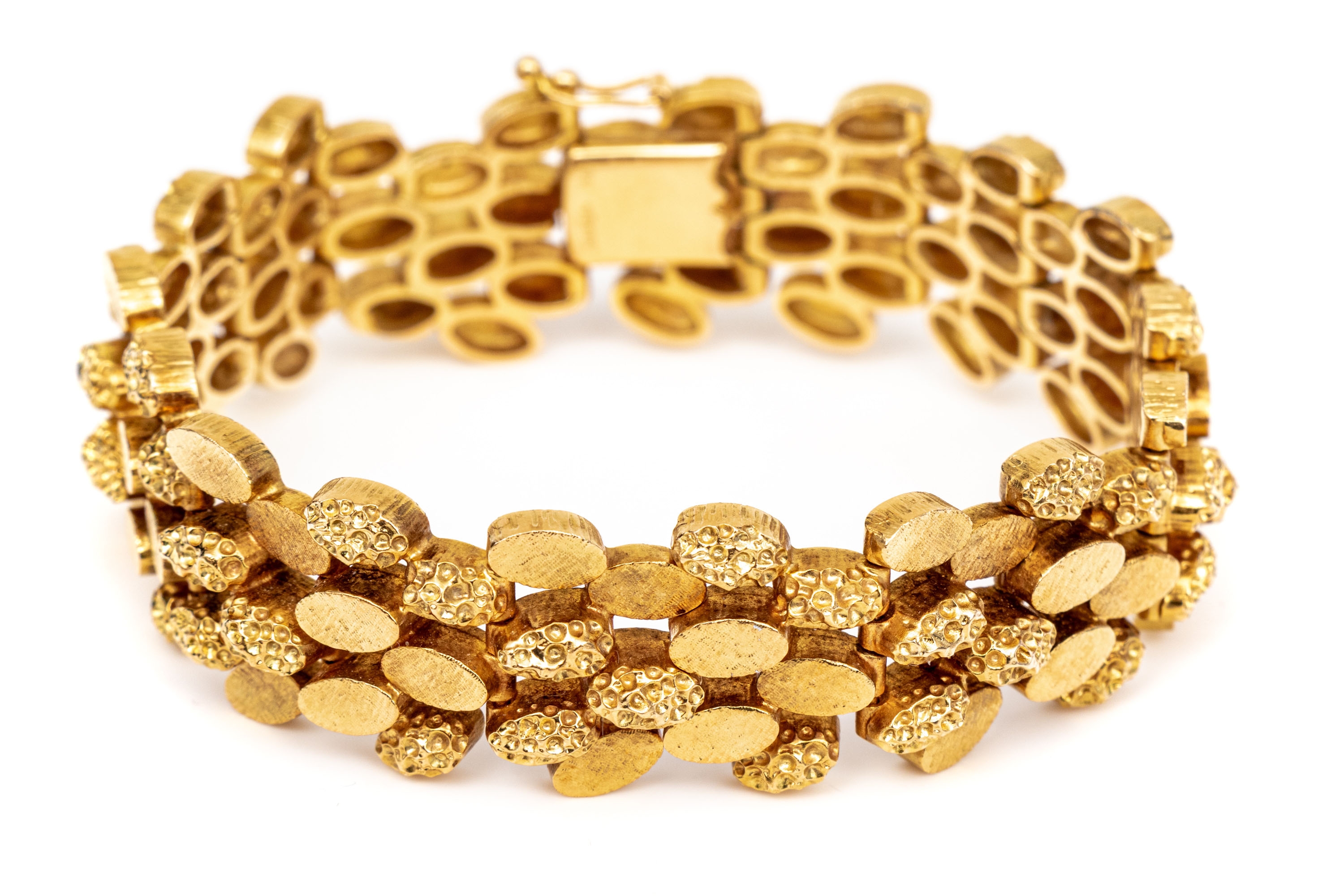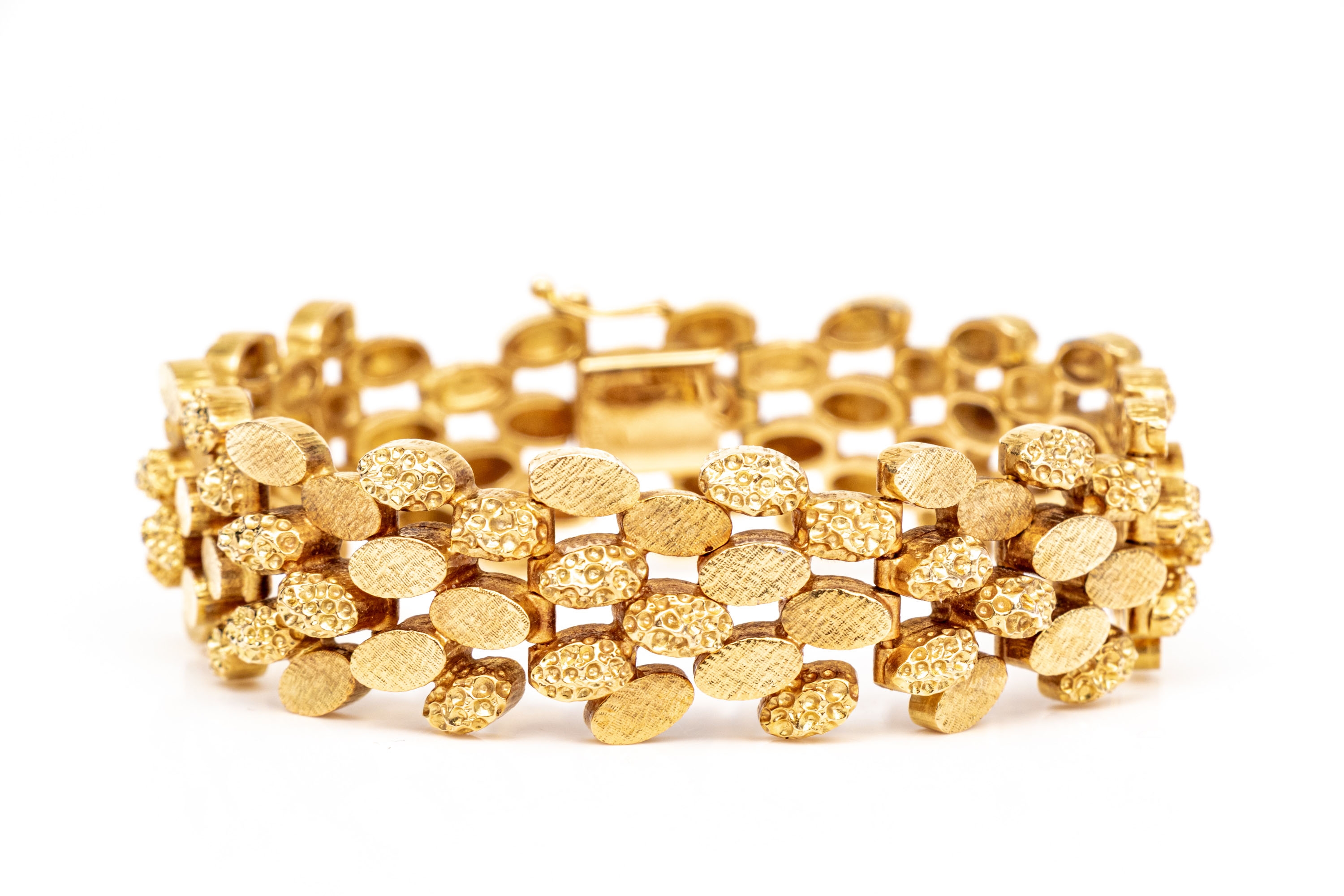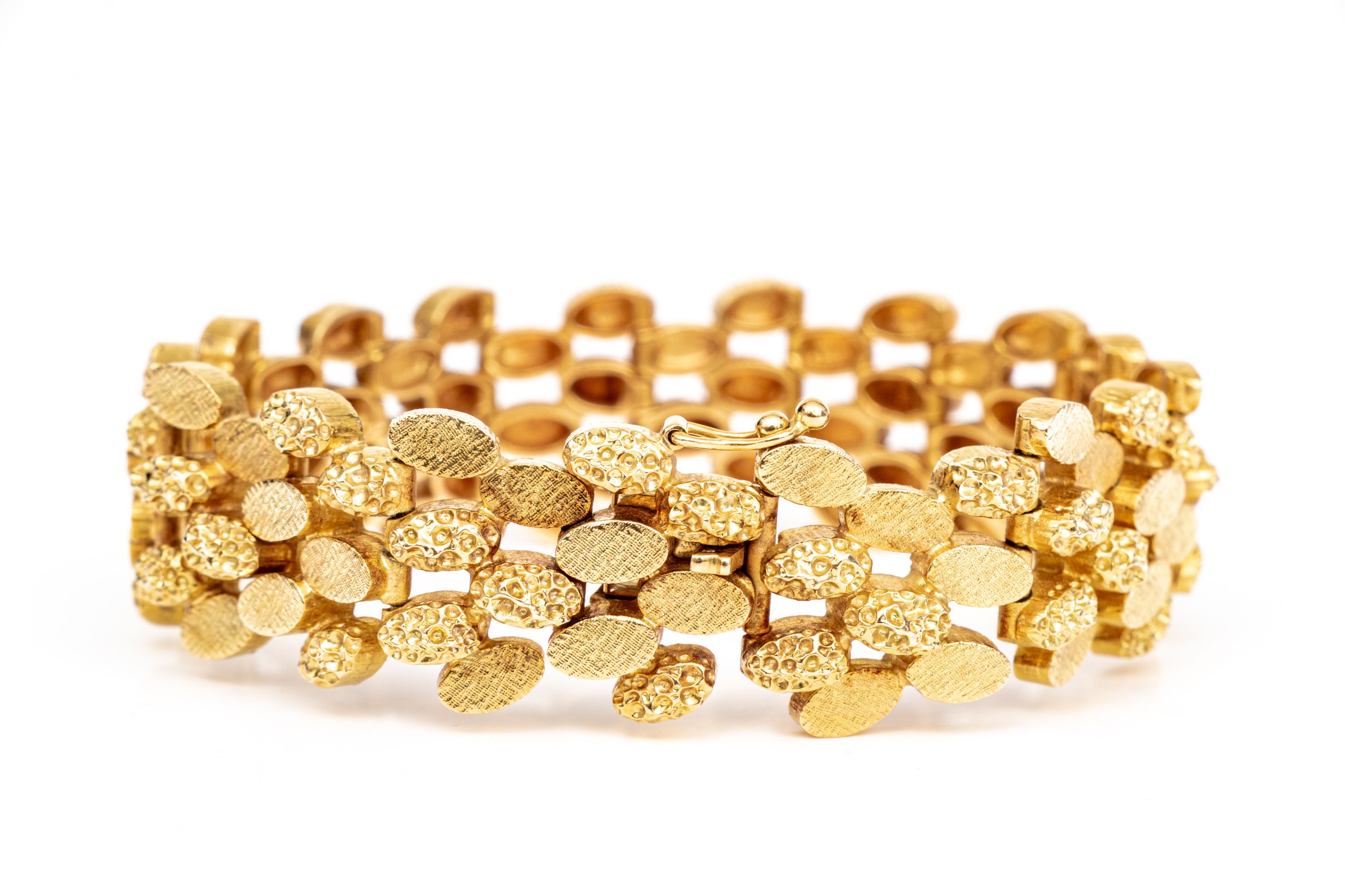 18k yellow gold impactful heavy brutalist textured oval link chevron motif bracelet, finished with a hidden box style clasp and a figure eight style safety. Made pre-1975 when in was imported into England, maker unknown.