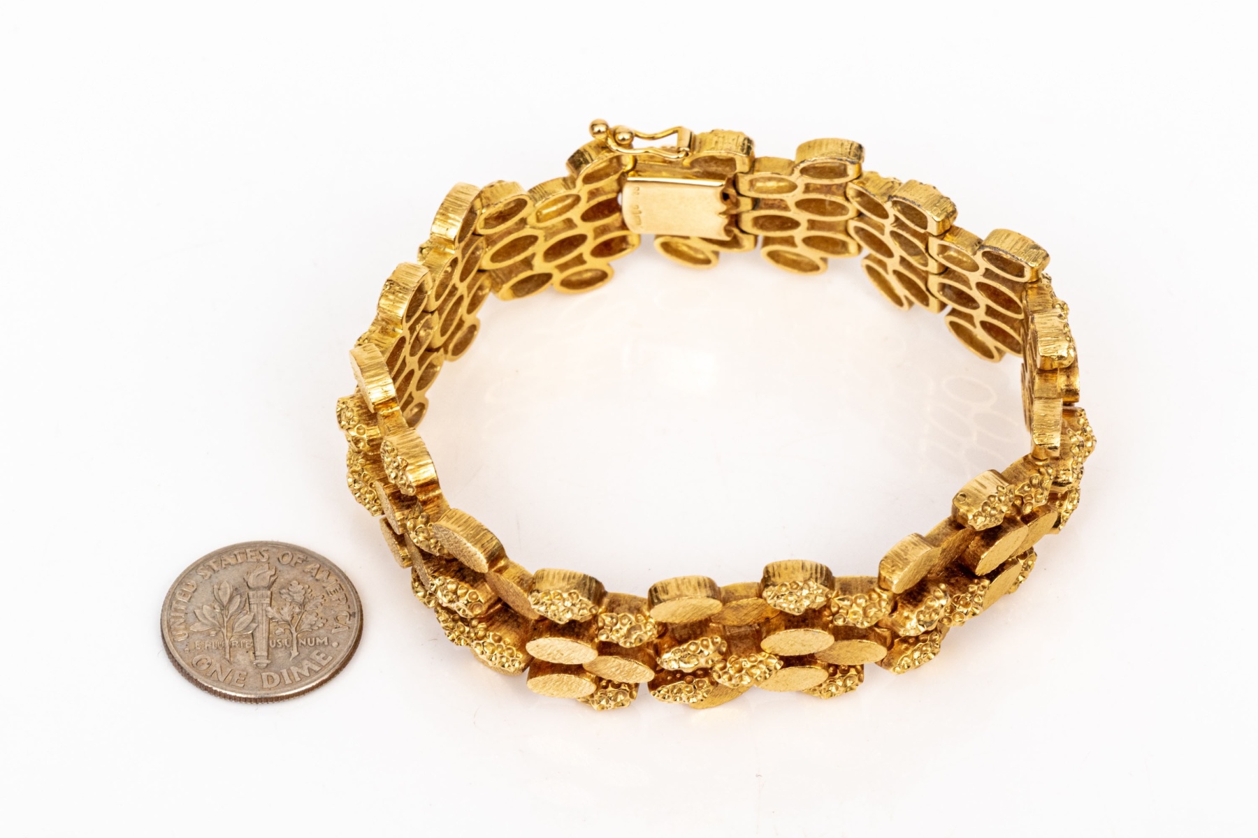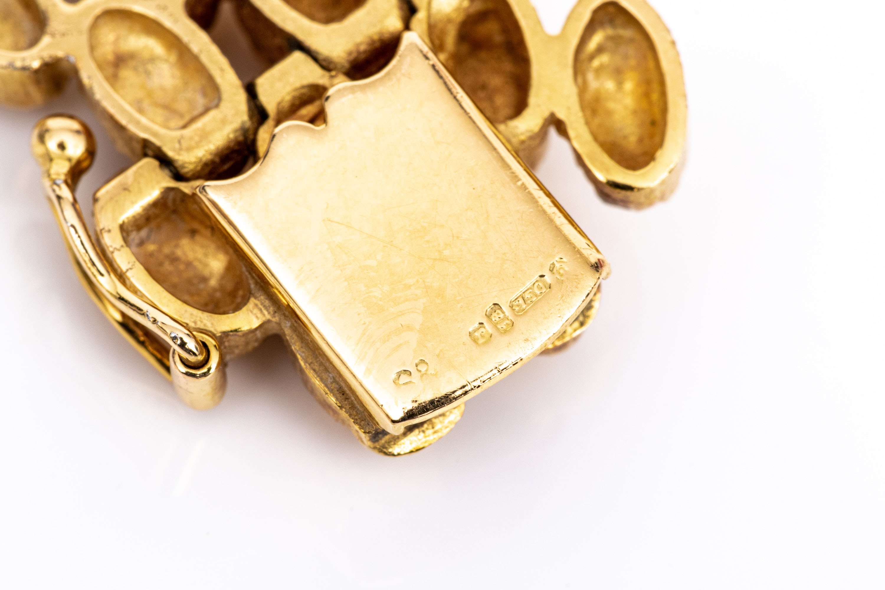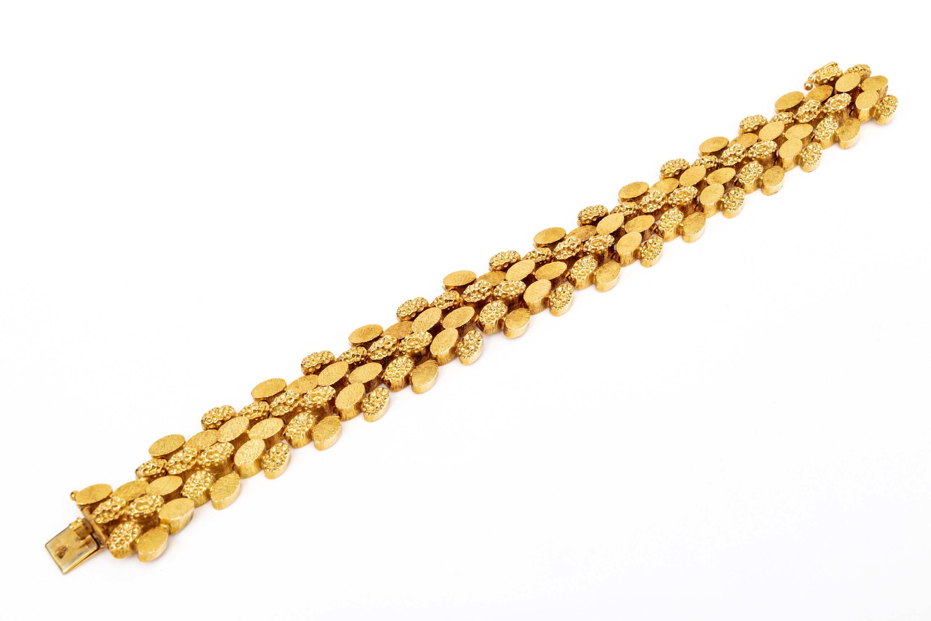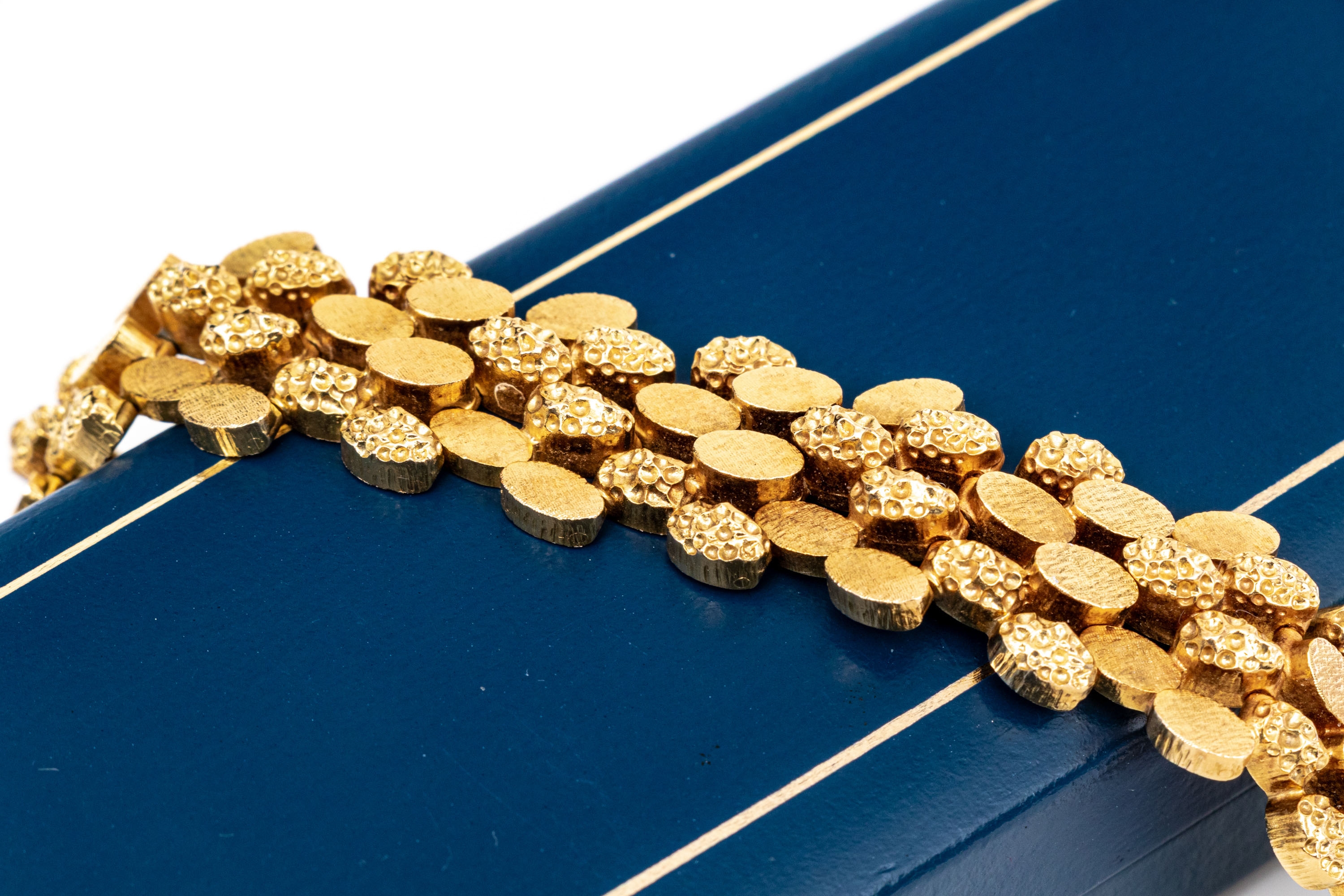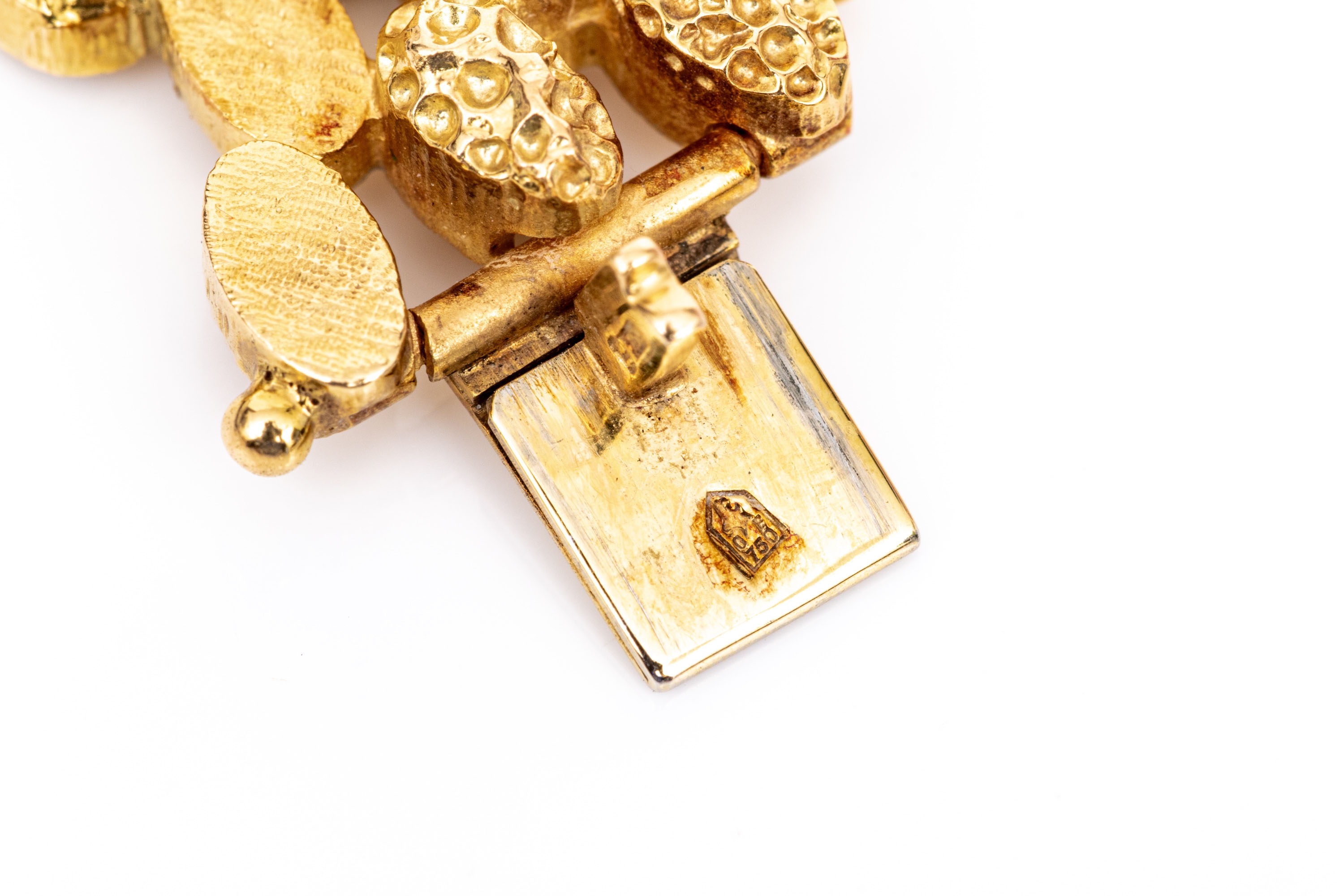 18k yellow gold impactful heavy brutalist textured oval link chevron motif bracelet, finished with a hidden box style clasp and a figure eight style safety. Made pre-1975 when in was imported into England, maker unknown.