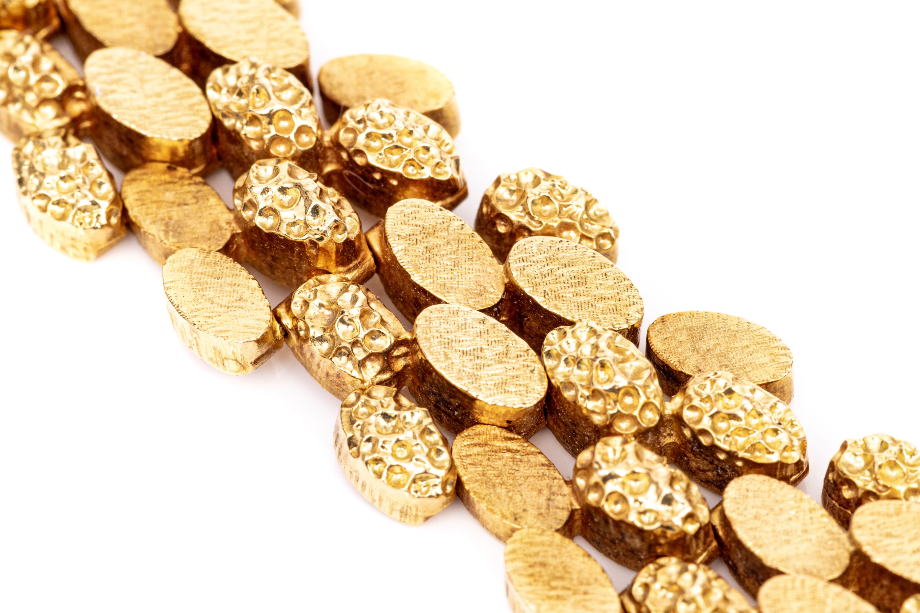18k Yellow Gold Impactful Heavy Brutalist Textured Oval Link Chevron Motif Bracelet #448910. Black Rock Galleries provides high end estate liquidation services through online estate auctions and a 50,000 sq ft designer showroom. estate liquidator, estate sale, online auction, antiques, fine art, liquidation, clean outs, auction, consignment, interior design, fine jewelry, collectibles, appraisals, estate appraisals, estate services, decor, furniture, furniture consignment, antique center, consignment shop. We offer appraisal services and specialize in fine art, jewelry, antiques and decorative arts. Sell with us. Black Rock Galleries is the tri-state's largest estate liquidator serving New England and the greater New York City area. We are the trusted source for expert appraisals, auction services, estate sales, and consignments. Black Rock Galleries is the east coast's largest and most trusted estate liquidator, with locations in Connecticut, greater Boston, MA and Raleigh, NC, Fairfield, Southport, Apex, TX. We are the best source for expert appraisals, auction services, estate sales and consignments. We have served thousands of families and estates with compassion, professionalism and expertise. BRG works with attorneys, executors, realtors and families to bring the greatest return on personal and estate property in the current market. Our unique combination of services make us the easy choice to get the job done in a timely and stress-free manner. We are with you from the initial consultation to the final clean out. Our house-built online auction software platform offers clients a dynamic approach to liquidating their personal property. This venue is most successful in bringing the best return with the least amount of disruption for our clients. See our services page for a complete description of this offering. 18k Yellow Gold Impactful Heavy Brutalist Textured Oval Link Chevron Motif Bracelet #448910
