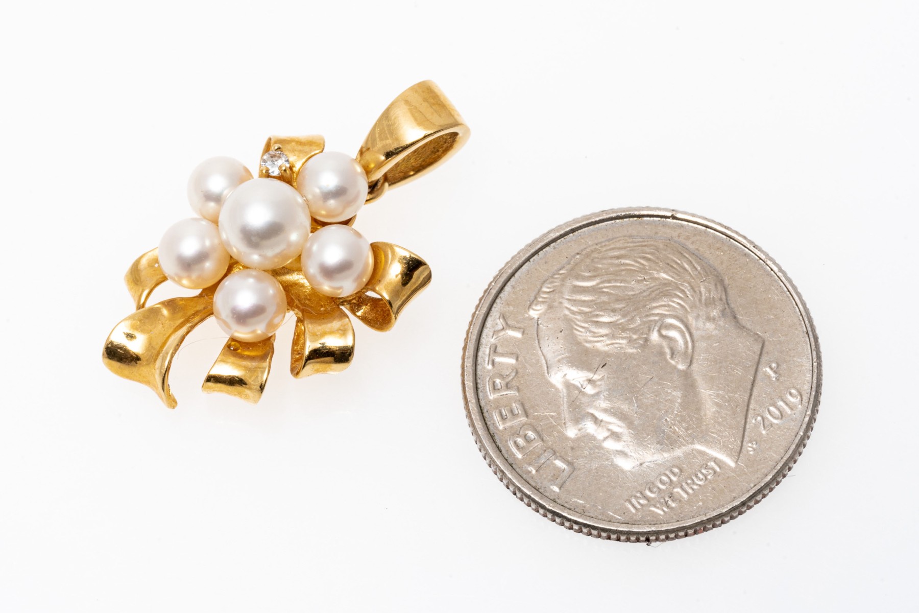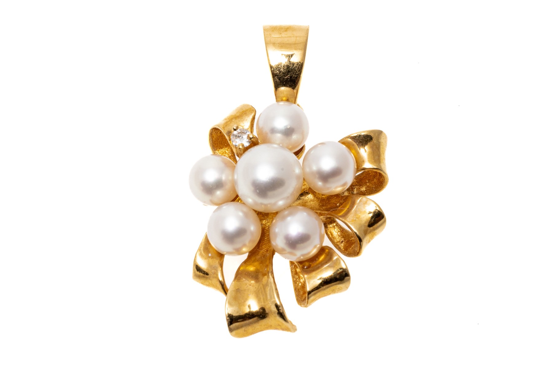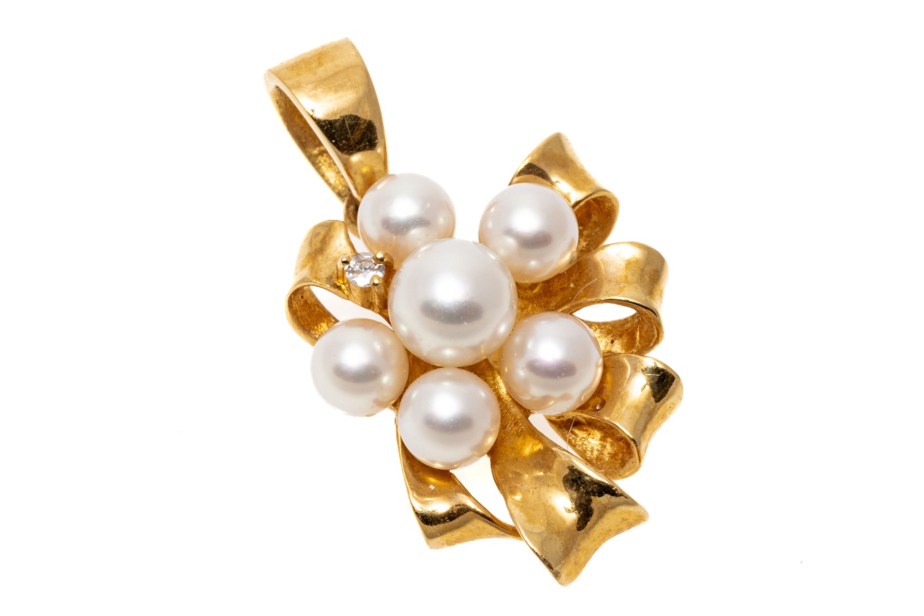 18k yellow gold lovely cultured pearl and ribbon motif pendant, decorated with a round faceted diamond, approximately 0.01 CTS, prong set, finished with a solid bale